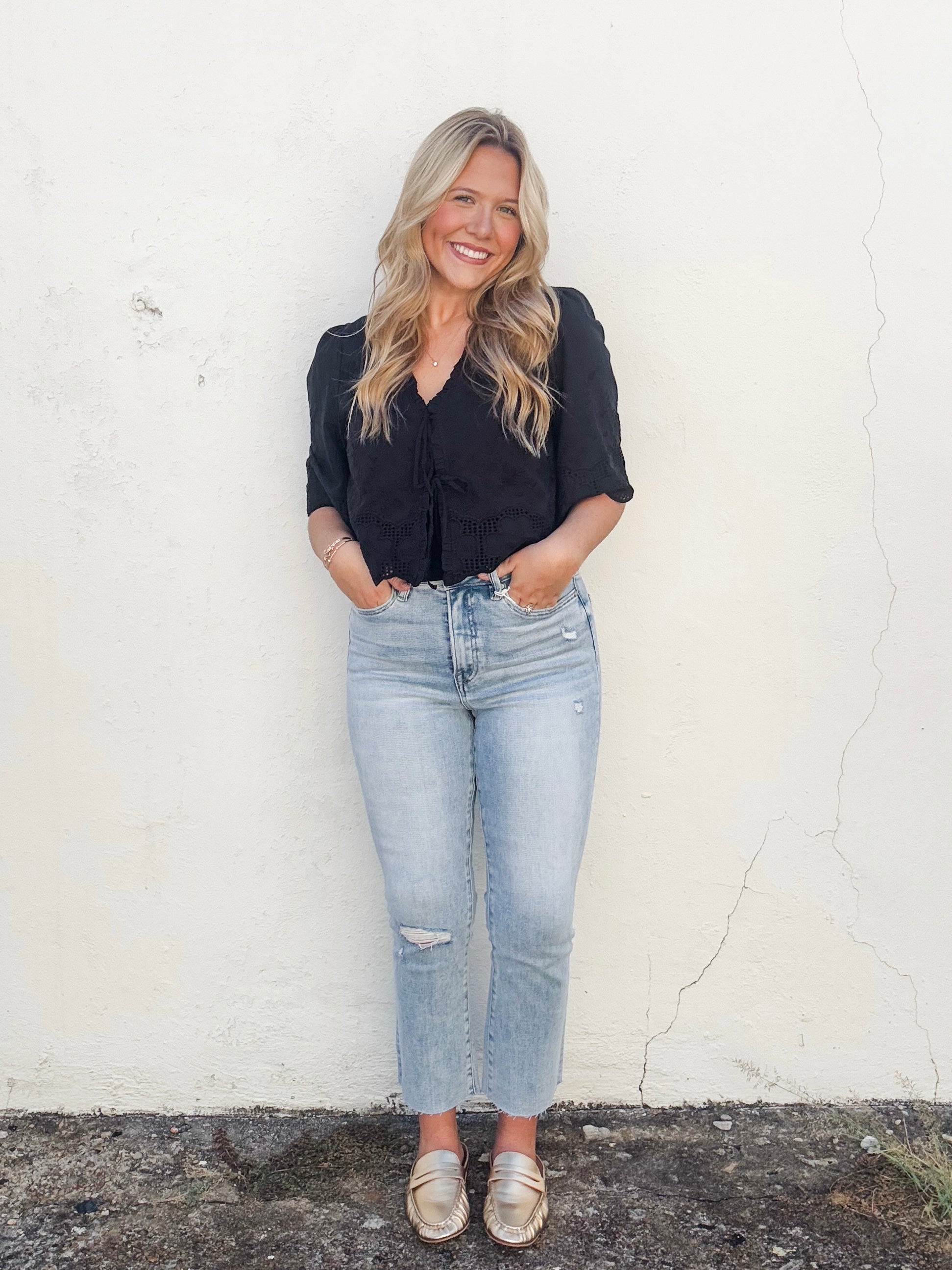 The Black Beauty Top combines delicate floral embroidery with a scalloped edge for a refined, feminine look. Its tie-front design and 3/4 flutter sleeves add playful elegance, while the relaxed fit ensures all-day comfort. Perfect for effortlessly stylish occasions, this blouse brings charm and ease to your wardrobe.