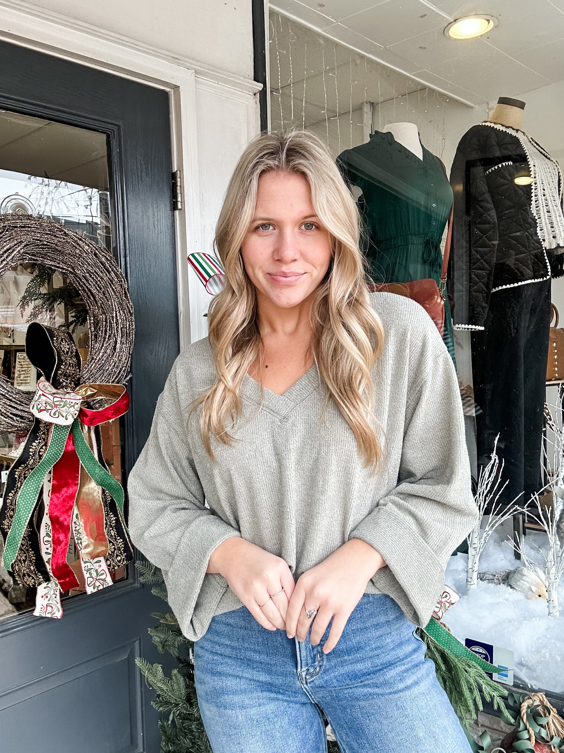 The sage color Blakely Pullover Top is a Knit/Poly, Rayon, Span Ribbed, V-Neck, loose Long Sleeves with rolled cuffs, and side slits.