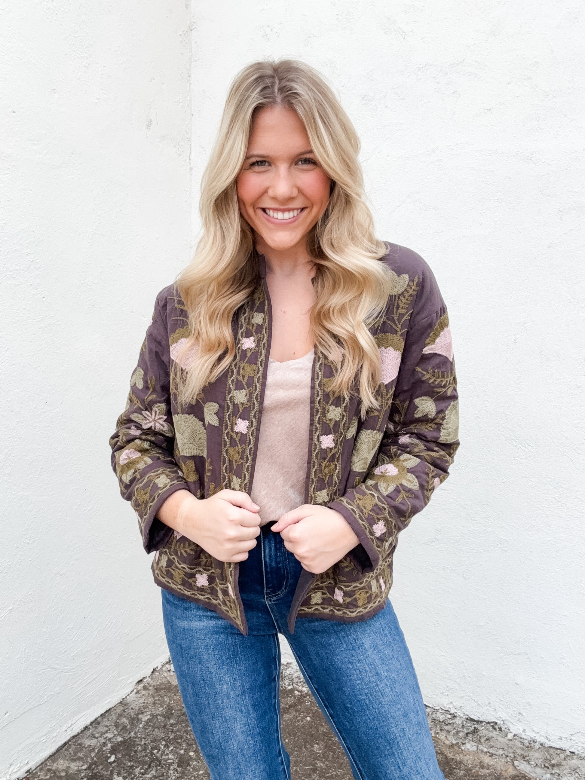 Indulge in the beauty of nature with our Bloom With Me Jacket. Crafted from high-quality cotton slub, this jacket features a stunning floral print in charcoal. Stay stylish and cozy with this versatile piece. Elevate any outfit with a touch of botanical charm!