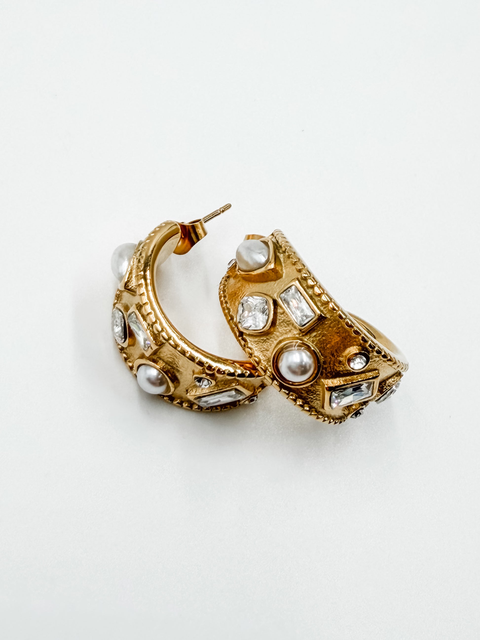 Elevate your everyday look with the Cairo Hoops, a stunning blend of timeless elegance and modern edge. These gold hoops feature intricate geometric rhinestone detailing paired with lustrous pearls, creating a sophisticated sparkle that catches the light beautifully. Perfect for layering or wearing solo, these versatile earrings transition seamlessly from day to night, adding a touch of glamour to any outfit.