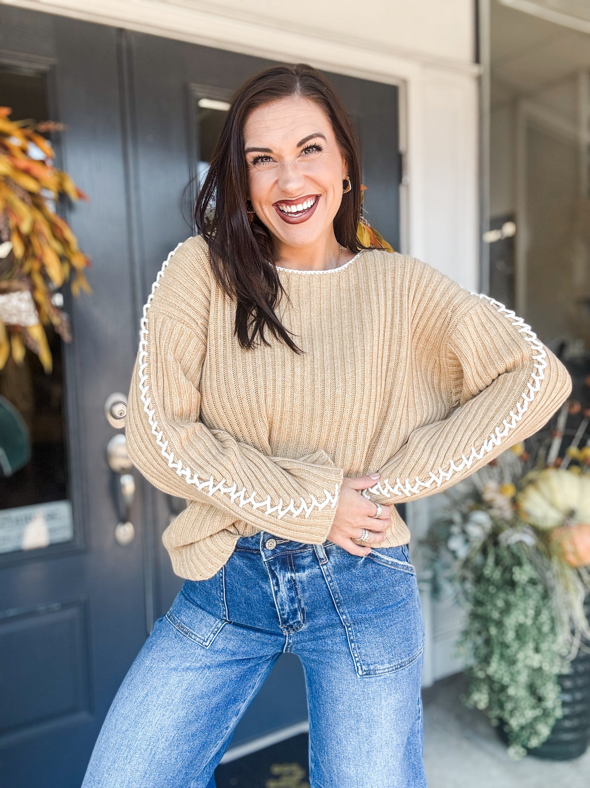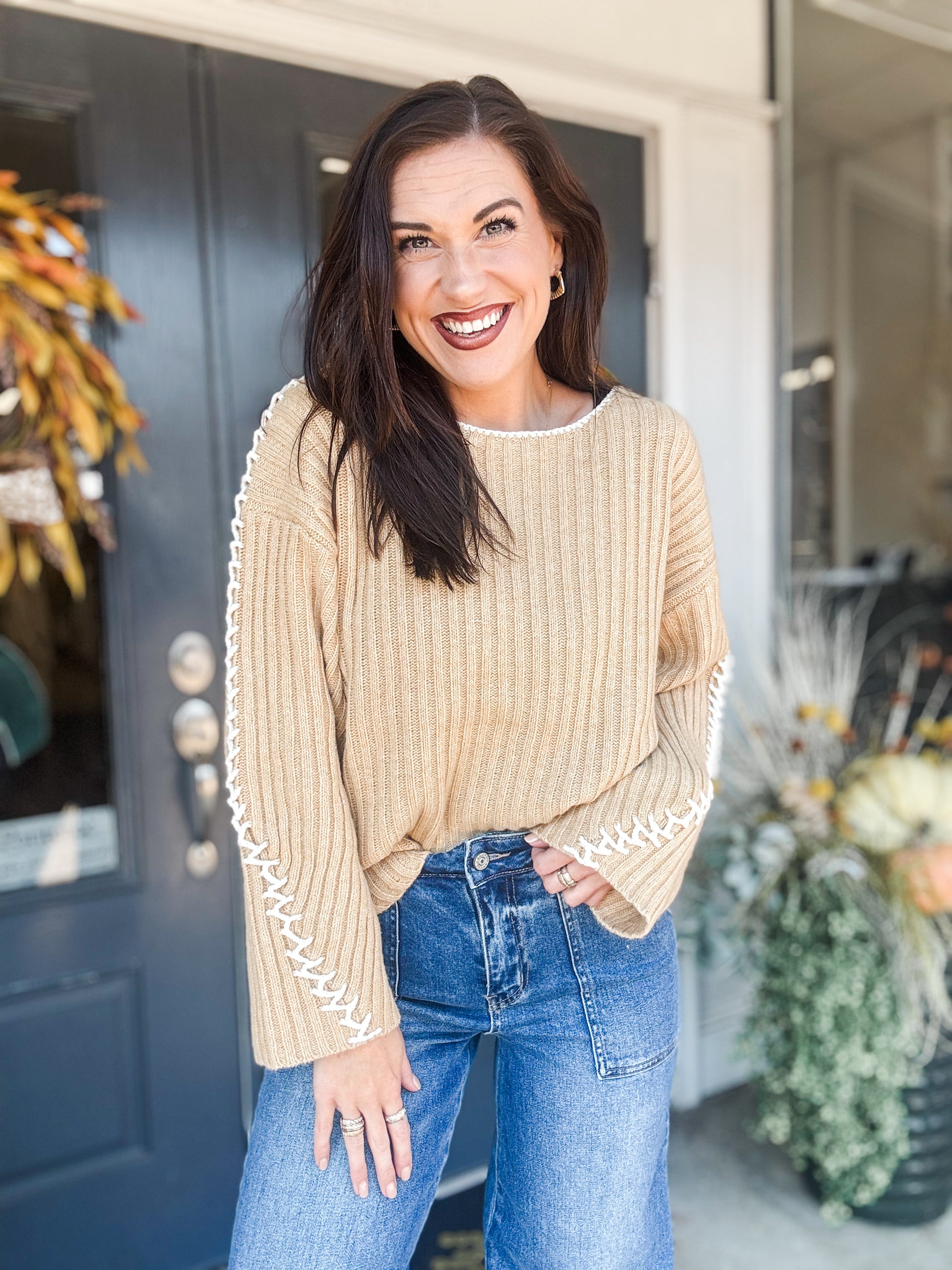 Call it Fate Sweater is a dusty mustard colored, Wool/Nylon, Round Neck, Long Sleeve Top With Embroidery Detail.