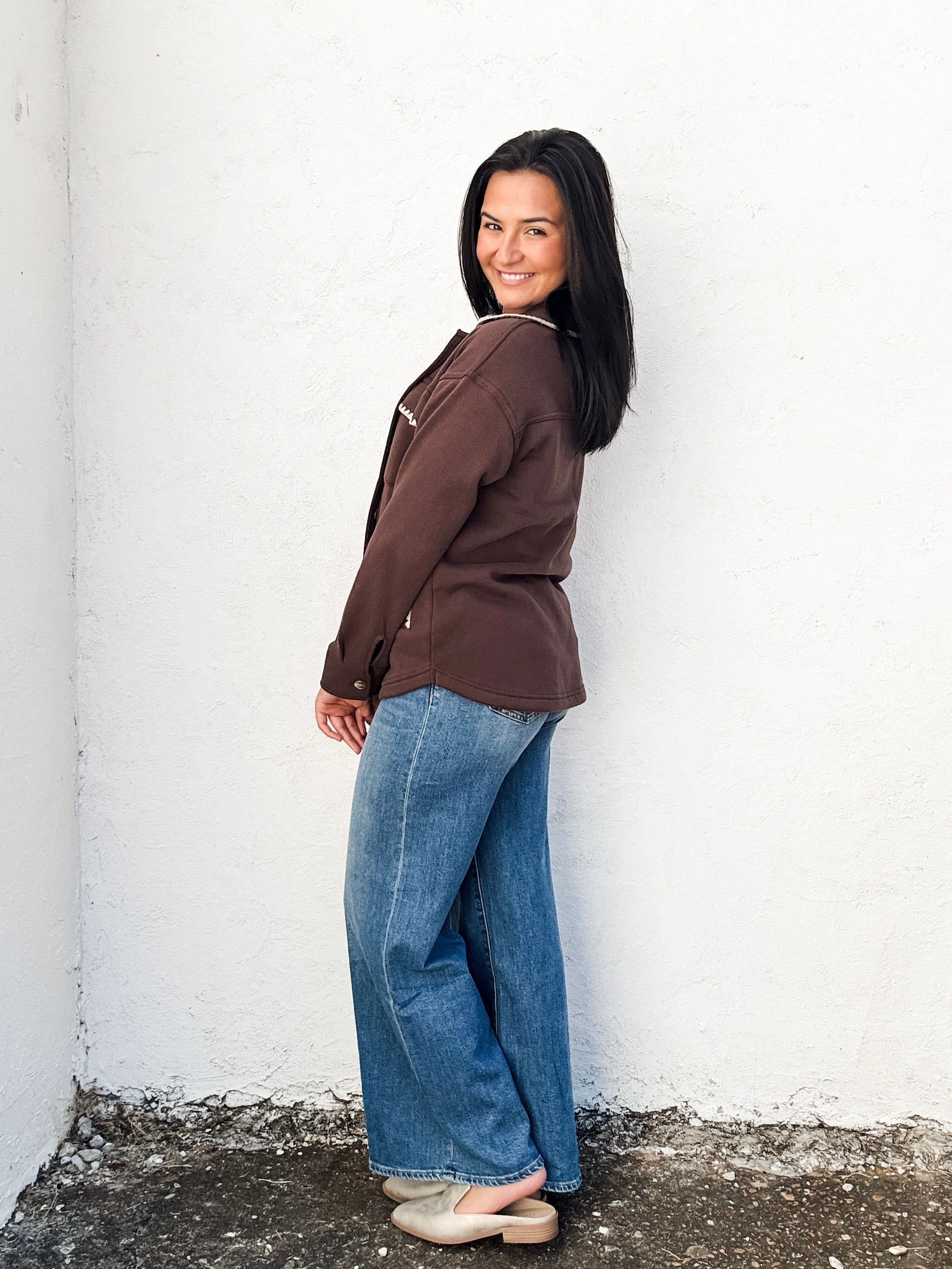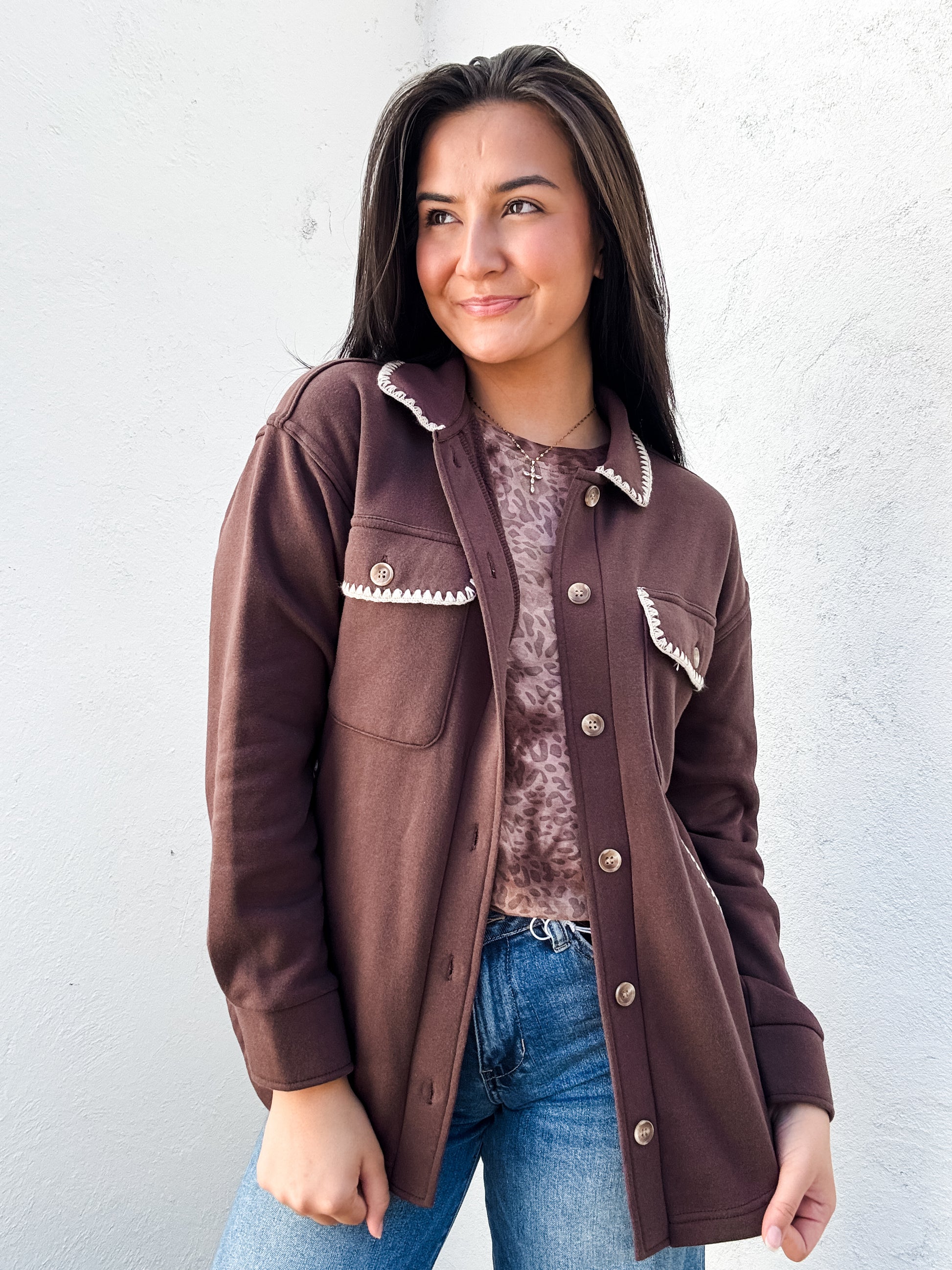 Elevate your wardrobe with the Carmine Jacket, crafted in a rich dark chocolate color with subtle taupe stitching that highlights the pockets and collar. Featuring a button-down front and a total of four functional front pockets—two traditional and two slit—this jacket offers both style and practicality. Its tailored design ensures a polished look perfect for any occasion.