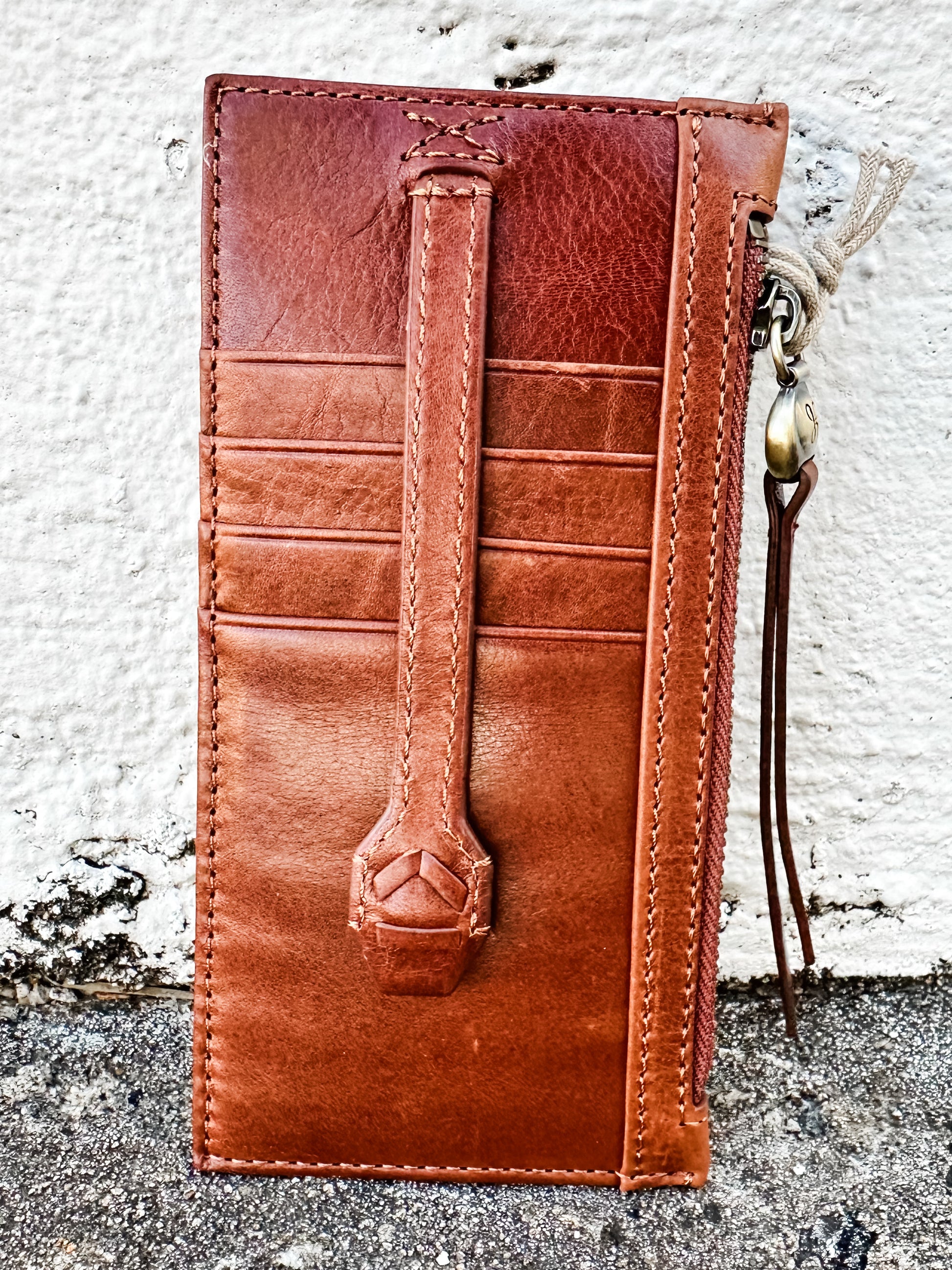 Meet Carte Card Case in Pecan Ridge—a slim, stylish way to carry your essentials with a twist! Its sleek silhouette hides a zip pocket perfect for cash, receipts, or little treasures. With 11 credit card slots spread across front and back plus an ID window, organization has never been this fun. Finished with warm sandalwood lining and chic Old English brass hardware, it’s the playful companion your pockets have been waiting for.