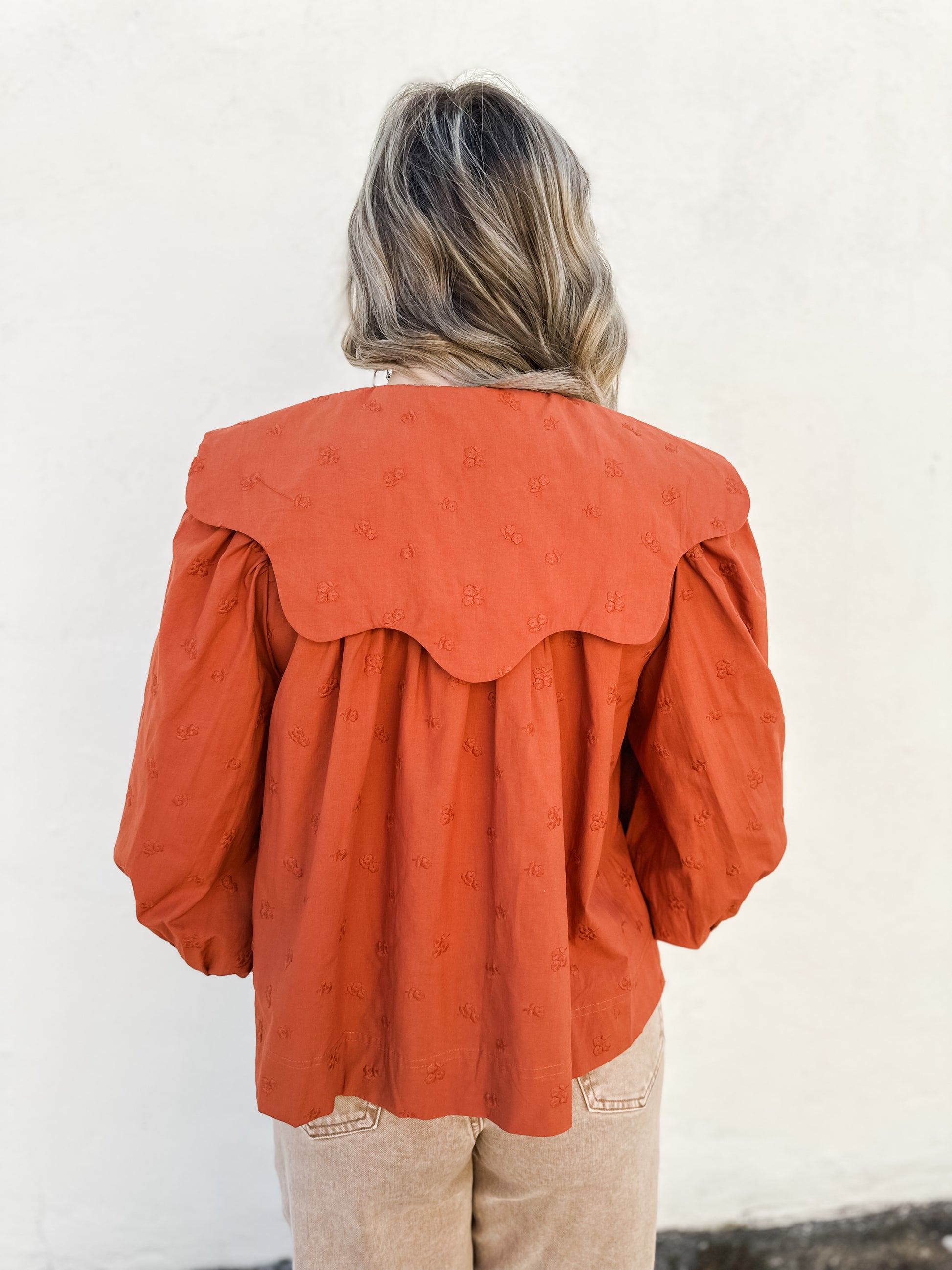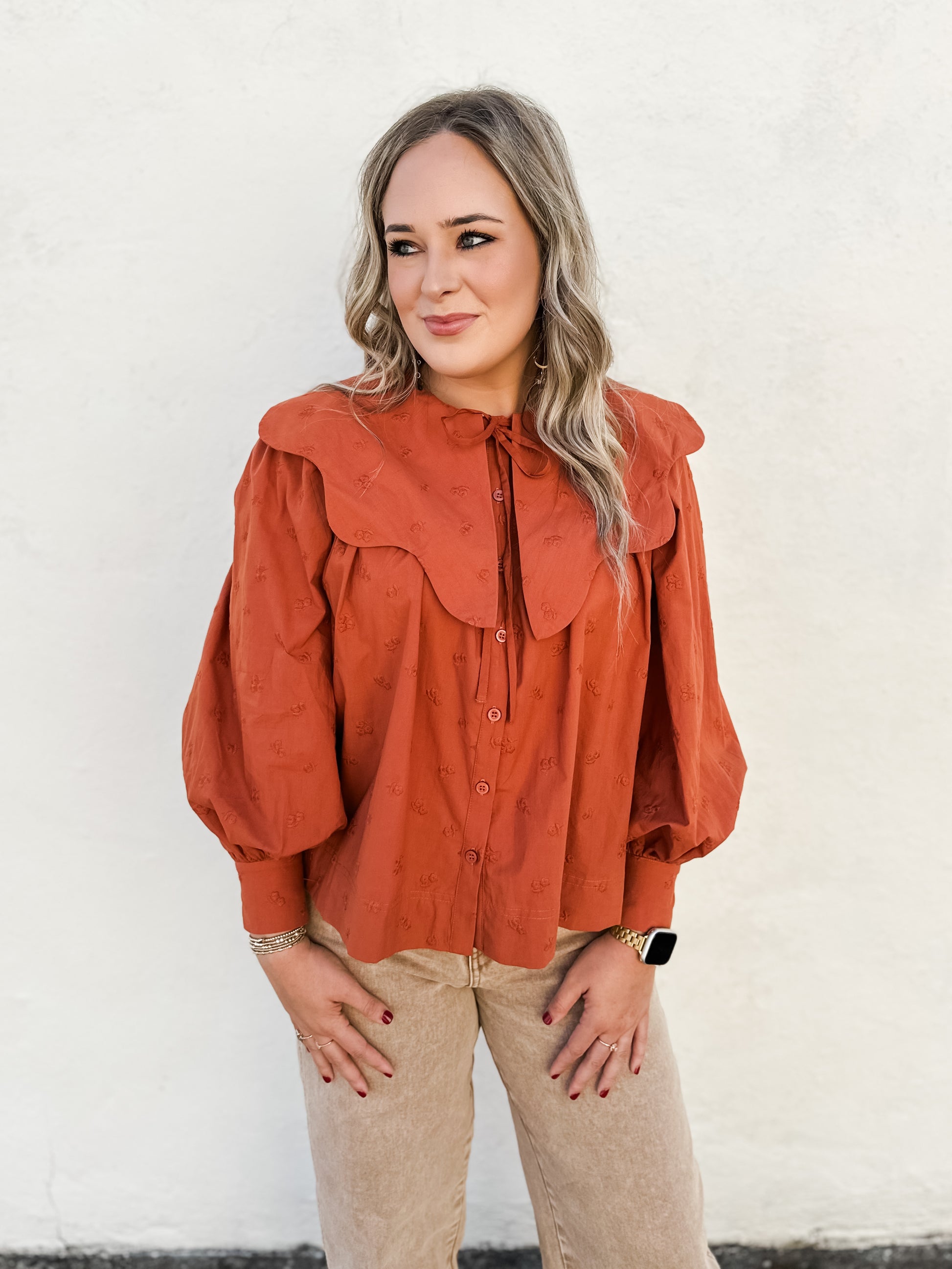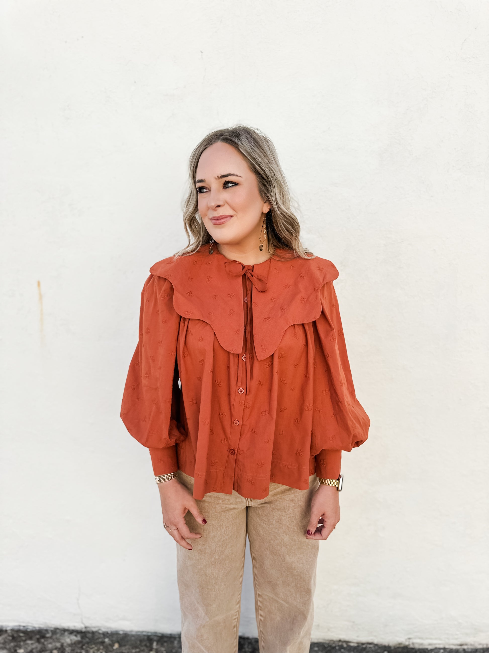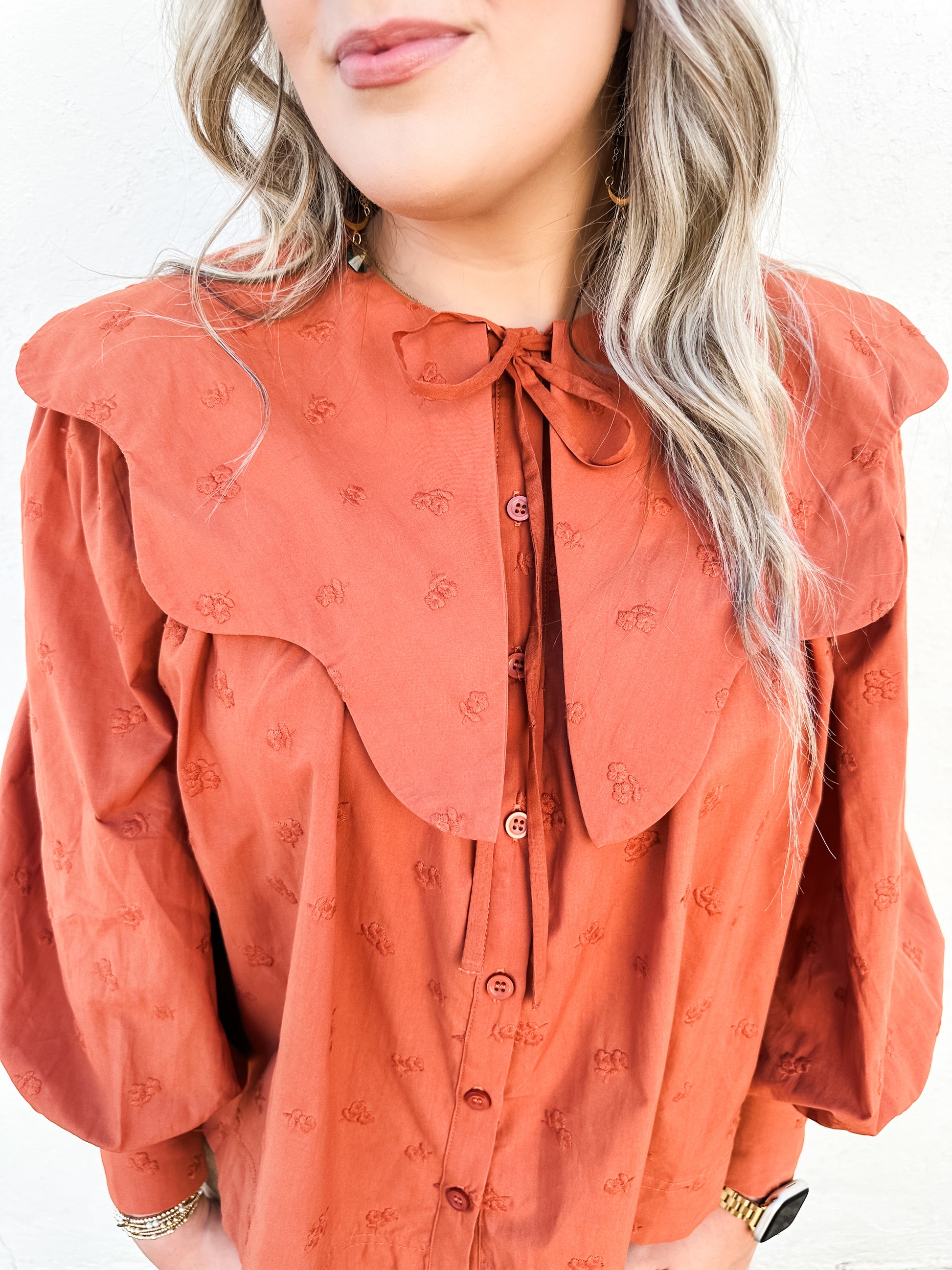 Embrace effortless style with the Cool Days Ahead Top, crafted from 100% cotton for breathable comfort. Its all-over floral embroidery adds delicate charm, while the oversized scallop collar brings a touch of vintage elegance. The long sleeves with cuffs provide a polished finish, and the selfie tie with button-down closure offers a customizable fit. In a warm rust shade, this top is perfect for adding cozy sophistication to your wardrobe.