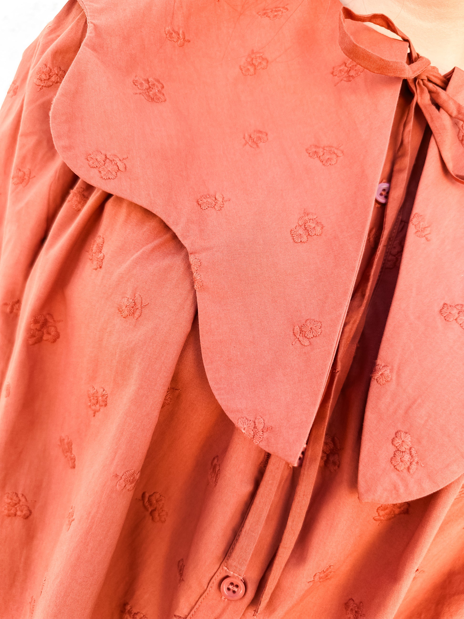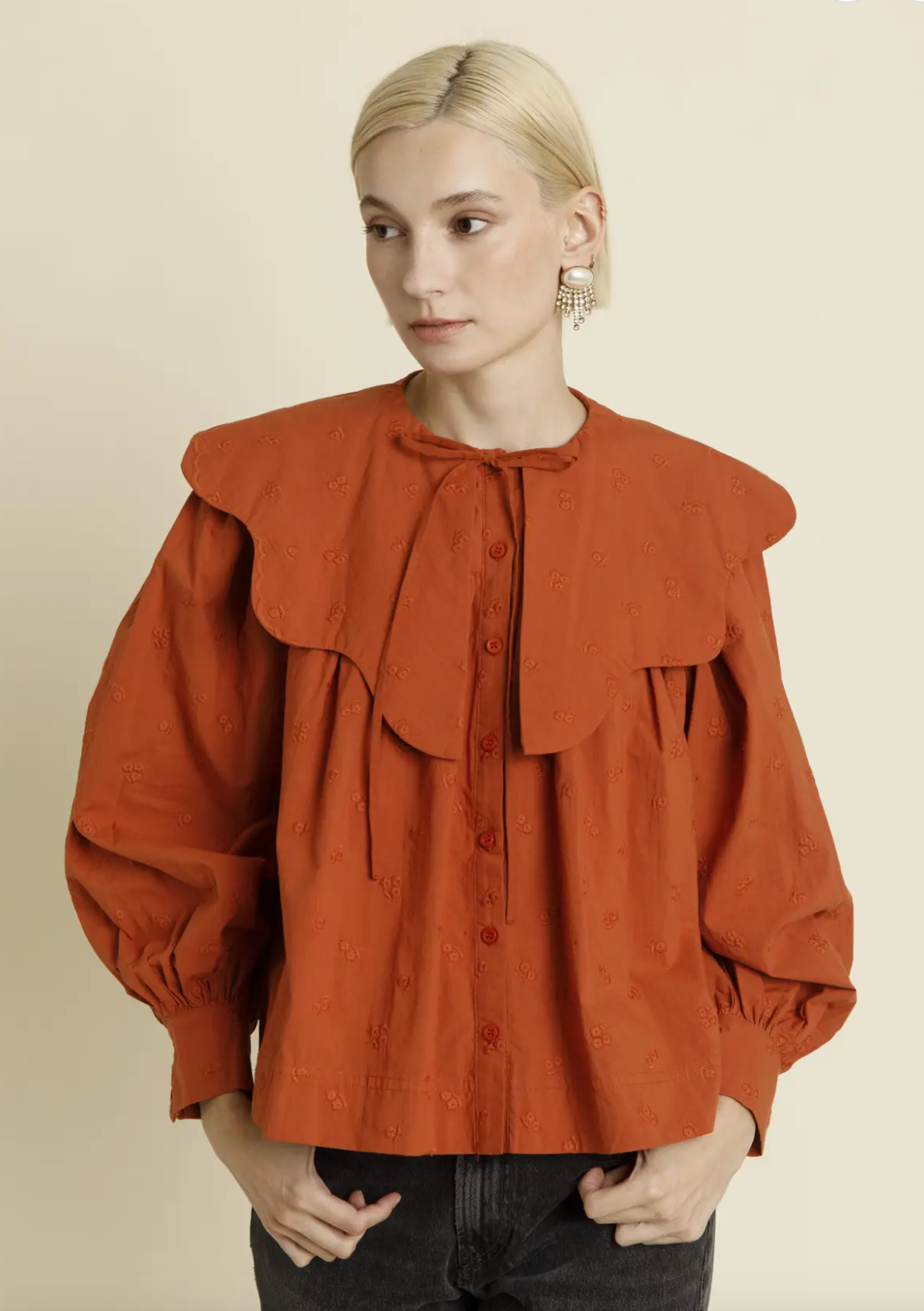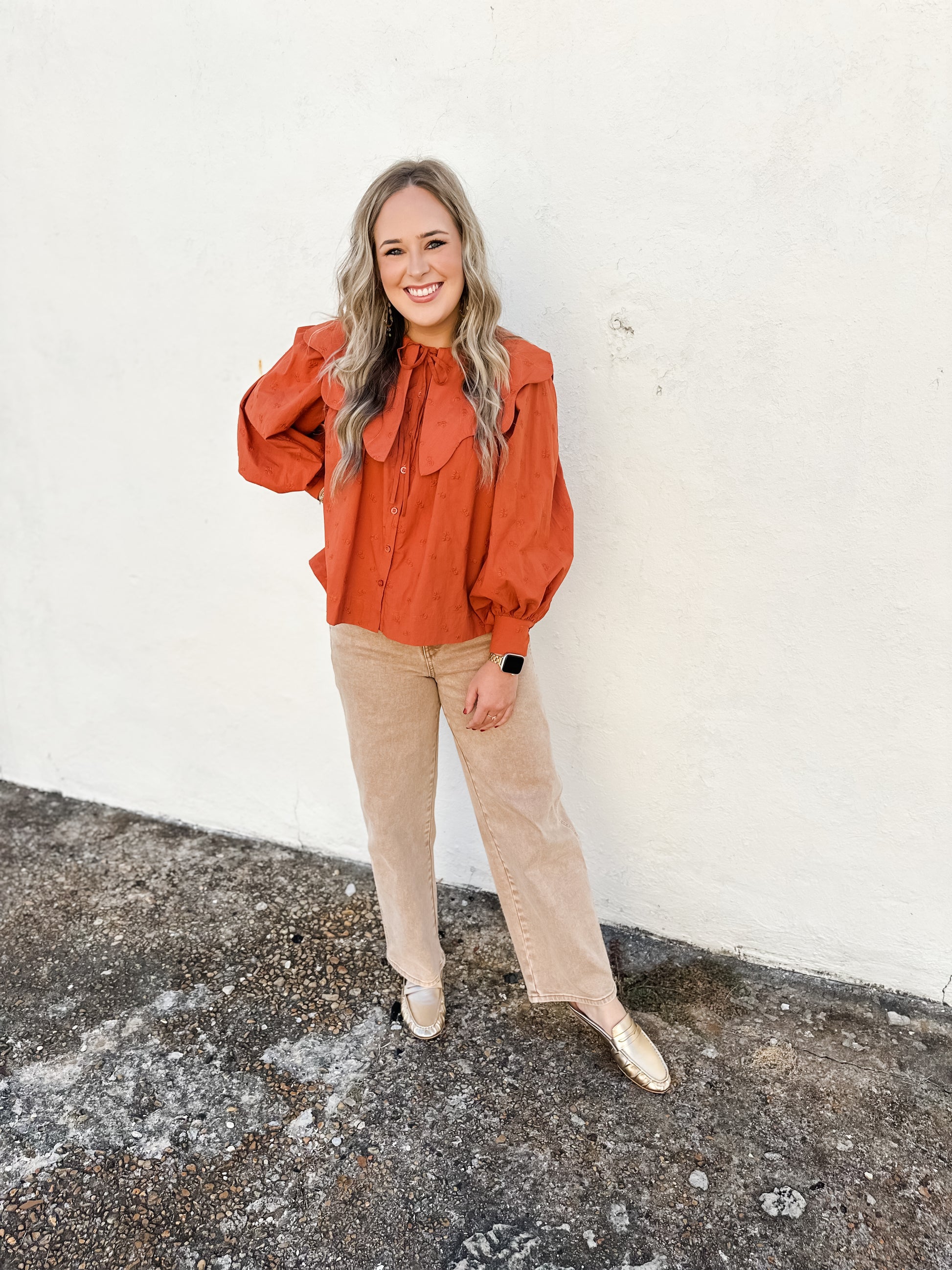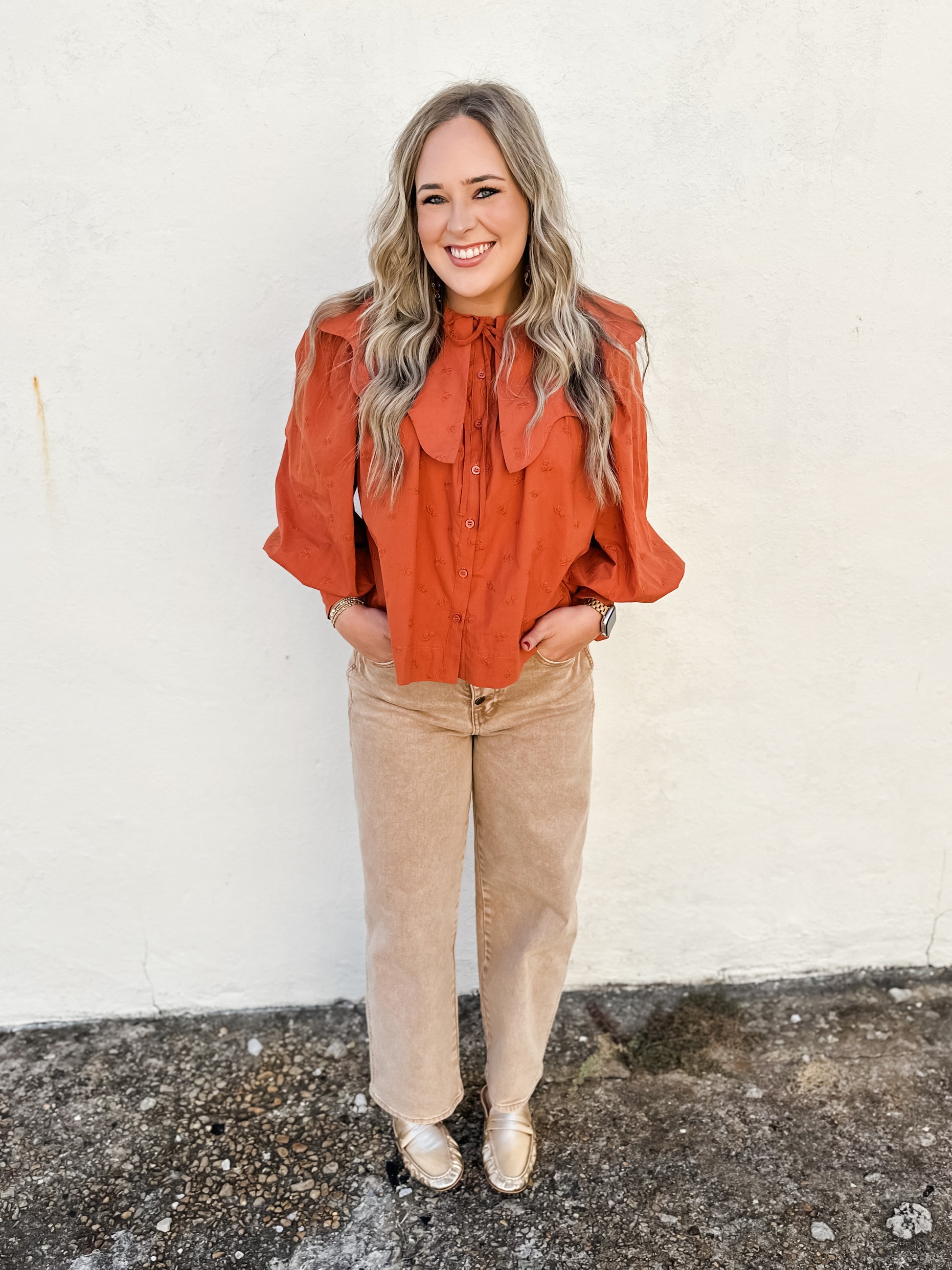 Embrace effortless style with the Cool Days Ahead Top, crafted from 100% cotton for breathable comfort. Its all-over floral embroidery adds delicate charm, while the oversized scallop collar brings a touch of vintage elegance. The long sleeves with cuffs provide a polished finish, and the selfie tie with button-down closure offers a customizable fit. In a warm rust shade, this top is perfect for adding cozy sophistication to your wardrobe.