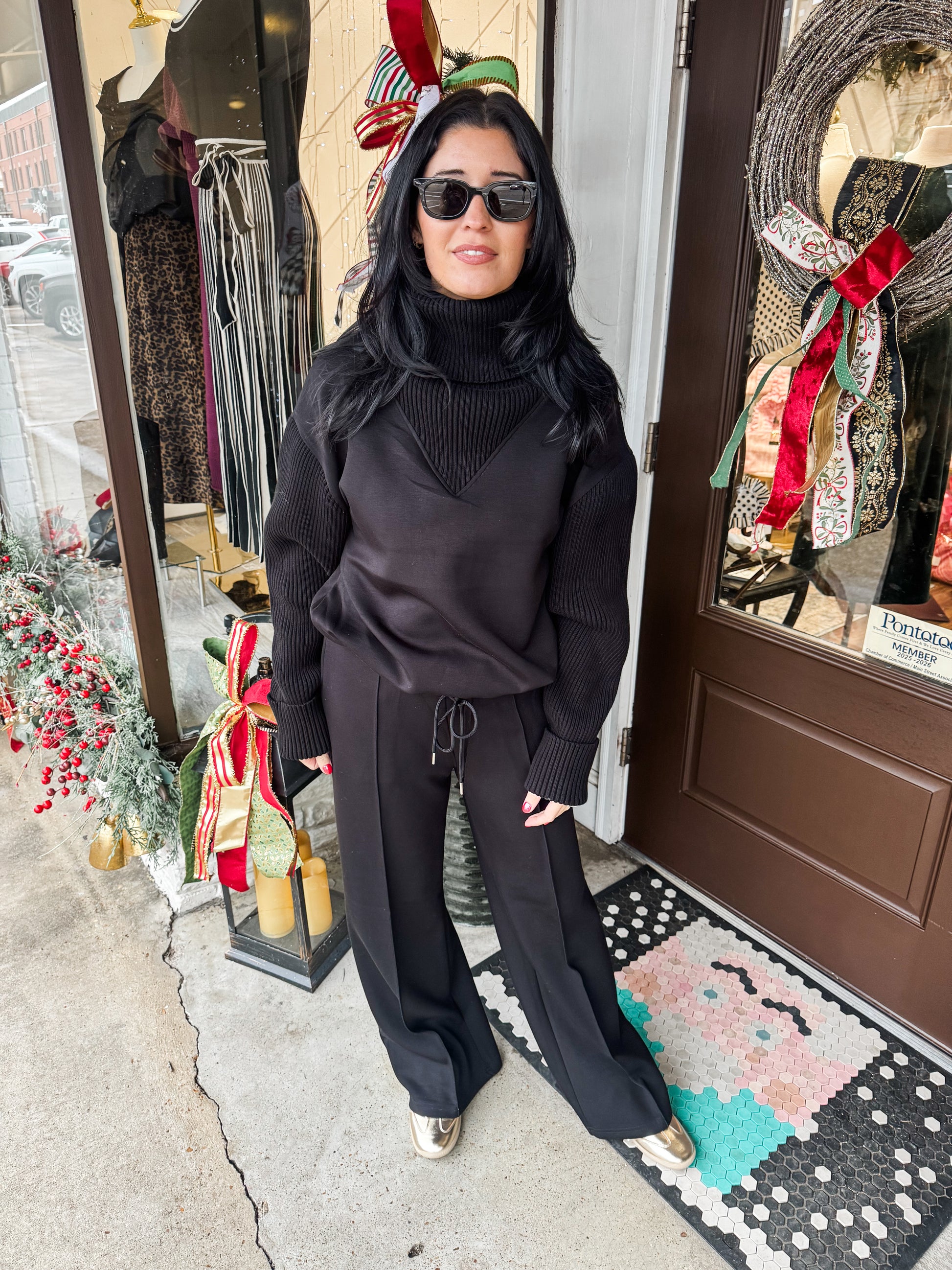 Effortlessly transition from errands to evening with this versatile black turtleneck. The classic loose ribbed construction offers comfortable movement throughout your day, while long ribbed sleeves provide layering flexibility. A practical drawstring waist lets you customize the fit to your preference, creating a flattering silhouette whether you're running around town or relaxing at home. This wardrobe essential pairs seamlessly with everything from jeans to skirts, making it the go-to piece you'll reach for again and again.