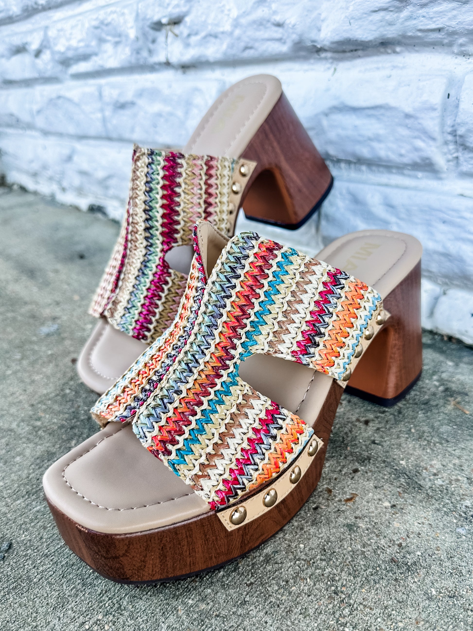 The Estelle Clog brings effortless style to your everyday rotation. Crafted from rich wood, this clog features eye-catching multicolor raffia vertical stripes that add a playful pop of texture and pattern. The comfortable 3½" heel provides just the right lift without sacrificing wearability, making it perfect for all-day comfort. A versatile piece that pairs beautifully with casual dresses, jeans, or linen pants.