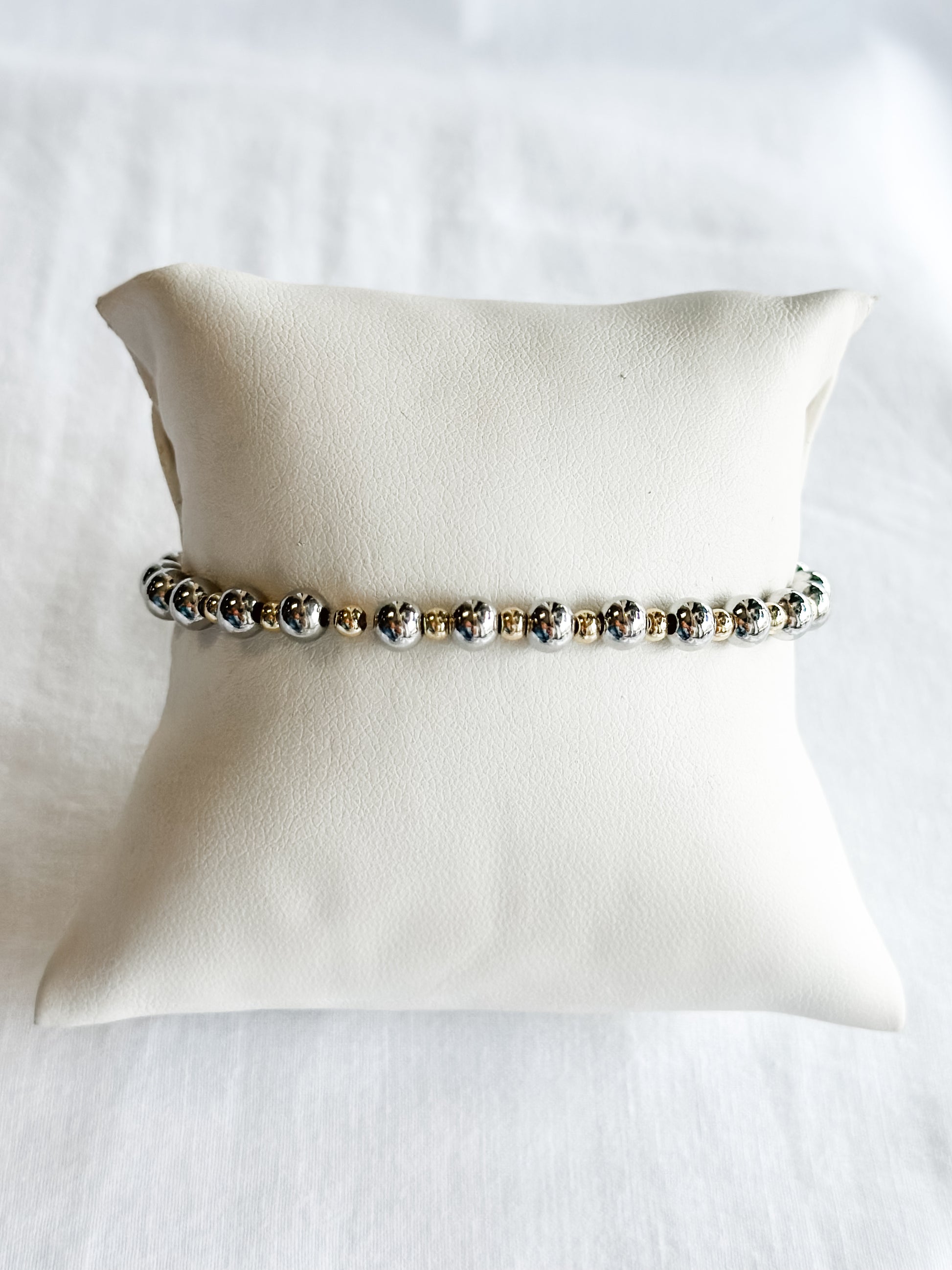 Elevate your style with the Eve Stretch Bracelet, featuring a bold mix of 4mm silver beads and delicate 2mm gold beads. This daring design effortlessly blends strength and elegance, making it the perfect statement piece for those who aren’t afraid to stand out. Comfortable and flexible, it adapts to your wrist for all-day confidence.
