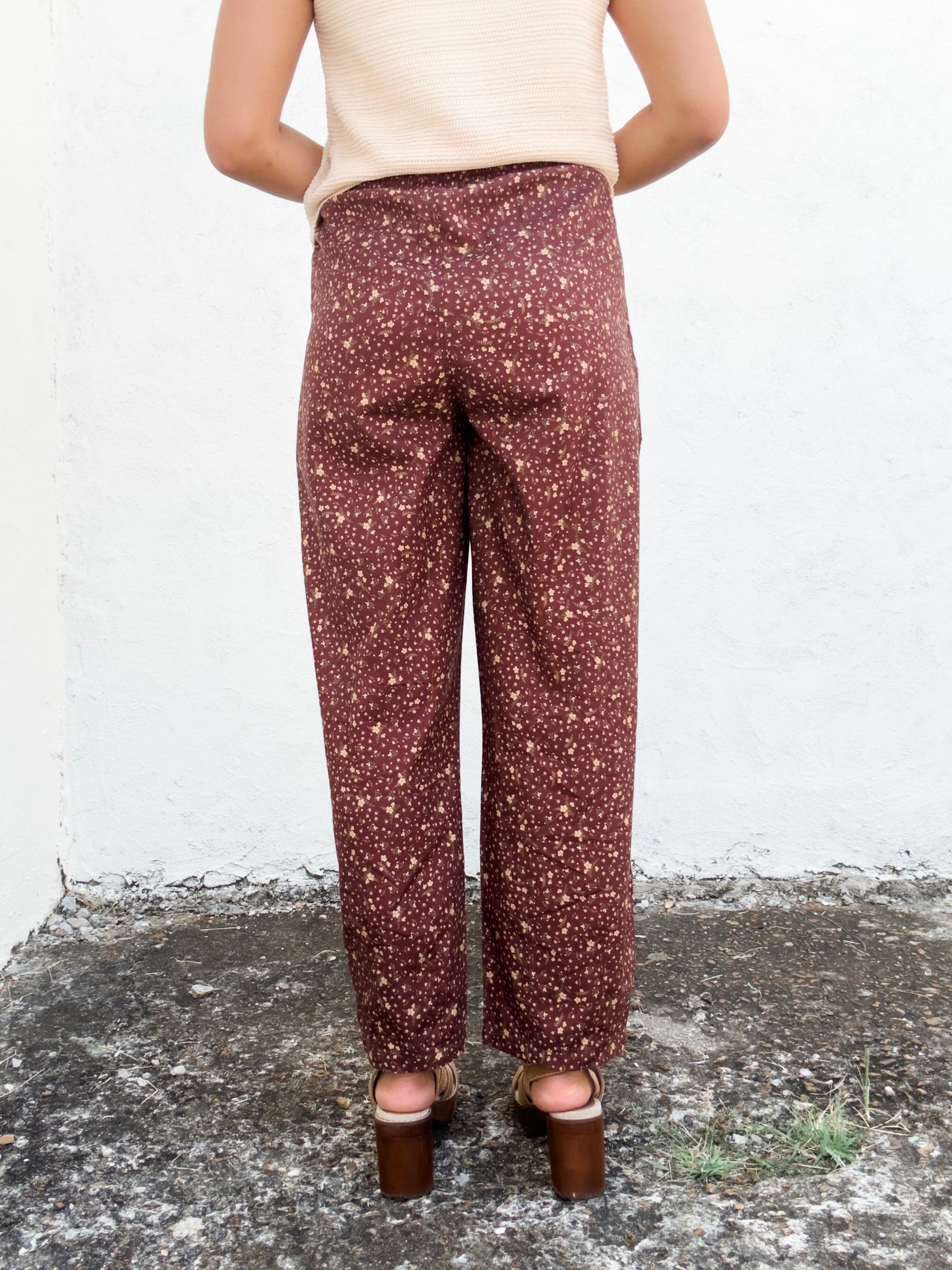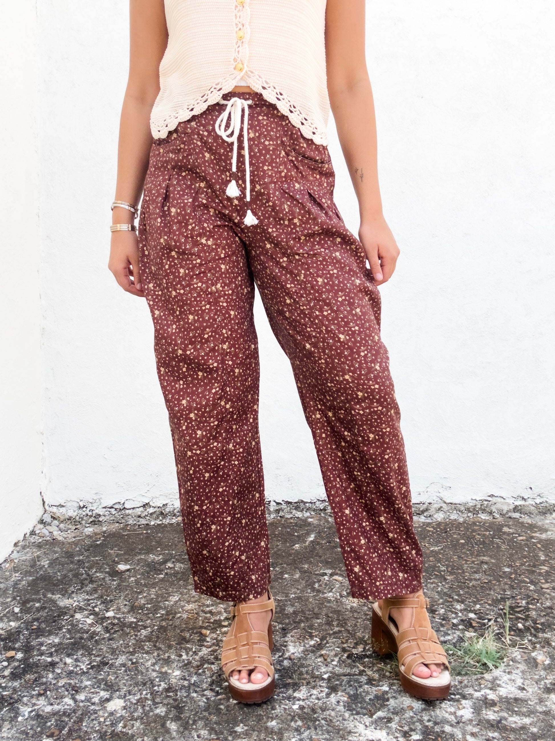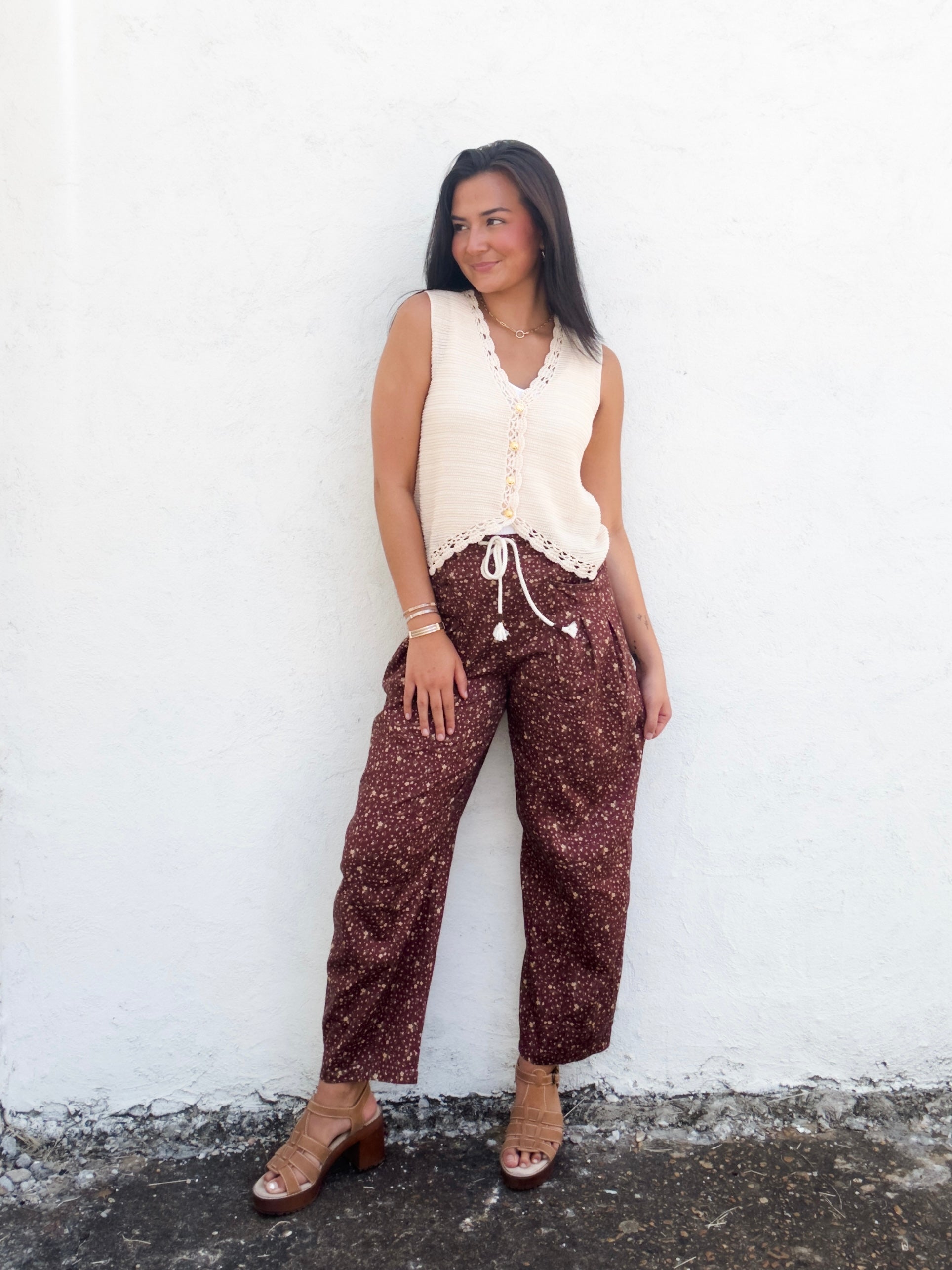 Experience effortless style with the Falling Over Pants, crafted from lightweight ditsy print woven fabric for a playful yet polished look. These high-rise, cropped pants feature a loose fit and a functional drawstring waist for adjustable comfort. The waist-belted denim detail adds a modern edge, making them perfect for both casual outings and chic ensembles. Elevate your wardrobe with pants that combine comfort and trend-forward design.