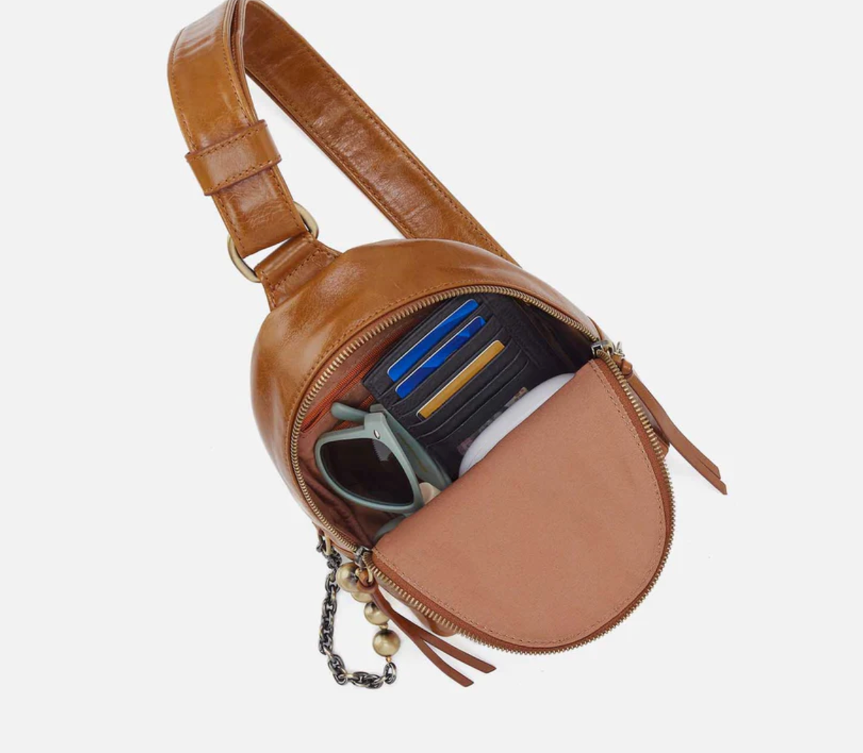 Meet Fern, your new hands-free essential. This versatile sling bag features soft pebbled leather in rich truffle, accented with antique brass hardware and a graceful chain that drapes beautifully across the front. Wear the adjustable strap (14"-21") crossbody or switched to either side—whatever feels right. Inside, discover a zip pocket and slip pocket, plus a signature exterior phone pocket for secure access. At 6.5"W x 8.5"H x 2.5"D, Fern holds everything you need: phone, keys, and more. From hiking trails to city streets, this leather companion combines effortless style with everyday functionality. Fern proves that beauty and purpose belong together.