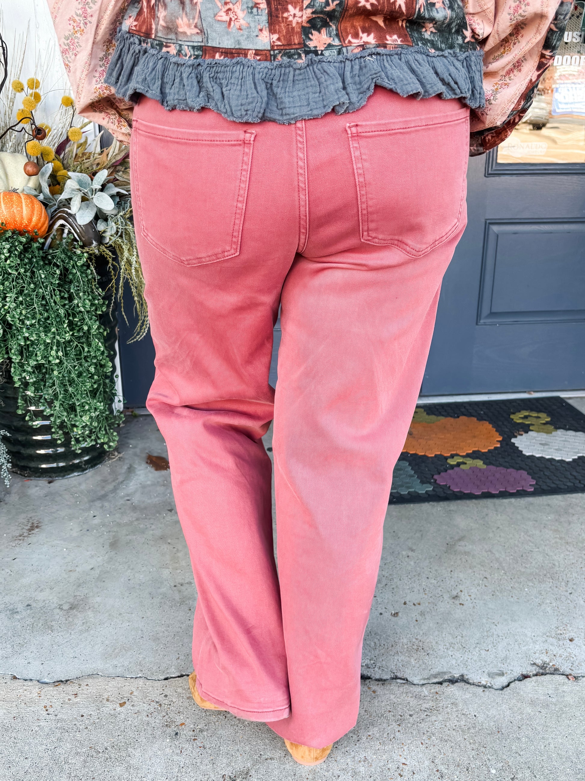 Experience unmatched comfort and style with the Flora High Rise Straight pants. Crafted from super stretch twill—a blend of 94% cotton, 4% polyester, and 2% spandex—these raspberry-red pants offer flexibility and durability for all-day wear. Featuring a flattering high-rise waist, five practical pockets, and a smooth zipper fly, they combine classic design with modern comfort. The garment-dyed finish and neatly finished hem add a refined touch, making these twill pants a versatile wardrobe essential that seamlessly transitions from day to night.