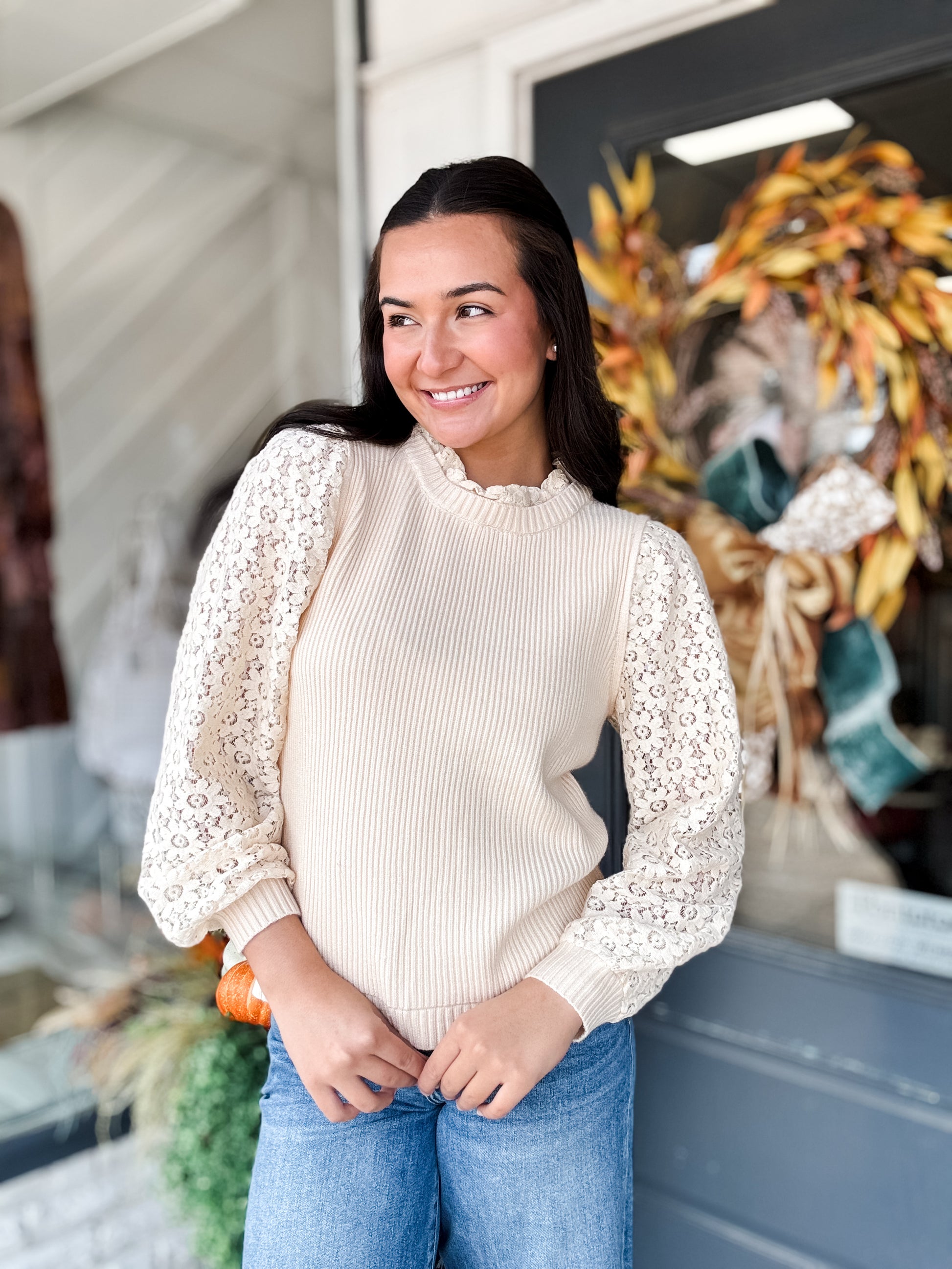 Embrace bold elegance with the Flowers Upon Flowers Sweater. This cream ribbed knit features long sleeves adorned with delicate flower lace, adding a flirty, daring edge to your look. The mock neck with intricate lace detail frames your neckline with subtle sophistication, making it perfect for standing out in any crowd.
