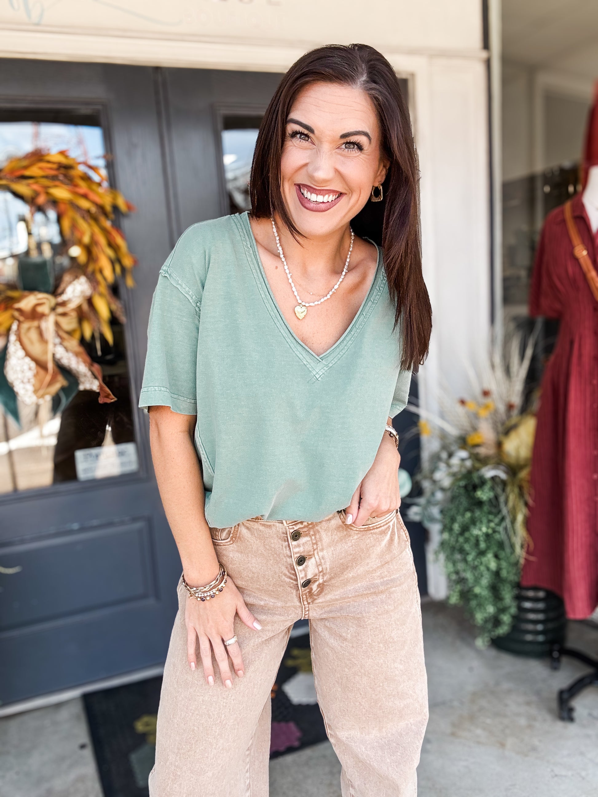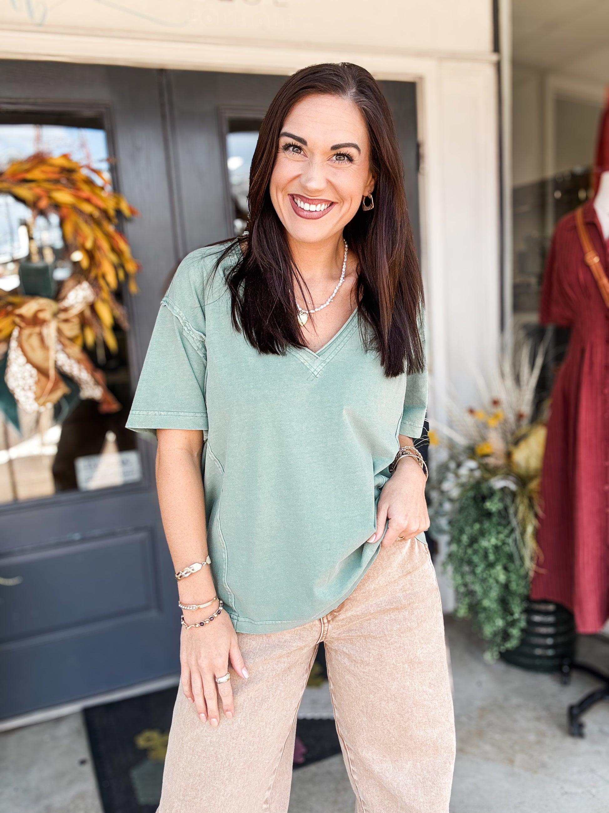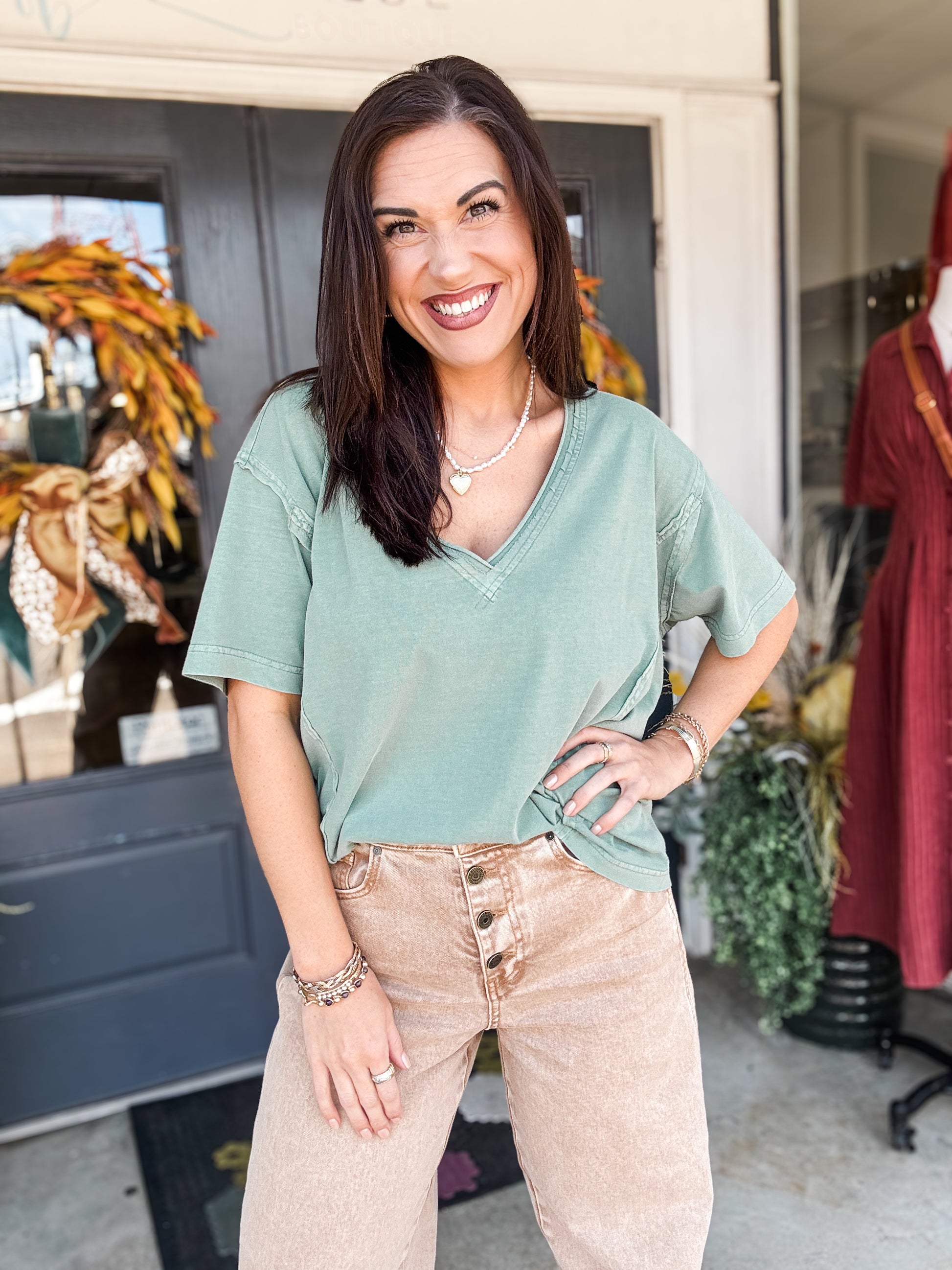 Experience effortless style with the Green Bay Tee. This short-sleeve shirt features a soft green washed fabric that gives a relaxed, lived-in feel. Its raw edge details add a trendy, casual touch, while the flattering V-neck enhances comfort and elegance. Perfect for everyday wear, this tee offers both comfort and a laid-back yet polished look you'll reach for again and again.