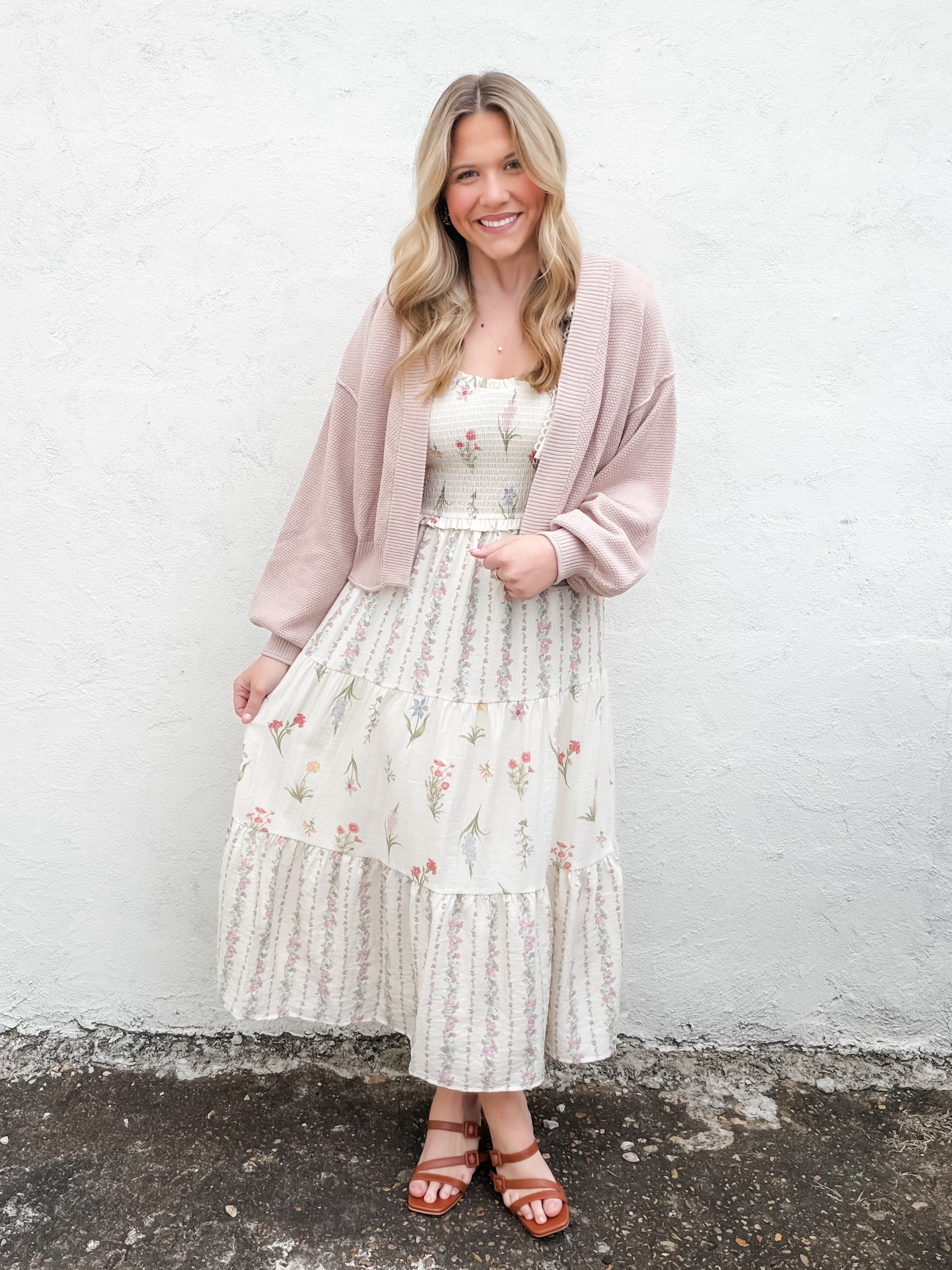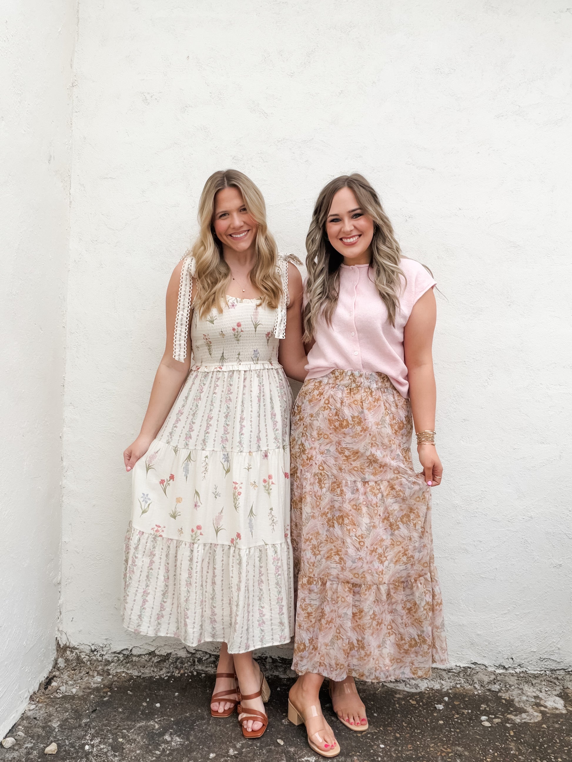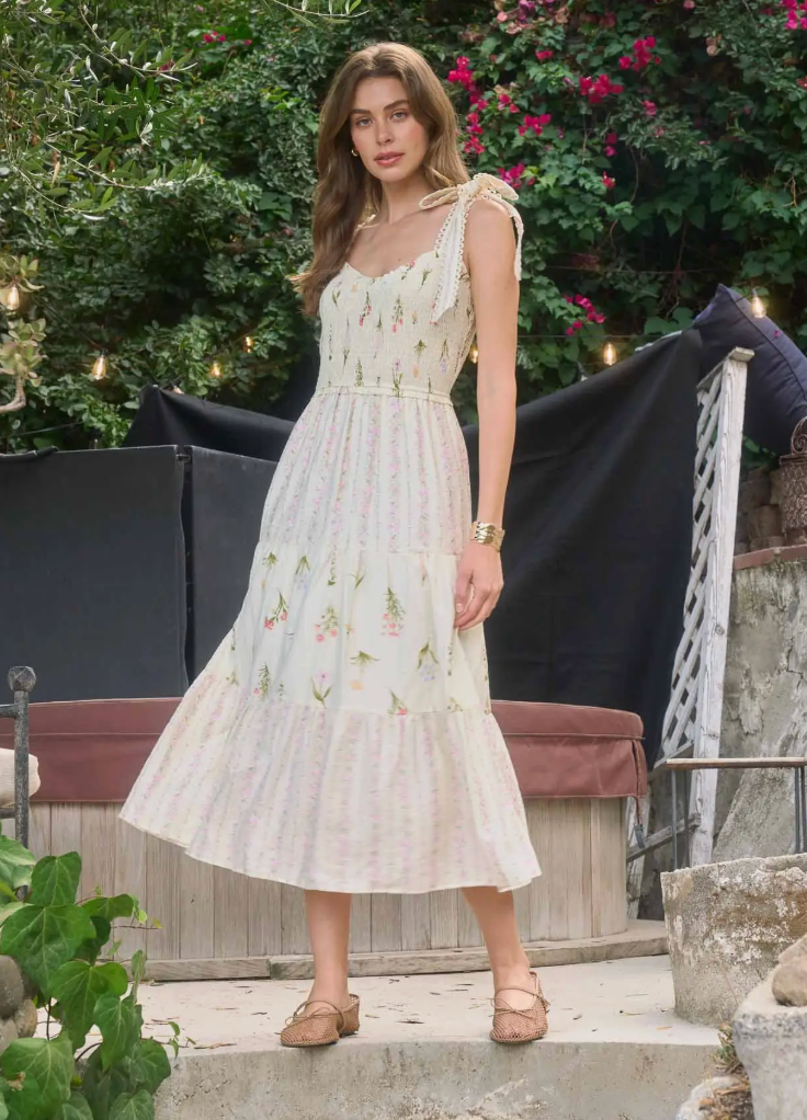 Embrace effortless elegance with this enchanting midi dress that celebrates your best self. The square neckline and sleeveless silhouette create a flattering, modern look, while the smocked bodice provides comfortable support and beautiful definition. Delicate tie straps adorned with scallop lace trim add a romantic touch, and the tiered skirt offers graceful movement and dimension. A vibrant mixed floral print brings joy and personality to every occasion, from casual outings to special gatherings. Fully lined for confidence and comfort, this dress is your go-to piece for looking and feeling absolutely radiant.