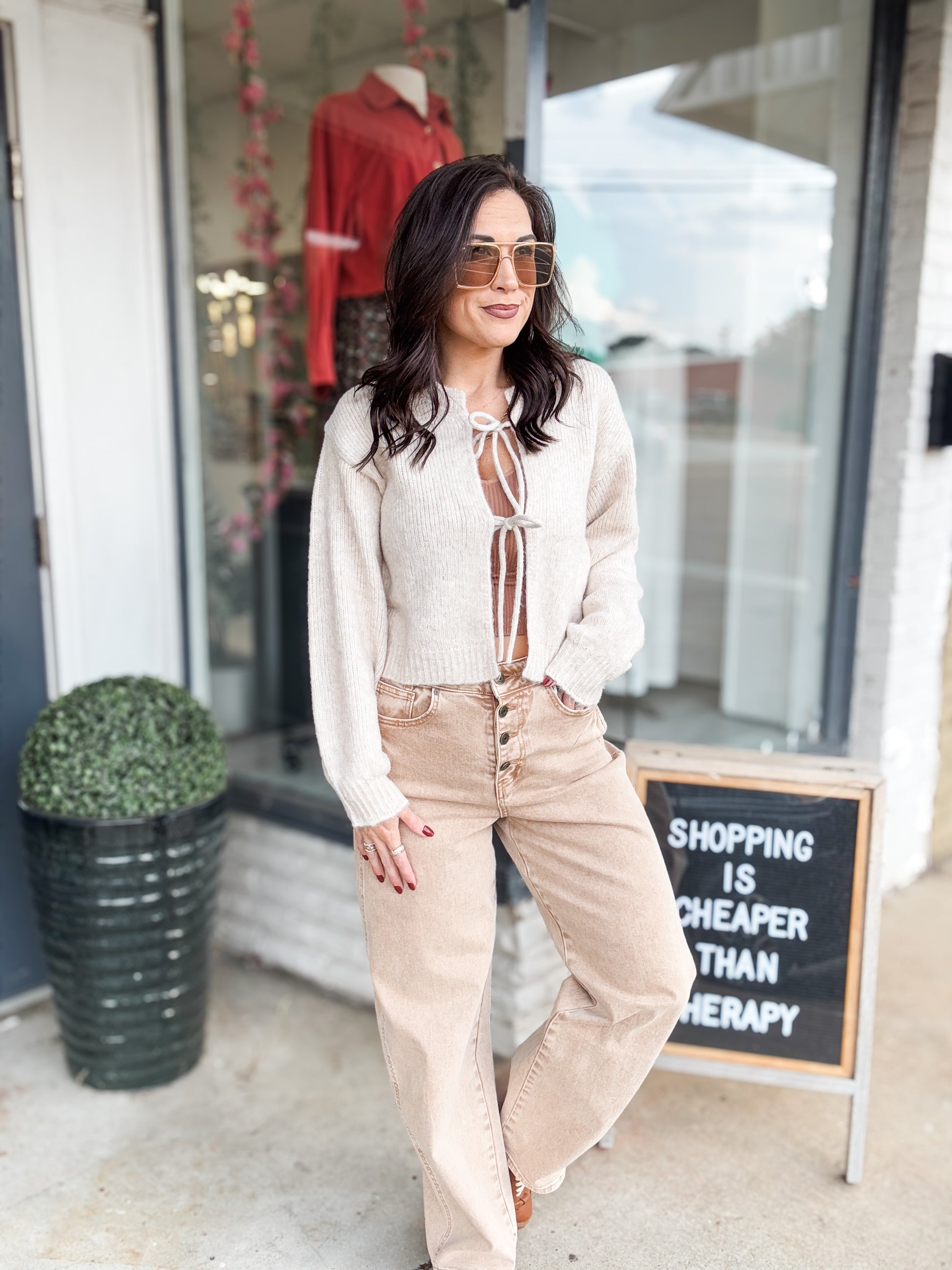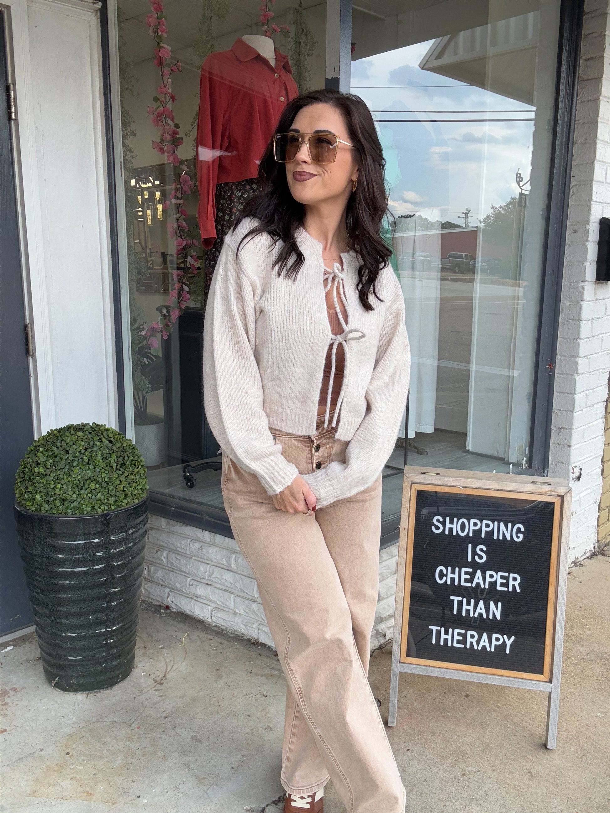 Embrace cozy elegance with this bow front crop sweater in a soft heathered oatmeal shade. Its flattering cropped fit pairs perfectly with high-waisted styles, while the charming bow detail adds a feminine touch. Crafted for comfort and style, this sweater is ideal for layering or wearing on its own to elevate your casual wardrobe effortlessly.