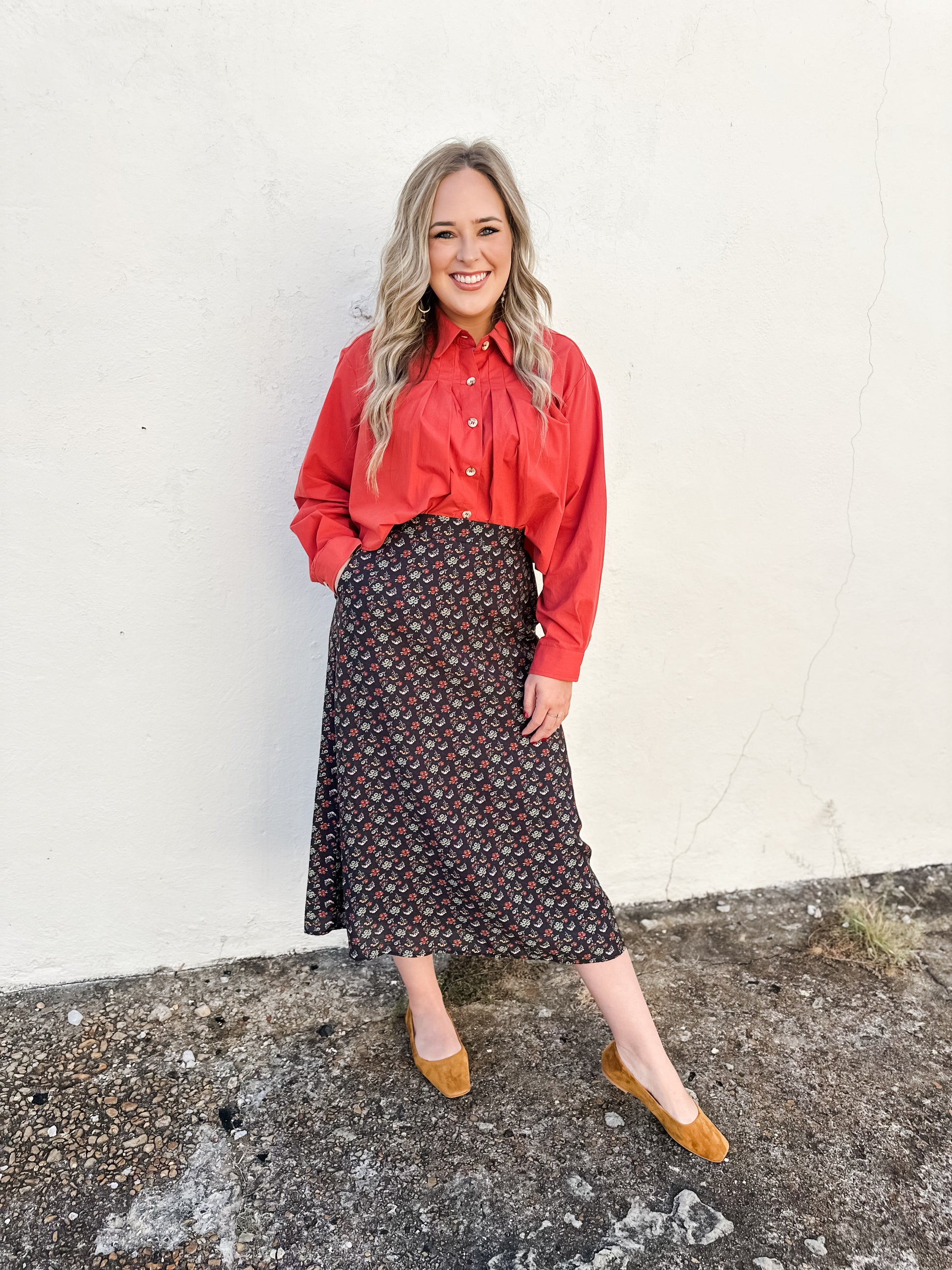 The Heritage Petals Midi Skirt features a striking black base adorned with green, gold, and rust floral patterns for timeless elegance. Designed with a back elastic waist and a structured front banded waist, it offers both comfort and a flattering fit. Fully lined for smooth wear, this skirt effortlessly blends style with ease, making it a perfect choice for any occasion.