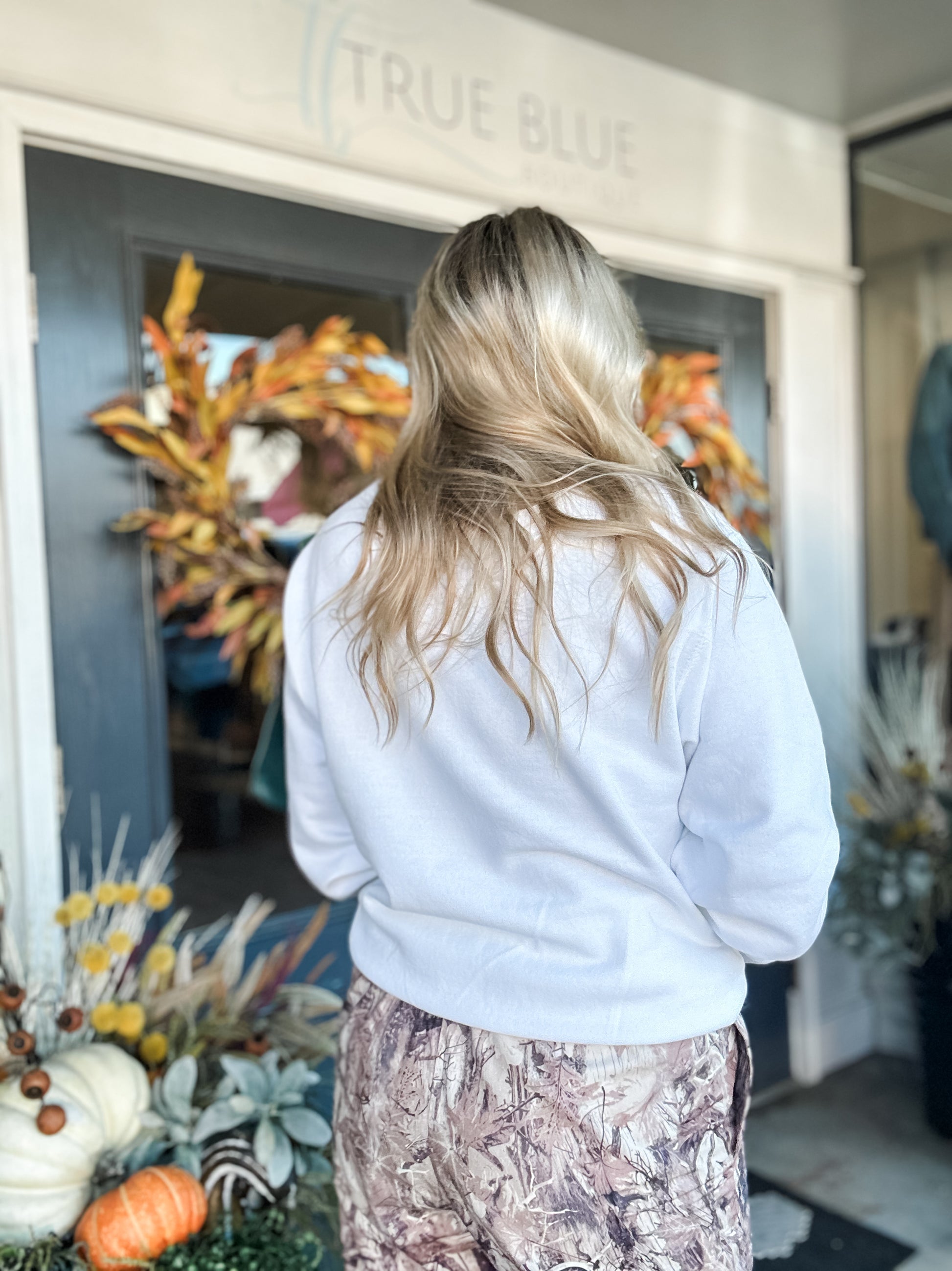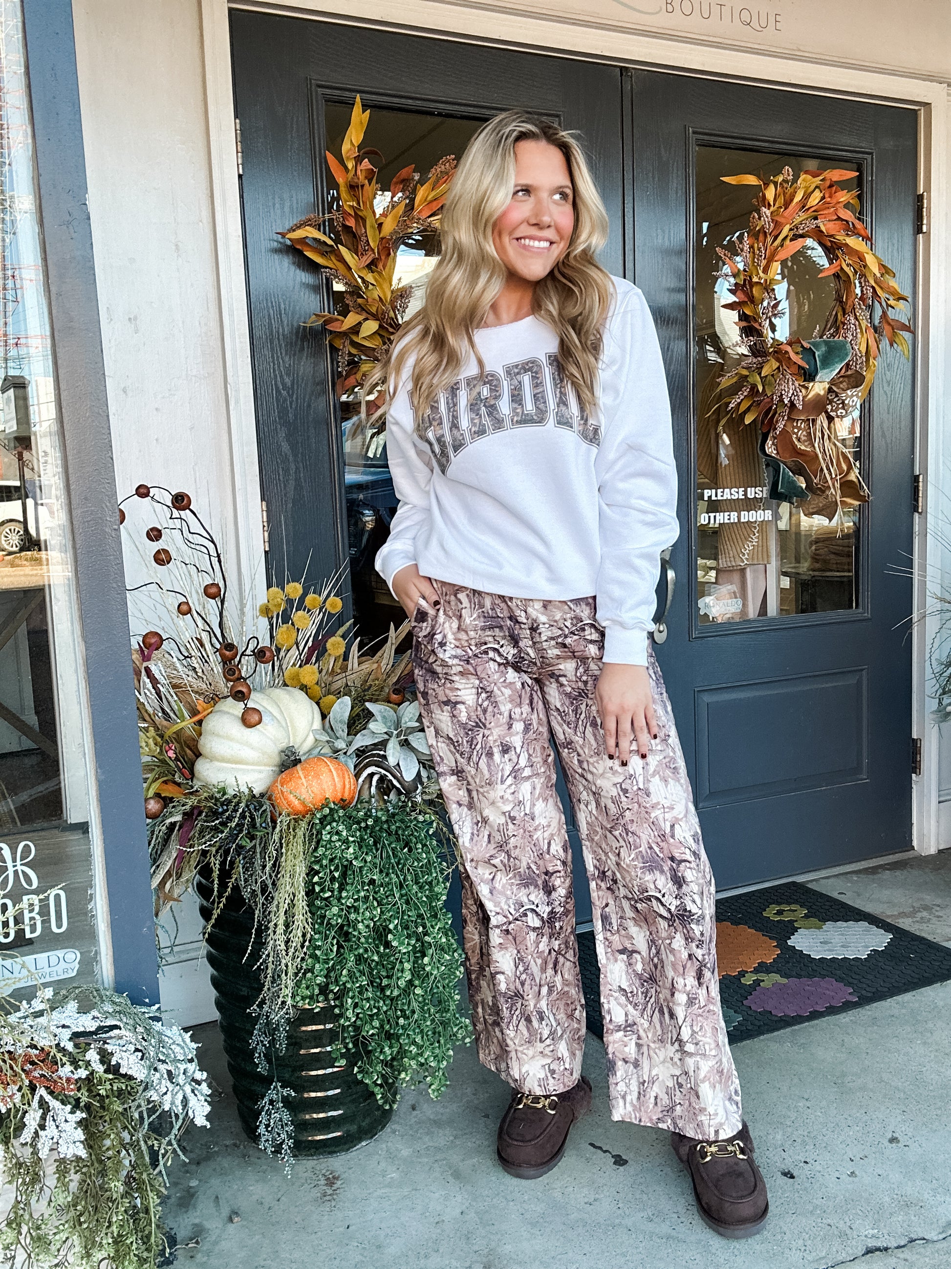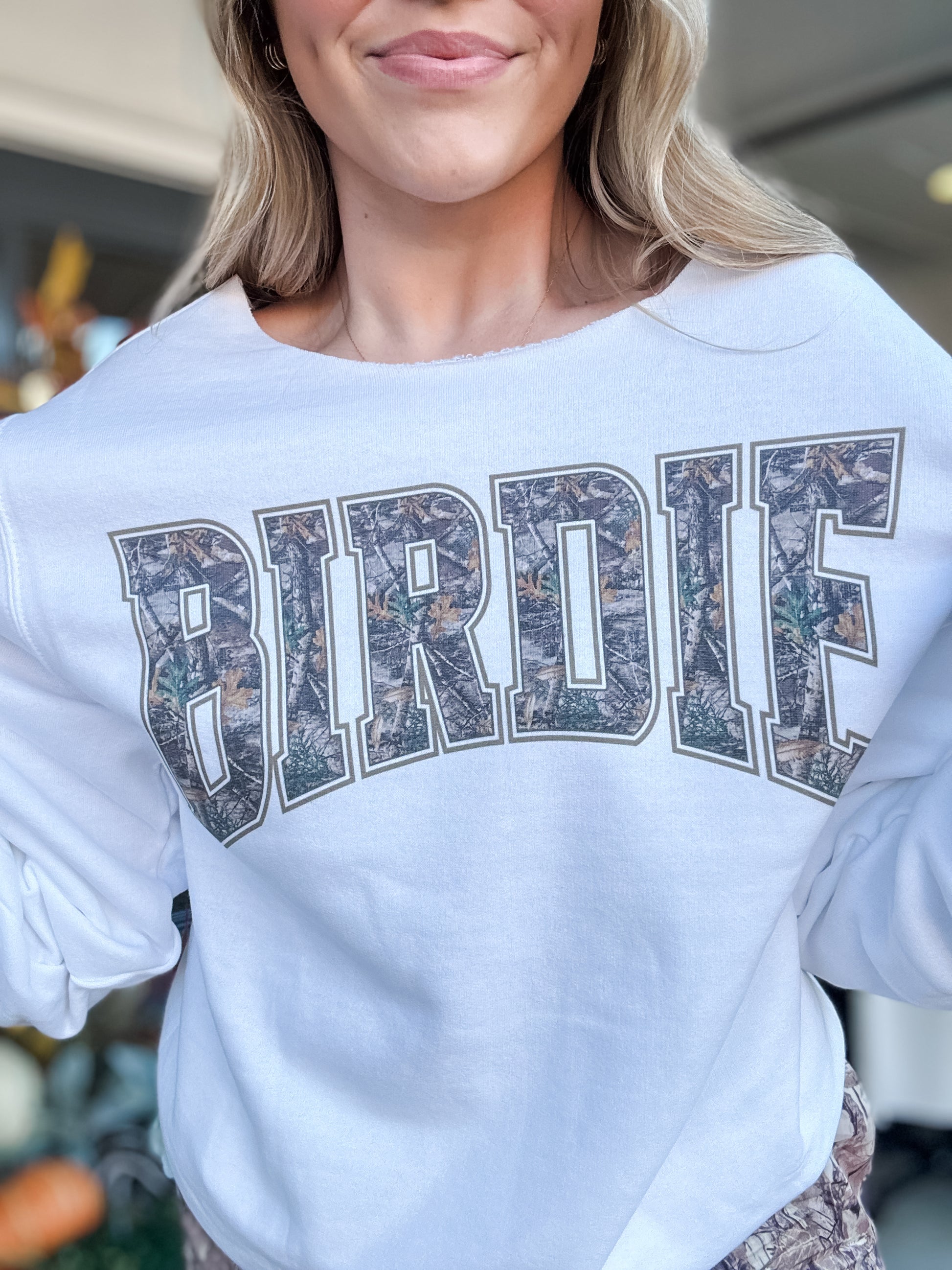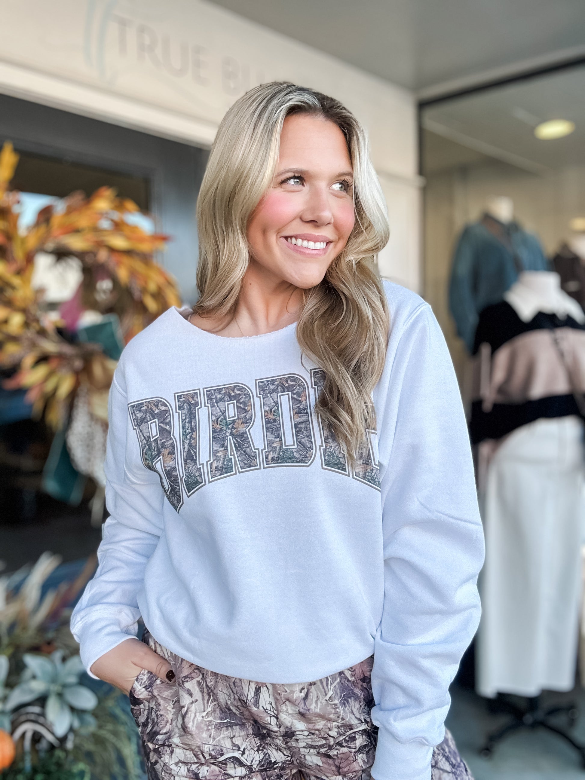 Stay comfortable and stylish with the Hunt Me Down Top, featuring a soft blend of 50% cotton and 50% polyester for breathable, lasting wear. Its relaxed neck design adds effortless ease, while the distinctive Birdie Logo in camo brings a bold, outdoorsy touch. Perfect for casual days or layering, this white sweatshirt combines comfort and statement style in one must-have piece.