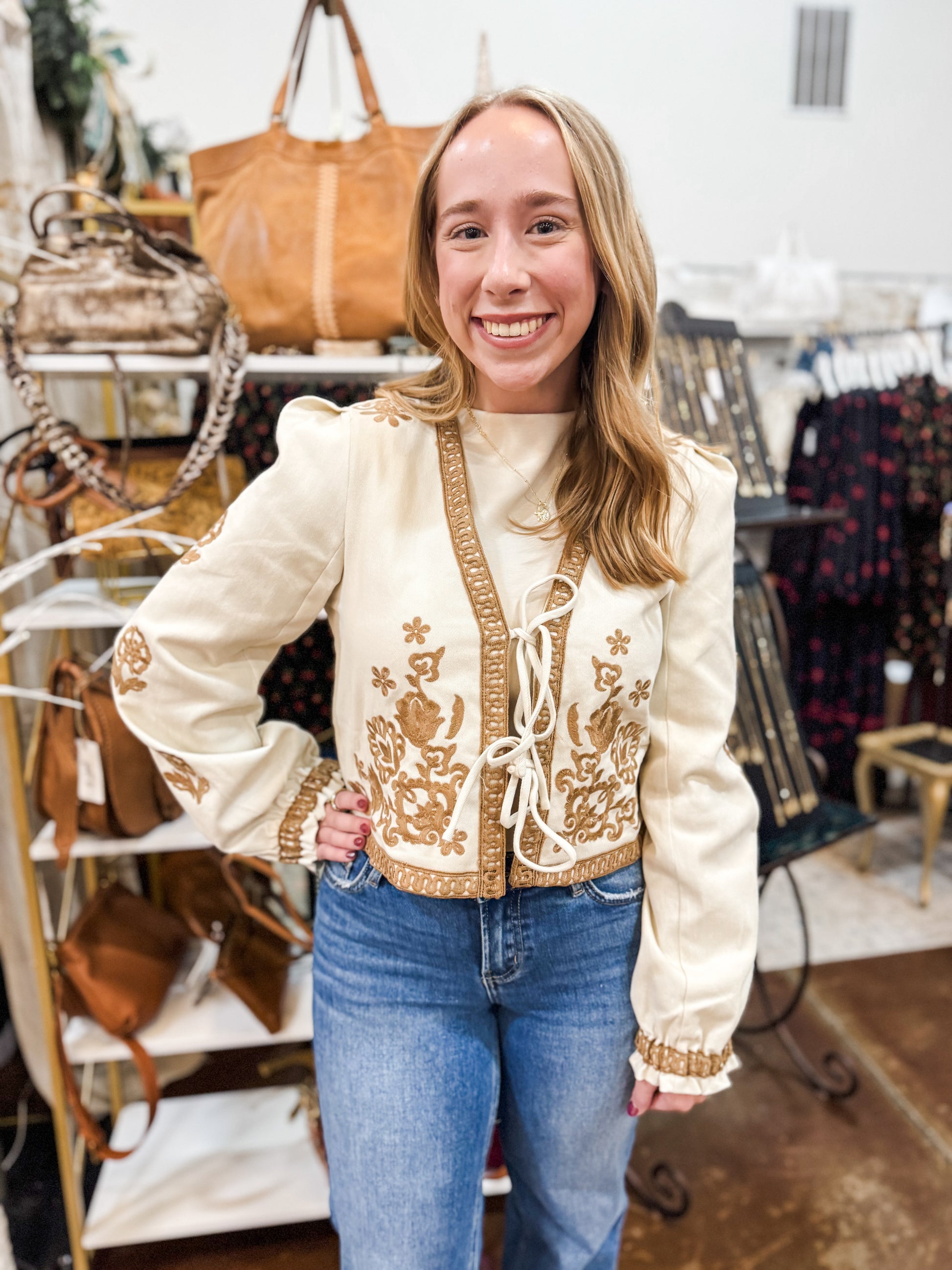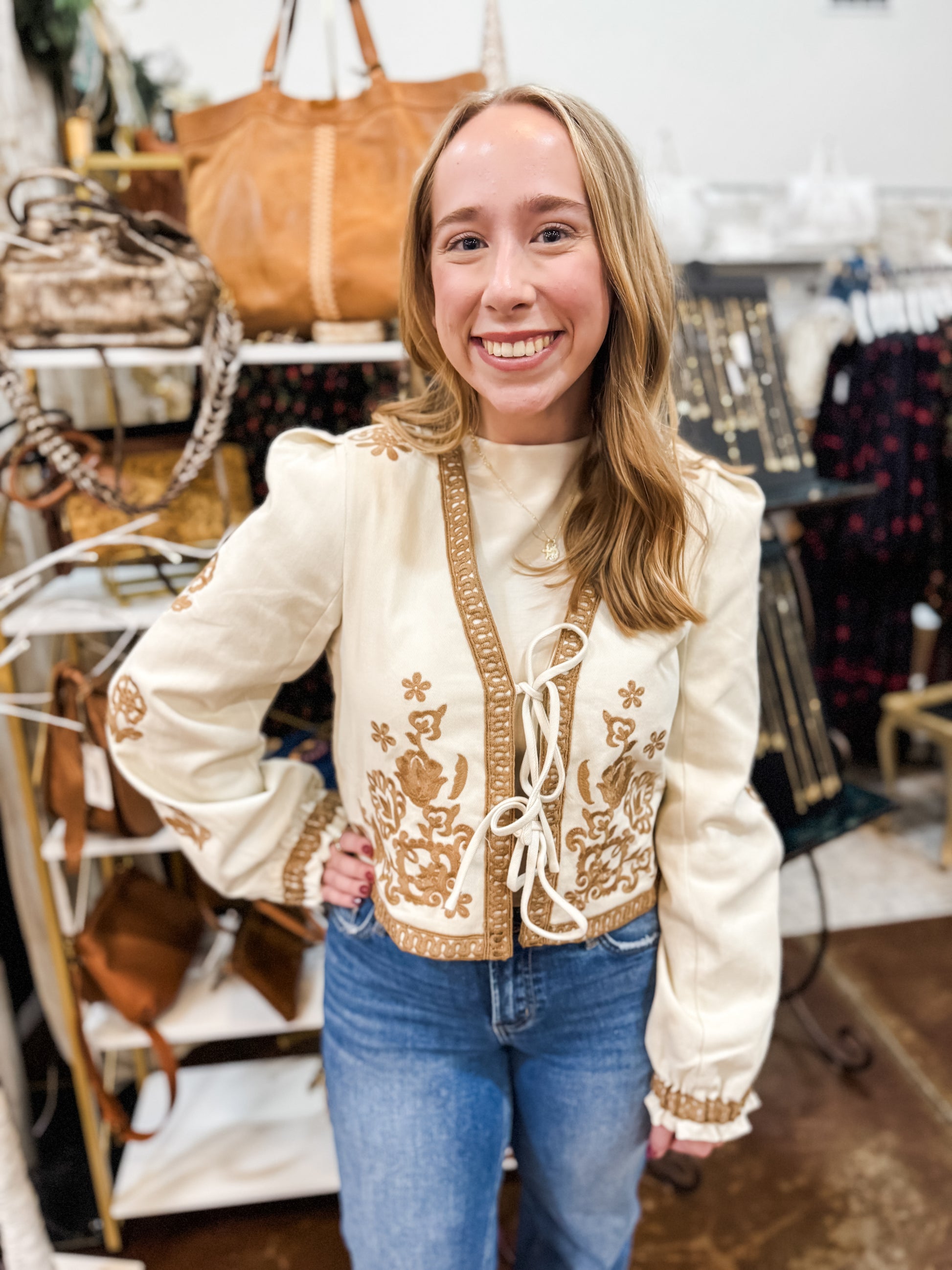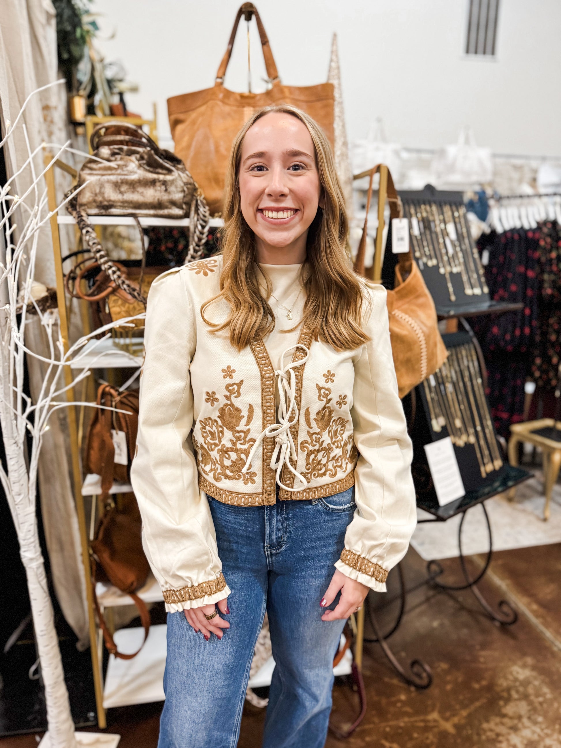 Elevate your wardrobe with the Im Royalty Jacket, featuring a soft cream base adorned with intricate camel-colored embroidery. Detailed beautifully across the front, around the waist, and flowing down the sleeves, this jacket adds a regal touch to any outfit. Designed to blend classic elegance with modern style, it offers a distinctive look that sets you apart with confidence and sophistication.