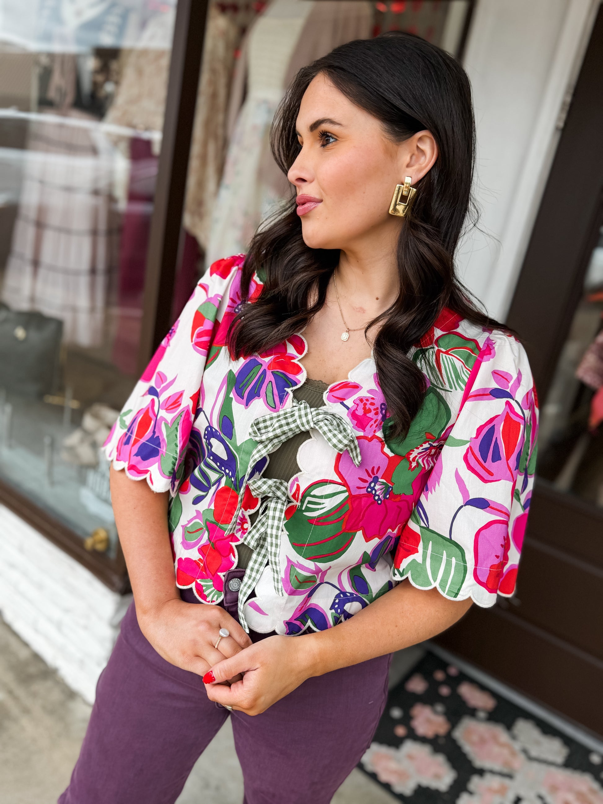 Introducing the I'm So Innocent Top—a charming piece that brings playful elegance to your wardrobe. This crop top features a cream background adorned with a striking floral design in vivid greens, purples, pinks, and reds that instantly captures attention. The open scallop front is secured with delicate green gingham ties, creating a sweet, adjustable neckline that flatters every frame. Short sleeves keep things breezy and comfortable, while the scalloped hemline adds a feminine touch that elevates your everyday look. Perfect for pairing with high-waisted bottoms or layering over your favorite pieces, this top brings vintage-inspired charm with modern flair to any outfit.