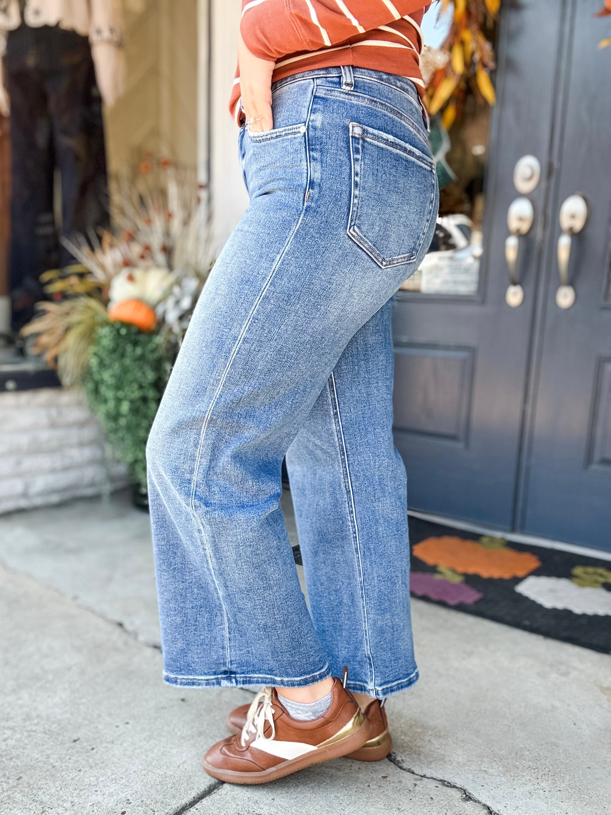 These high-waisted wide-leg jeans combine comfort and style with their highly stretchy fabric for ease of movement. Crafted from a soft cotton blend, they feature a classic five-pocket design, hand-stitched detailing, and subtle whiskering and fading for a sophisticated look. The folded hems add a polished finish, while the ankle-length inseam complements the high rise for a flattering silhouette. Perfect for everyday wear with a touch of timeless charm.