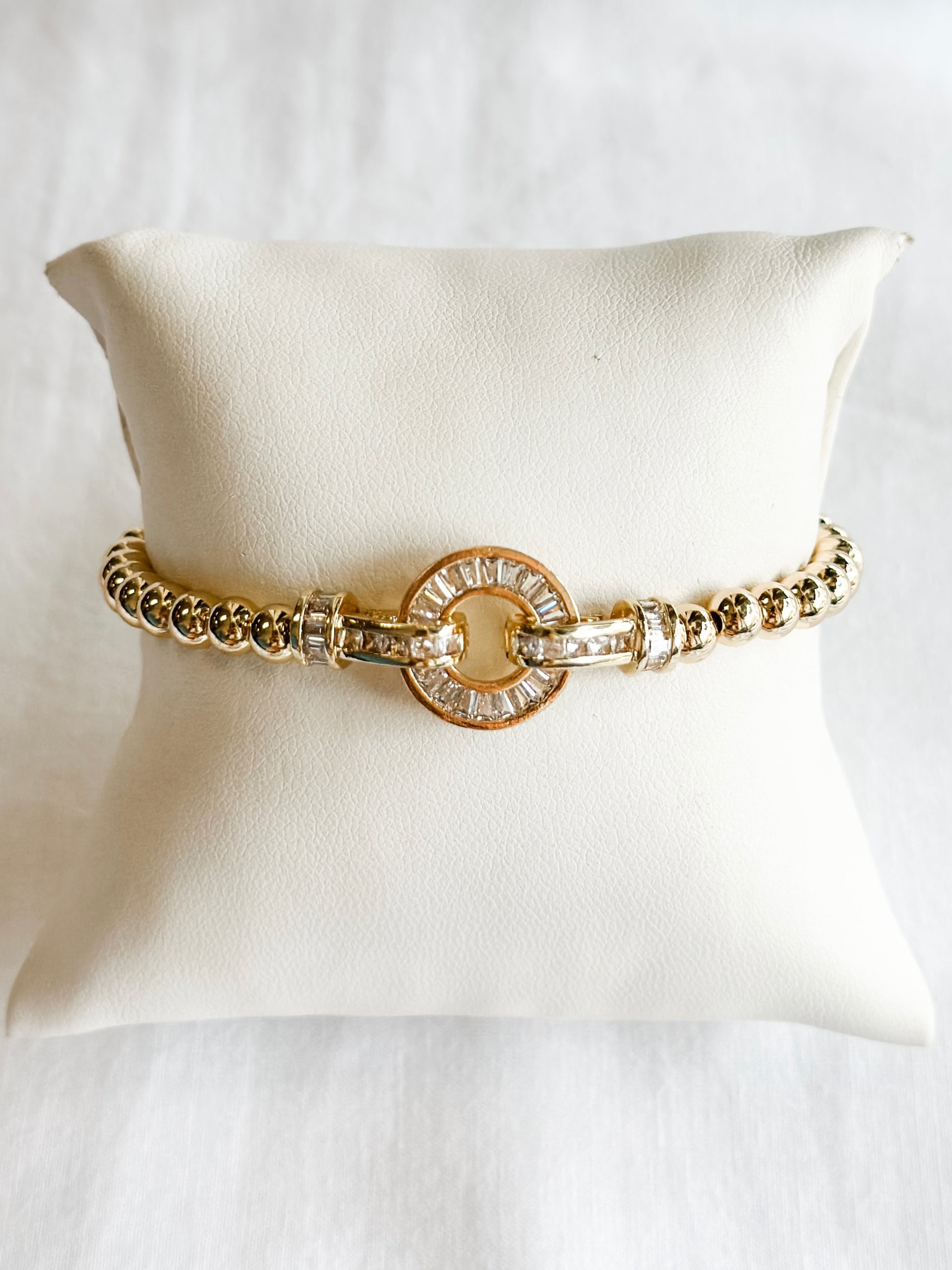 Add a touch of sparkle to your wrist with the Mary Stretch Bracelet! Featuring a large round CZ circle centerpiece and dazzling CZ clasps on both sides, this playful gold bracelet shines with stretch gold beads for a comfortable, flexible fit. Perfect for adding a fun, glamorous twist to any outfit.