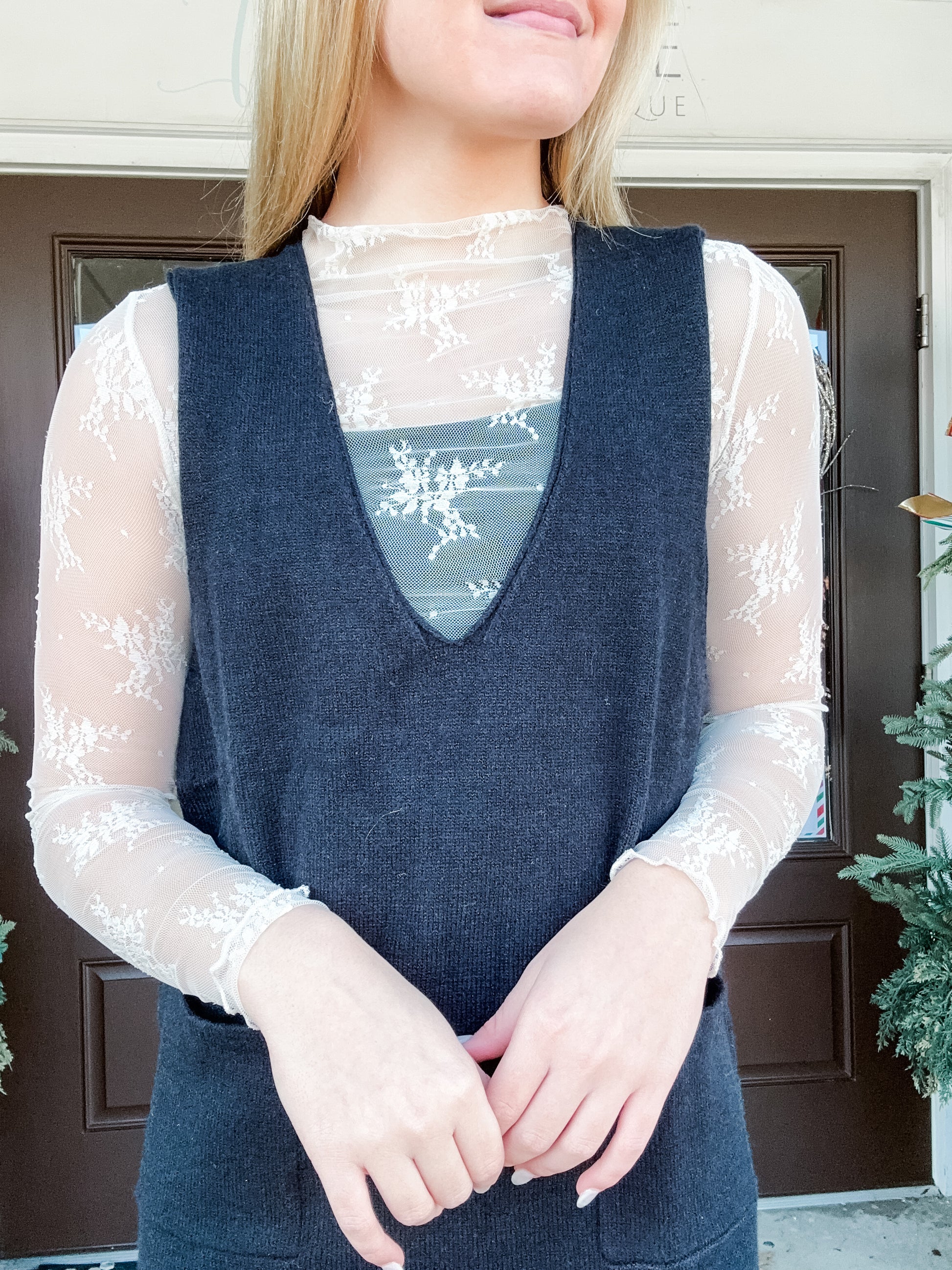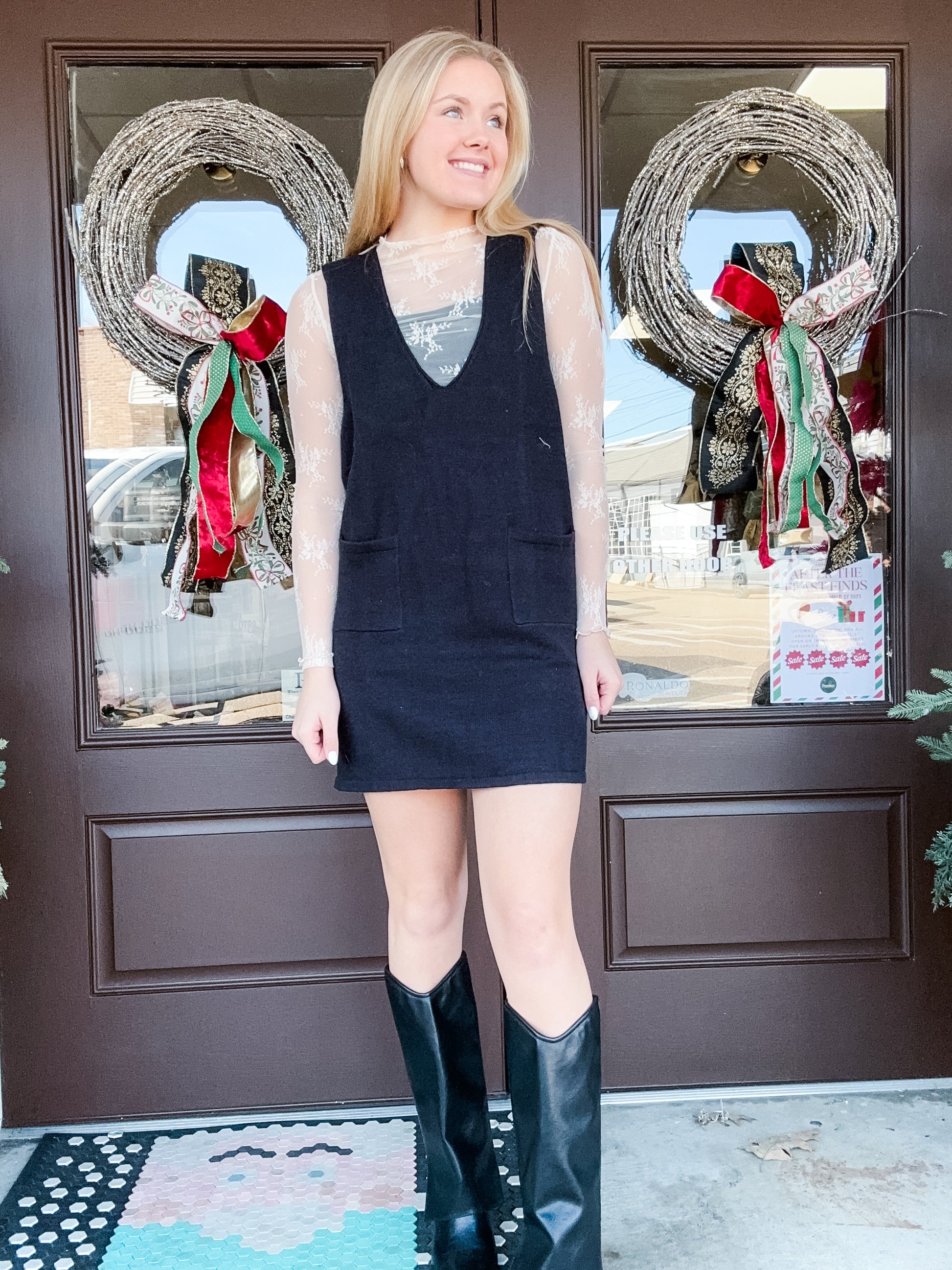 This sleeveless knit mini dress, Midnight Muse, offers a deep V-neckline and a relaxed fit that effortlessly complements your fall and winter wardrobe. With clean finishing touches and practical front patch pockets, it’s ideal for layering over fitted tops or turtlenecks. Its simple yet chic design makes it a versatile staple, perfect for creating stylish, cozy outfits throughout the colder seasons.