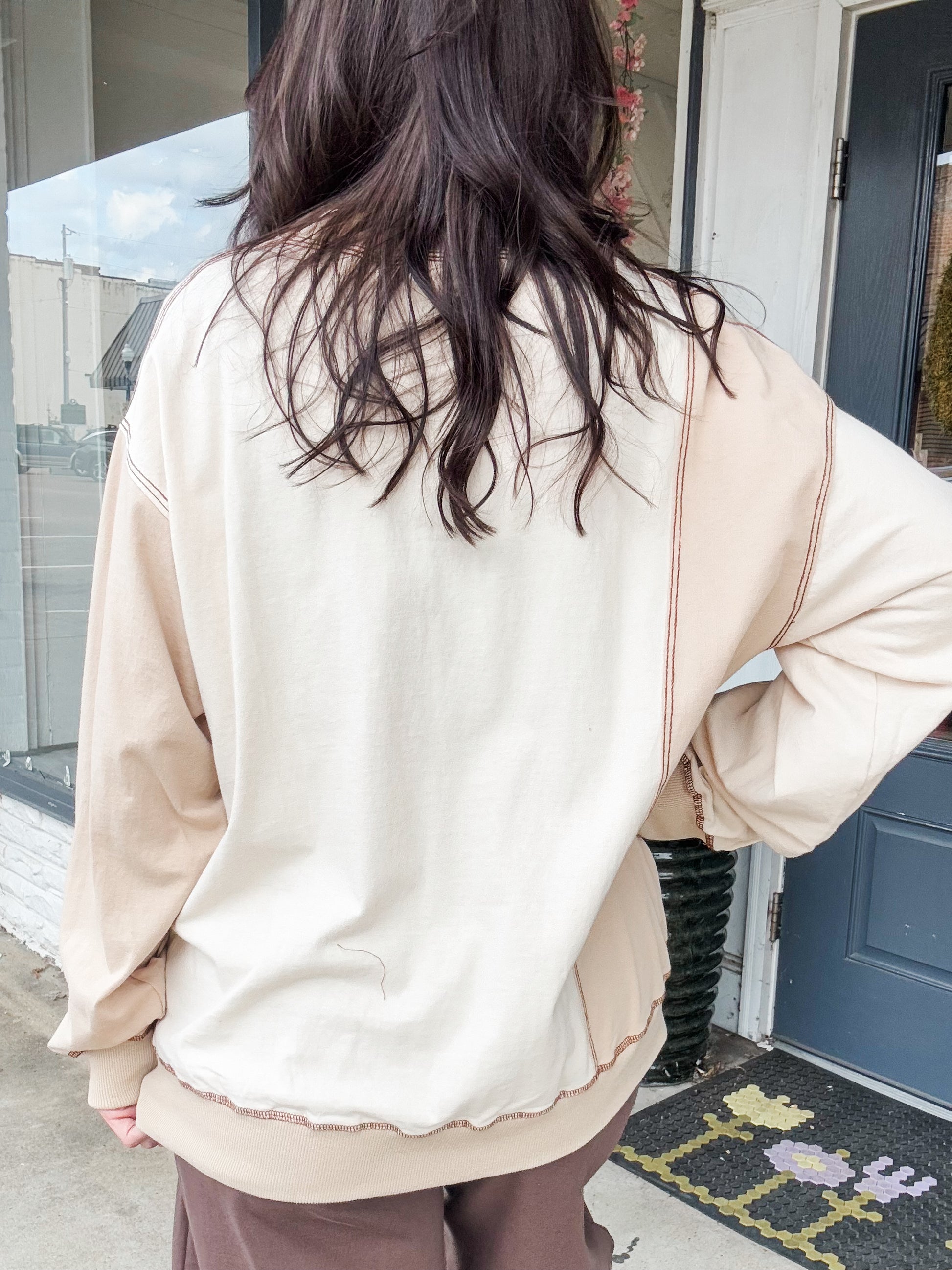 The Neil Colorblock Pullover top is...Knit Cotton Jersey, Crew Neck, Long Sleeve Loose Fit, Garment Washed Top With Contrast Stitch And Multi Colorblock in cream/mocha.