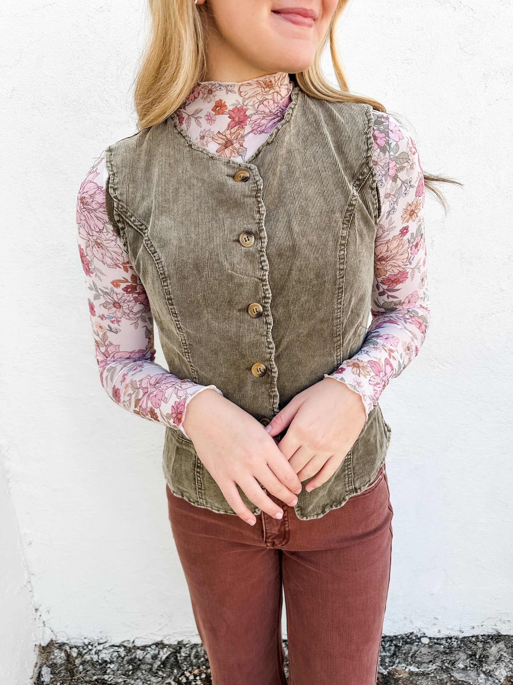 Elevate your everyday wardrobe with this charming olive washed corduroy vest top. The scallop edge detailing adds a playful, feminine touch, while the button-front design offers effortless styling versatility. Crafted from soft, textured corduroy, this piece layers beautifully over tees, tanks, or long-sleeve tops for season-spanning appeal. The relaxed fit ensures all-day comfort without sacrificing style. Perfect for casual outings or dressing up your favorite basics, this vest is the wardrobe essential you didn't know you needed.