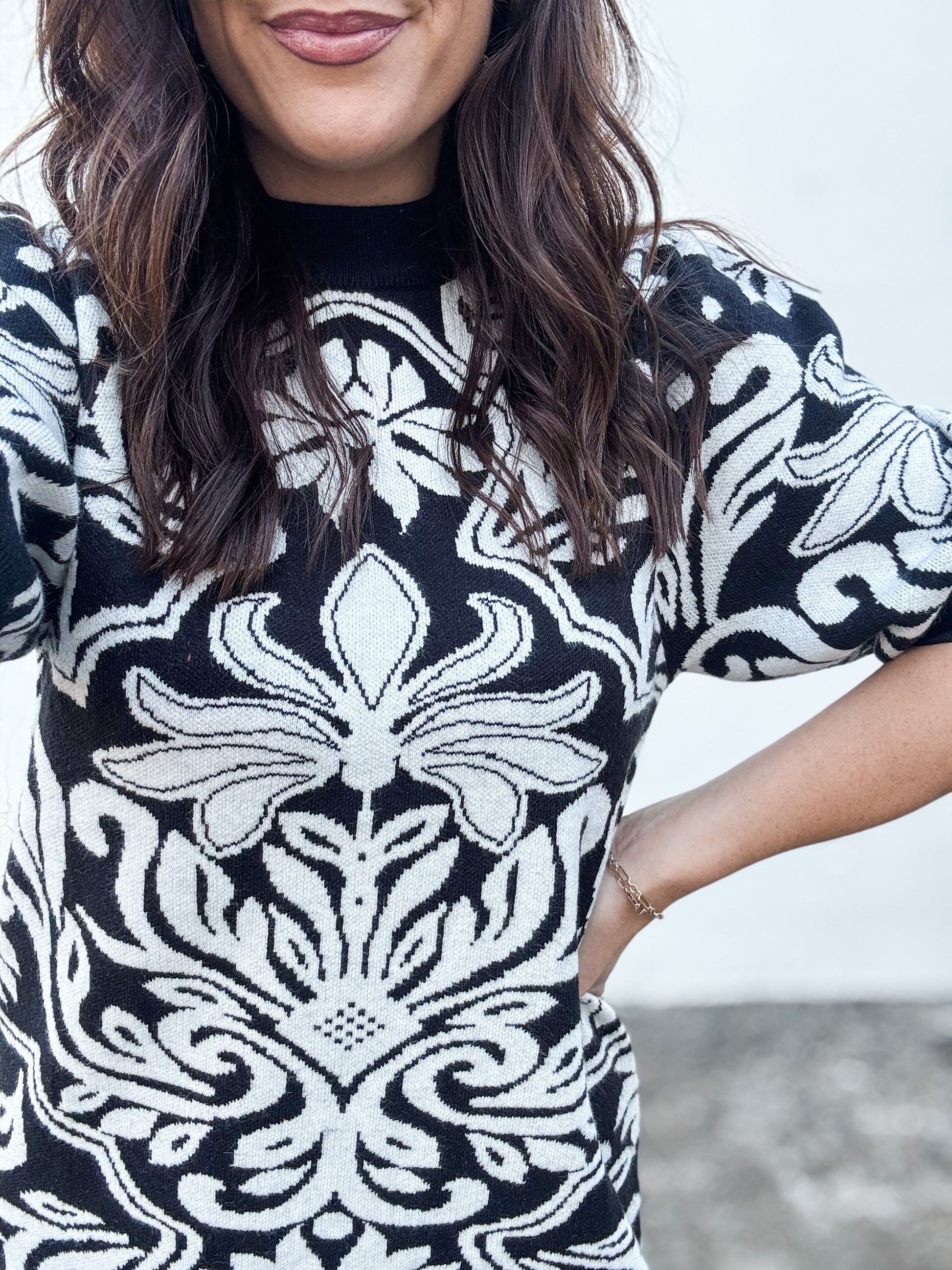 Make a bold statement with the Perfect Harmony Dress, featuring a striking black and white floral pattern that demands attention. Its contrasting black round neckline adds a daring edge, while the short sleeves keep it effortlessly chic. This dress blends classic motifs with a fearless twist, perfect for standing out with confidence.