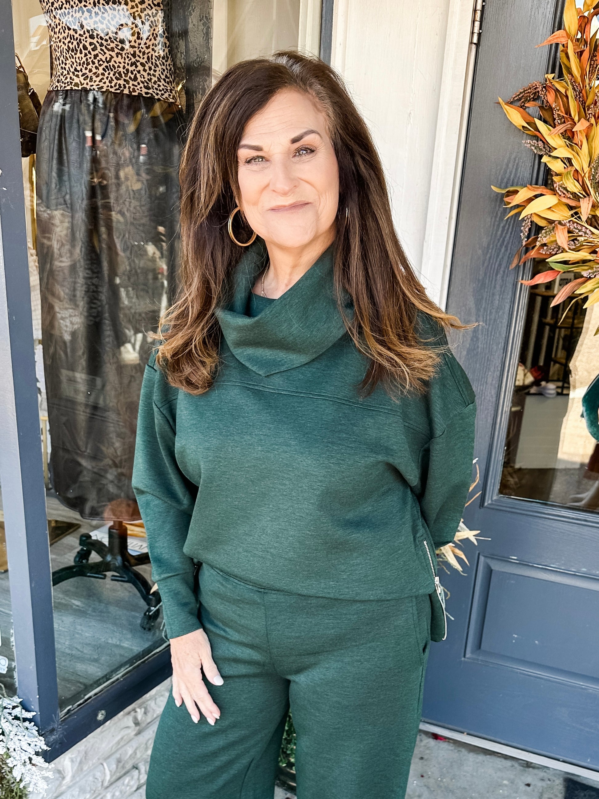 Embrace effortless layering with this forest green turtleneck that combines comfort with contemporary style. The loose, relaxed fit moves with you throughout your day, while quarter zips on the sides offer customizable ventilation and a modern silhouette. Long sleeves provide warmth and coverage, anchored by a banded bottom that keeps the piece polished and in place. Perfect for transitional weather or as a versatile base layer, this top delivers both functionality and understated sophistication that works with virtually any wardrobe.