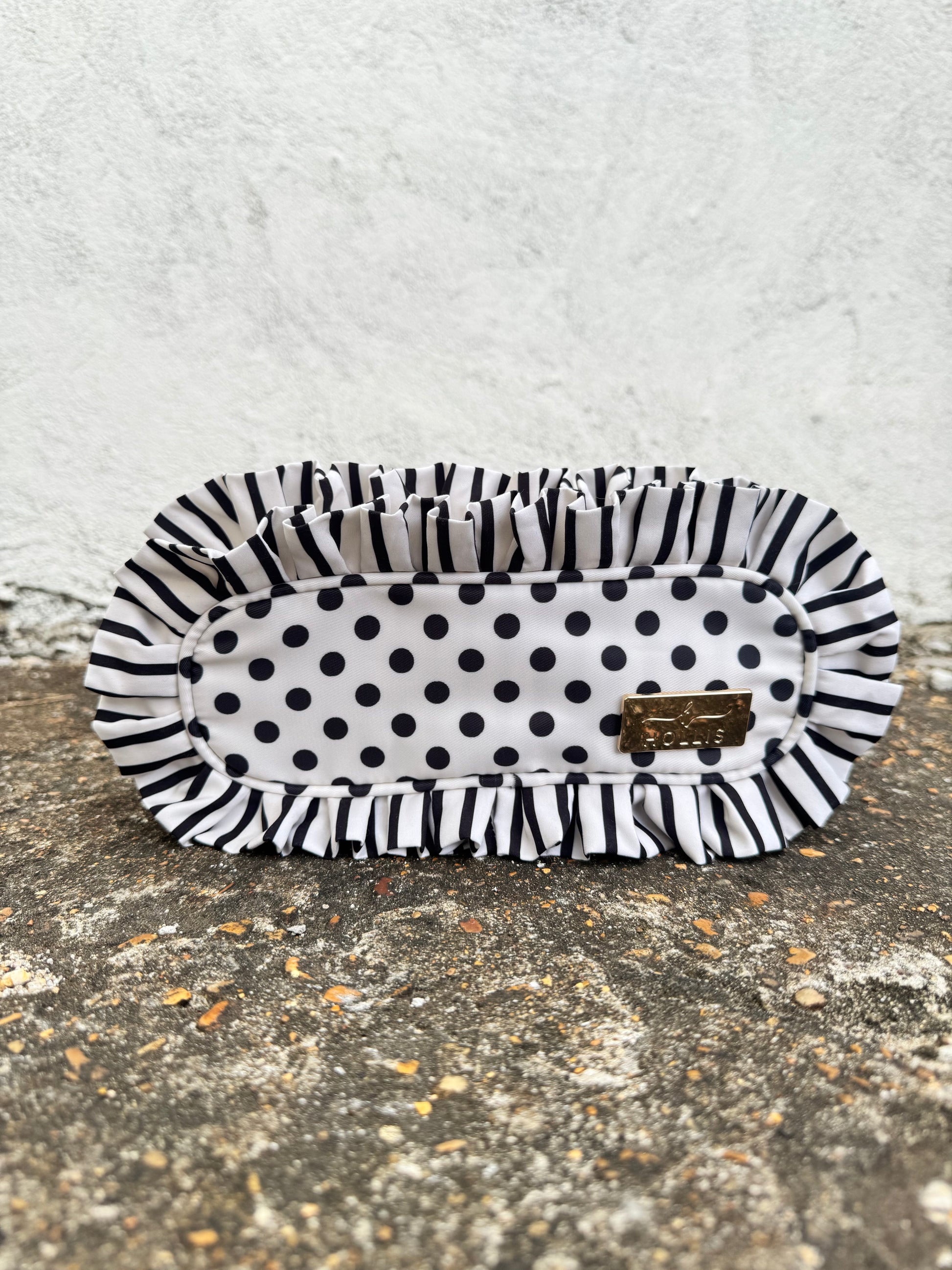 Elevate your organization game with the Polka Pencil Bag—where style meets practicality. Featuring our signature double ruffle trim and charming polka dot design, this compact pouch transforms everyday storage into a fashion statement. The durable, wipeable ruffled nylon construction keeps contents protected while the soft lining ensures effortless cleanup. At 8"x2"x3", it's perfectly sized for pens, cosmetics, tech accessories, and more. Whether you're heading to school, the office, or on an adventure, this chic essential keeps your small items organized and accessible. Make the smart choice for style-conscious organization.