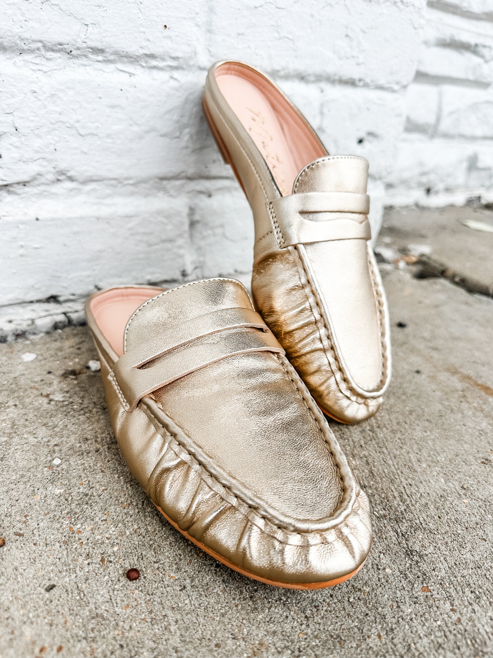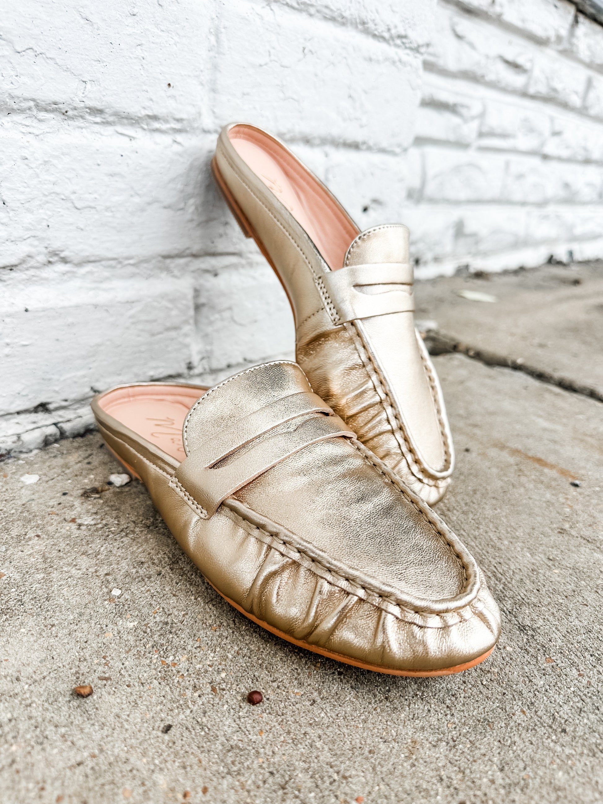 Step into style and comfort with the Porta slip-on loafer, featuring supple metallic gold leather that shines with every step. This mule-style shoe is designed for easy wear and smooth transitions, making it your go-to choice for effortlessly elevating any look.