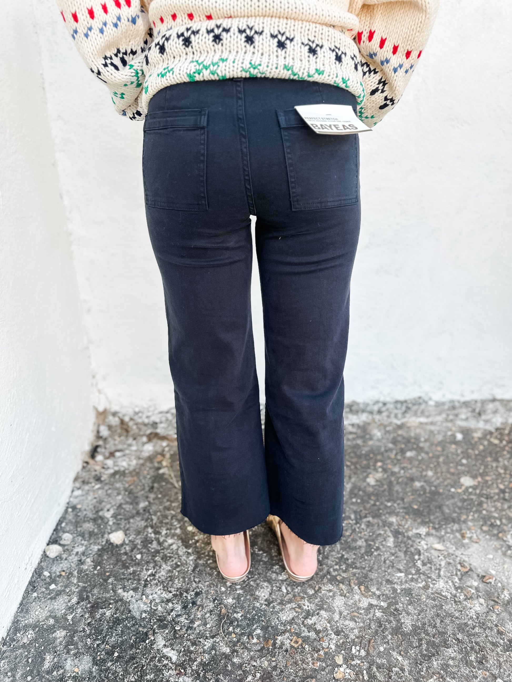 Experience the perfect blend of style and comfort with our Regan High Rise Black Jeans. Crafted from super stretch twill, these jeans offer a flattering high-rise waist and a sleek silhouette. Featuring four pockets, double welt pockets, and a zipper fly, they combine practical details with modern design elements like seam and dart accents. The garment-dyed fabric and raw hem add an edgy, lived-in look that pairs effortlessly with any outfit. Elevate your wardrobe with these versatile twill pants that move with you all day long.