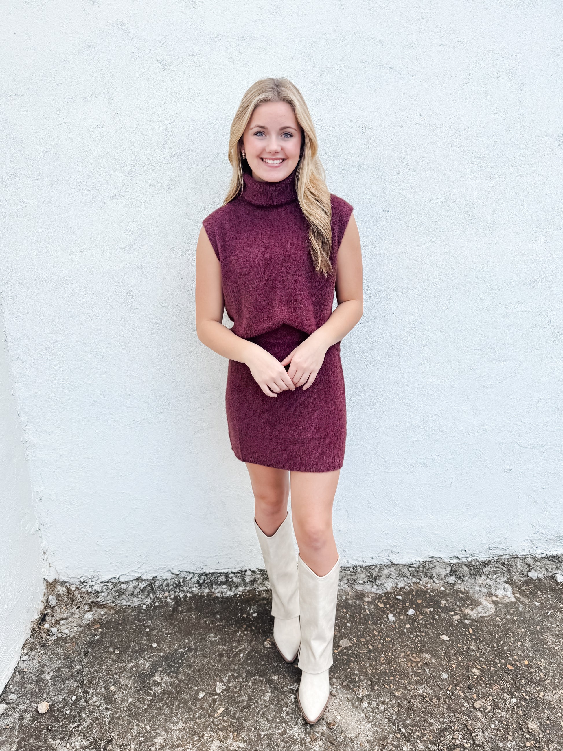 Elevate your everyday style with this chic maroon set that effortlessly combines comfort and sophistication. The loose-fitting sleeveless turtleneck pairs perfectly with a coordinating skirt, creating a versatile look that transitions seamlessly from casual outings to polished occasions. The relaxed silhouette flatters all body types while the rich maroon hue adds depth and elegance to your wardrobe. Mix and match these pieces with your favorite accessories for endless styling possibilities. A wardrobe essential that delivers both confidence and timeless appeal.