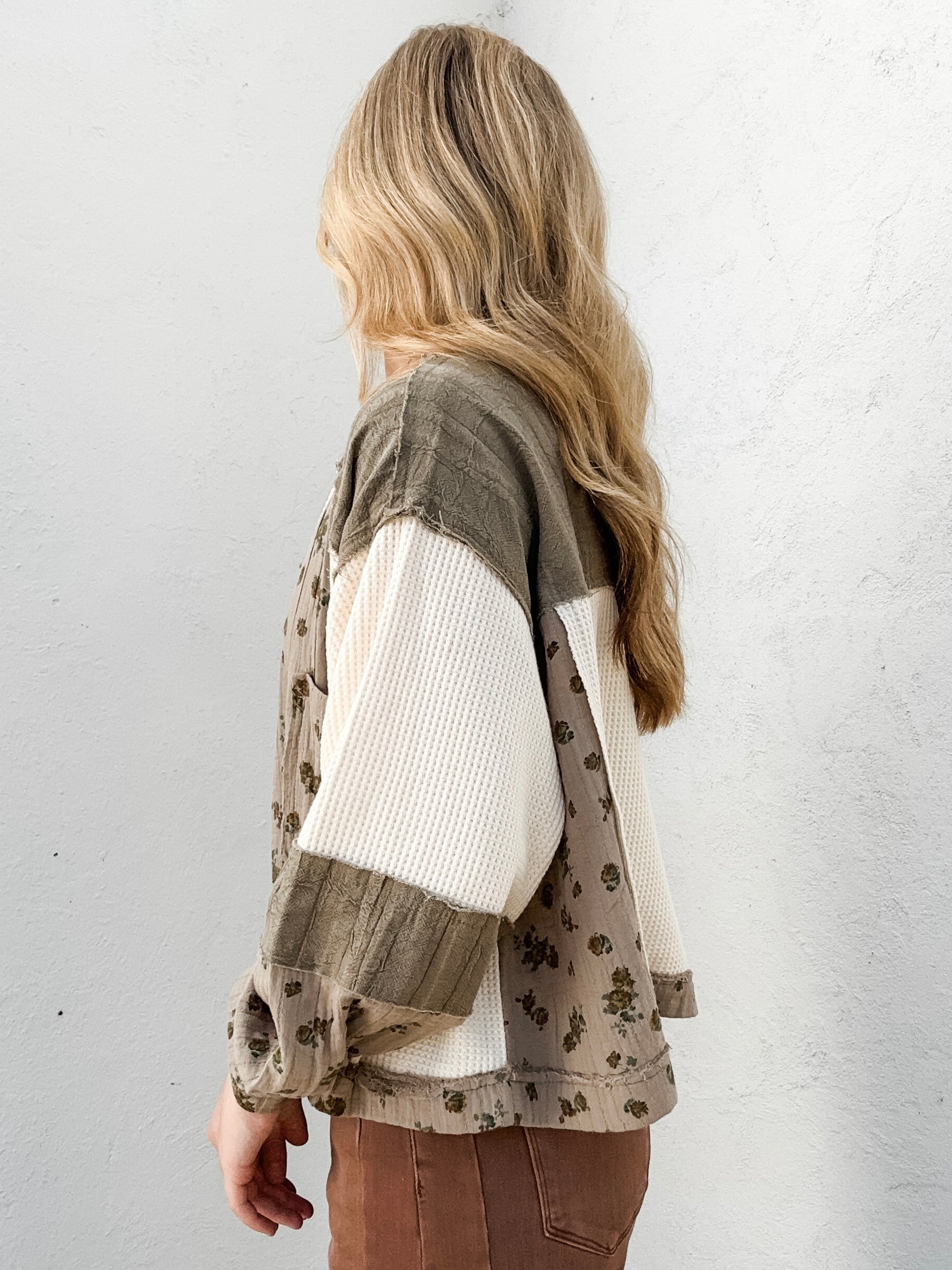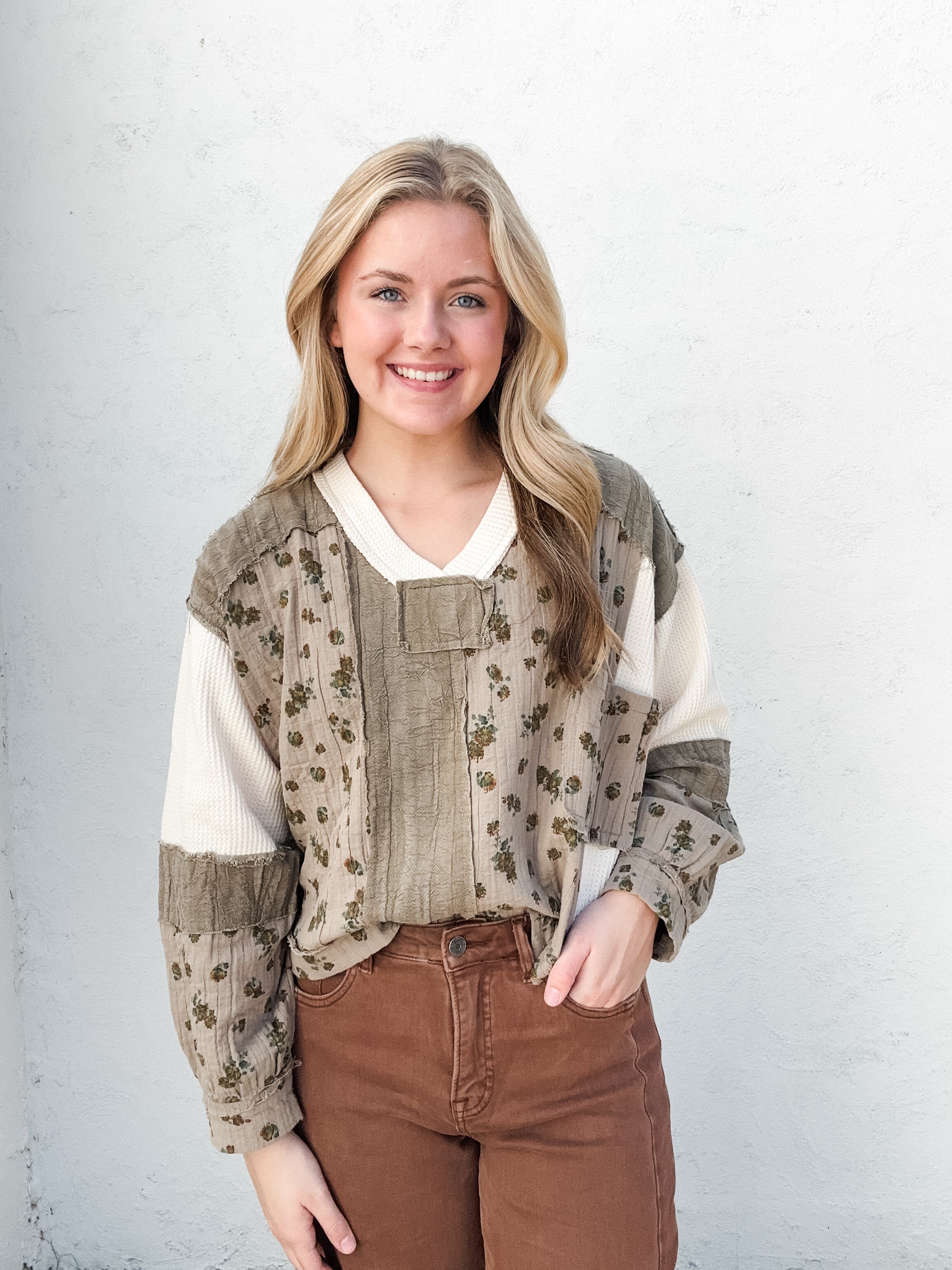 Effortlessly chic and undeniably comfortable, this oversized V-neck top features romantic balloon sleeves that make a statement. Crafted from soft printed double gauze with textured woven contrast details, it drapes beautifully on any frame. The olive and cream palette brings natural warmth to your everyday wardrobe, while the relaxed fit ensures all-day ease. Perfect for layering or wearing solo, this versatile piece transitions seamlessly from casual outings to relaxed gatherings. Elevate your style with understated sophistication.