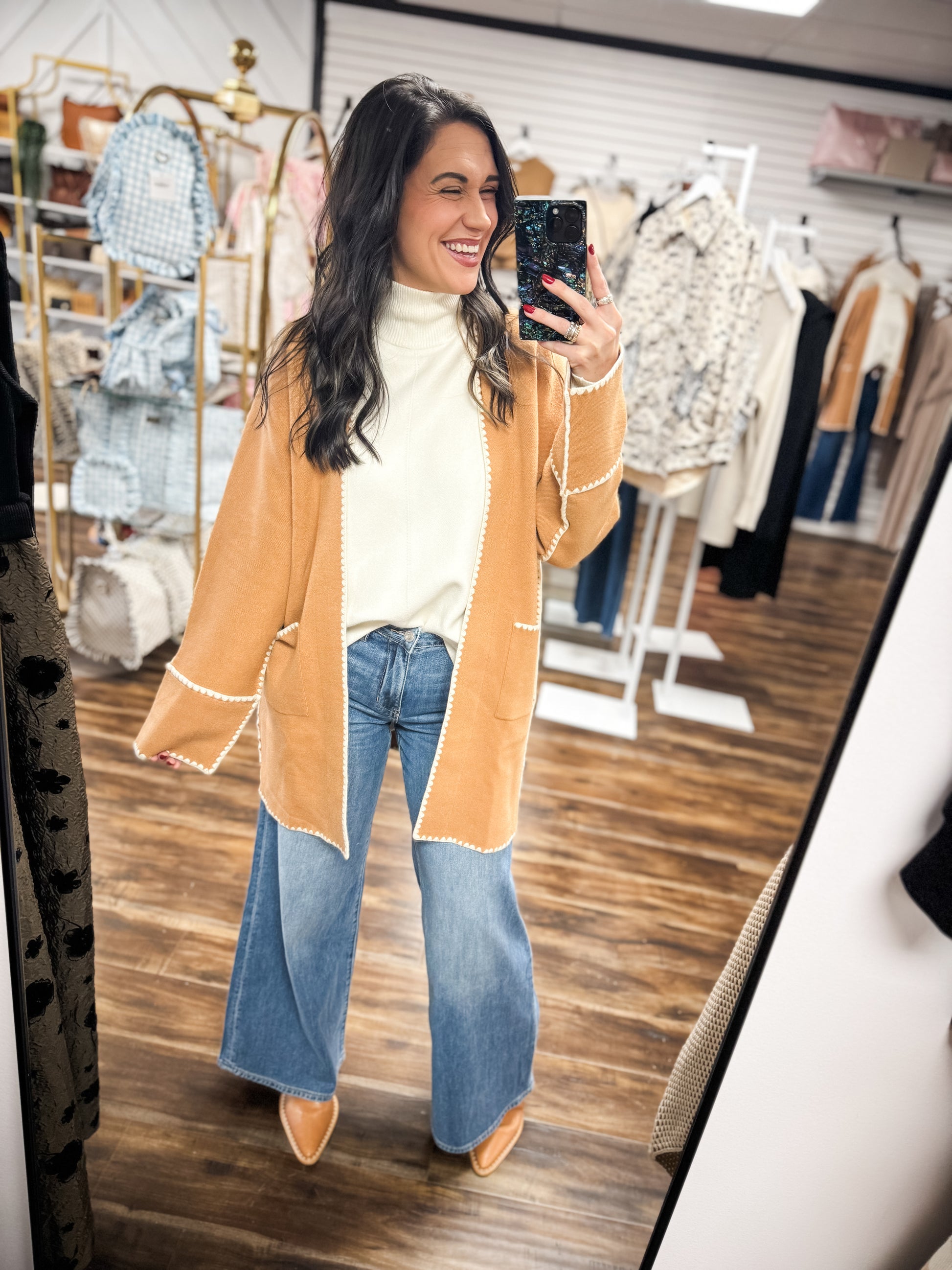 Experience cozy elegance with this camel-colored long sleeve midi cardigan. Crafted from super soft fabric, it offers gentle warmth and comfort all day. Cream contrast detailing around the edges and down the shoulders adds stylish definition, while convenient front pockets provide practicality without sacrificing style. Perfect for layering, this cardigan combines sophistication and comfort effortlessly.