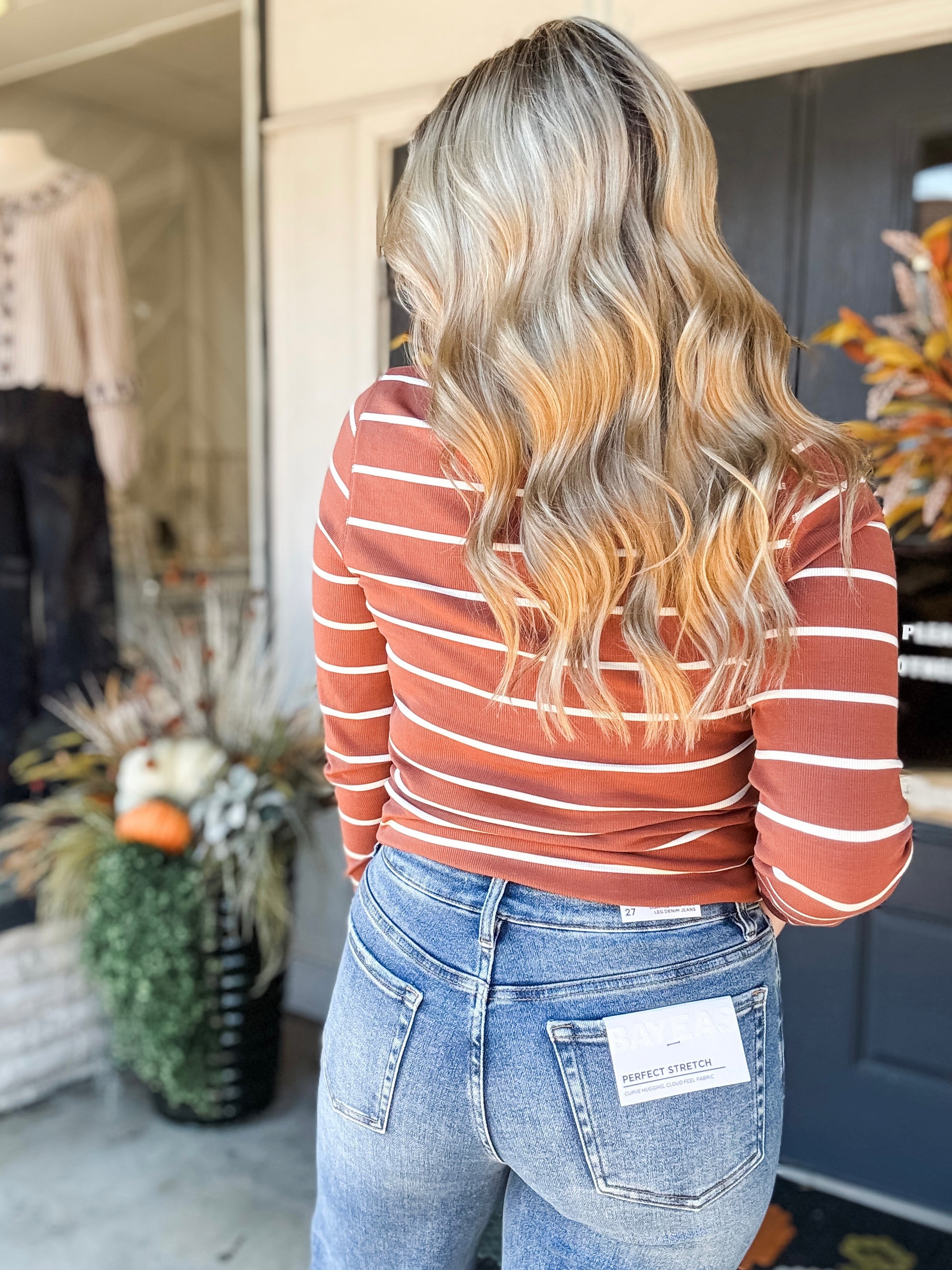 The Stacy Top features a flattering brown and white stripe pattern with a love sleeve design that adds a subtle charm. Made from stretchy fabric, it ensures all-day comfort and ease of movement. Its round neck offers a classic, versatile look perfect for any casual occasion. Elevate your wardrobe with this stylish and comfortable essential.