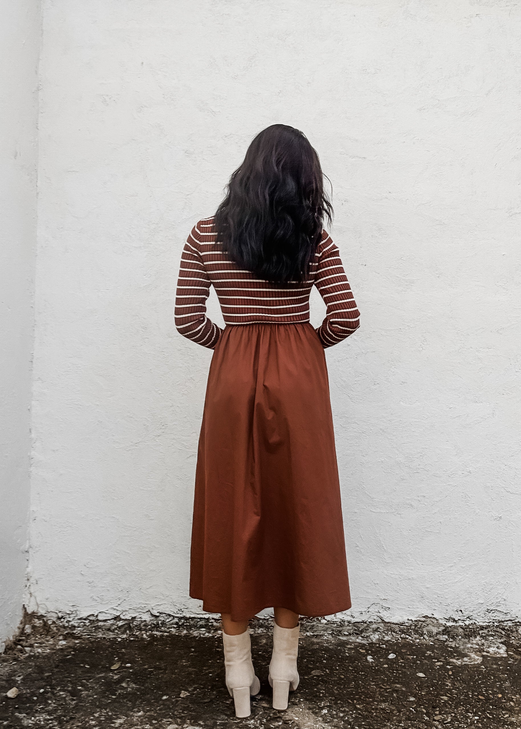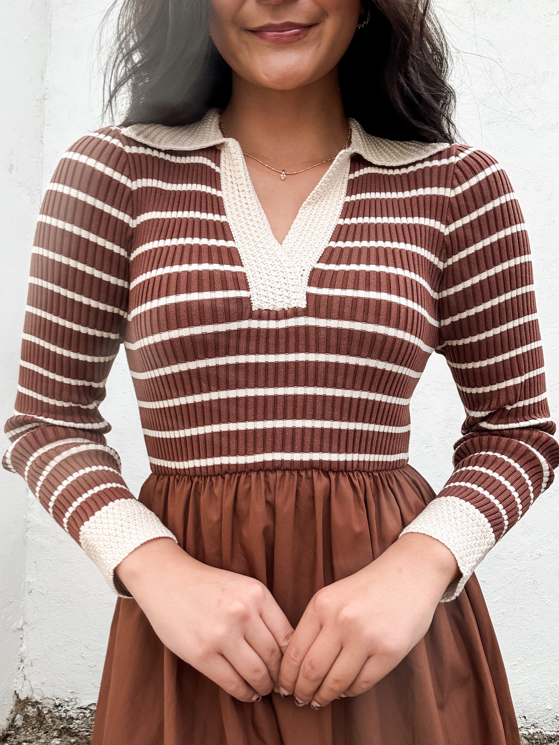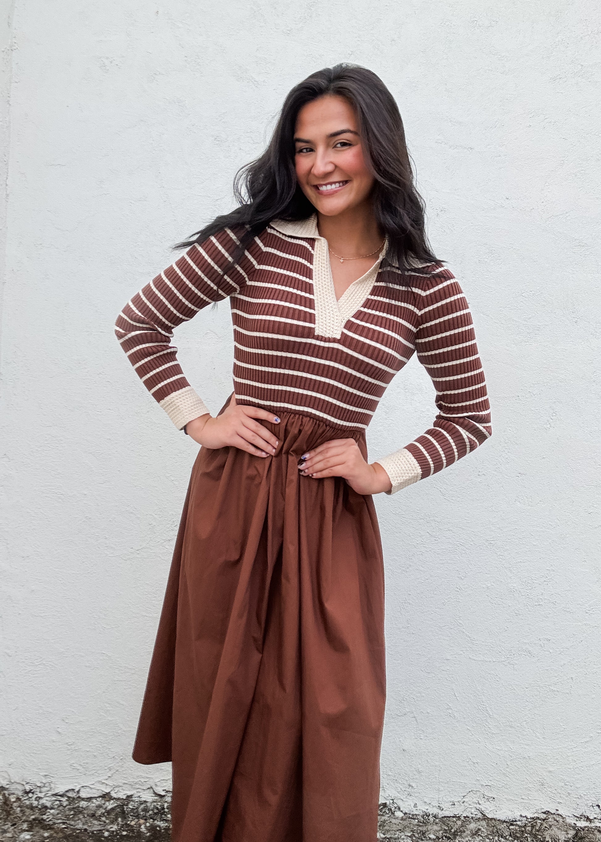 The Sweet Cocoa Dress features a charming brown and cream striped top with a delicate V-neck and crochet collar, adding a touch of elegance to your look. The solid brown midi skirt gently gathers at the waist with elastic for a comfortable, flattering fit. Perfect for day-to-night wear, this dress blends cozy style with effortless sophistication.