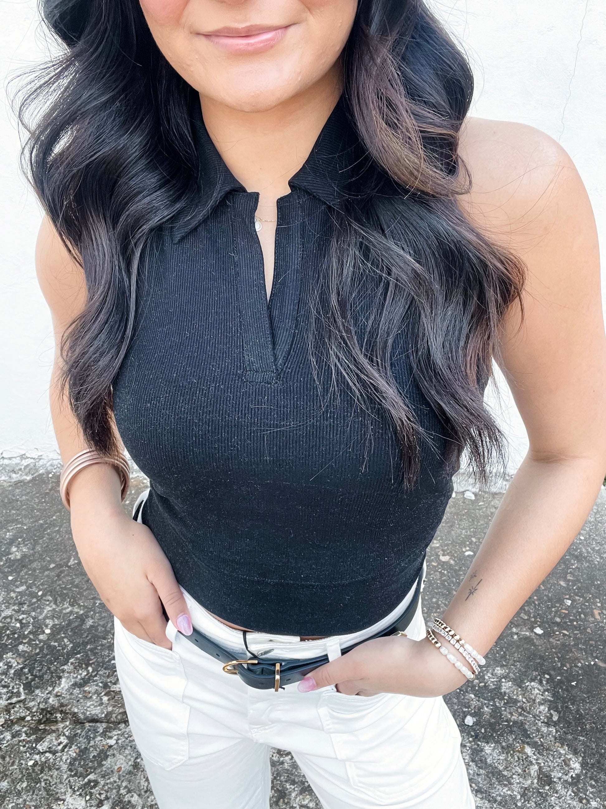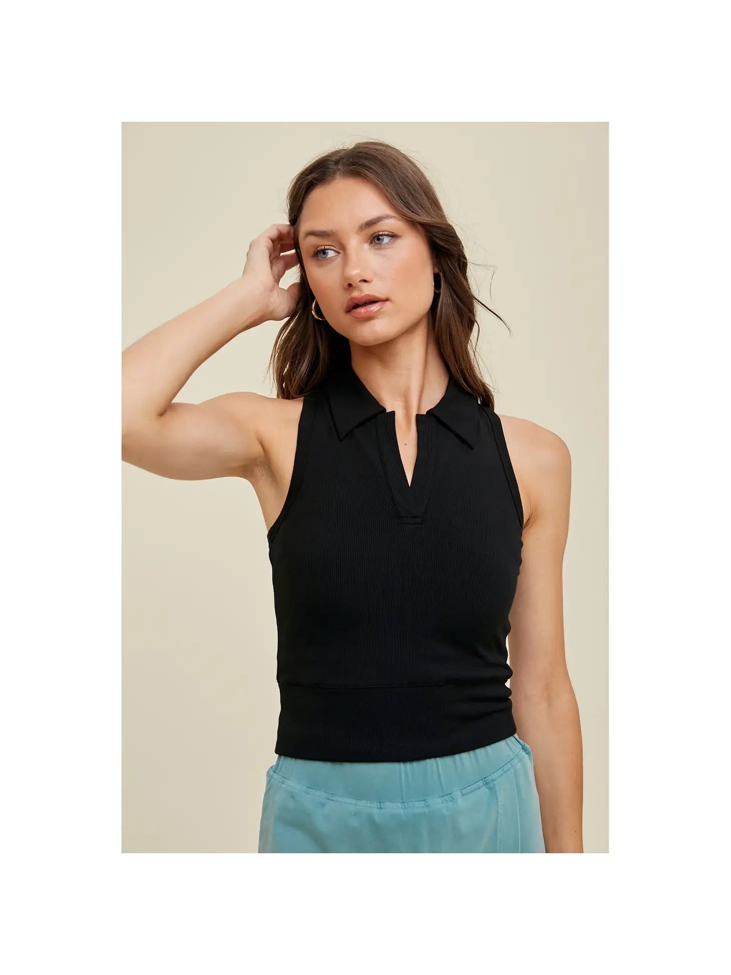 The Tanked Up Top is a ribbed, collared, relaxed crop tank. This have-to-have-it piece is padded with removable bra pads. This tank comes in black and shell colors.