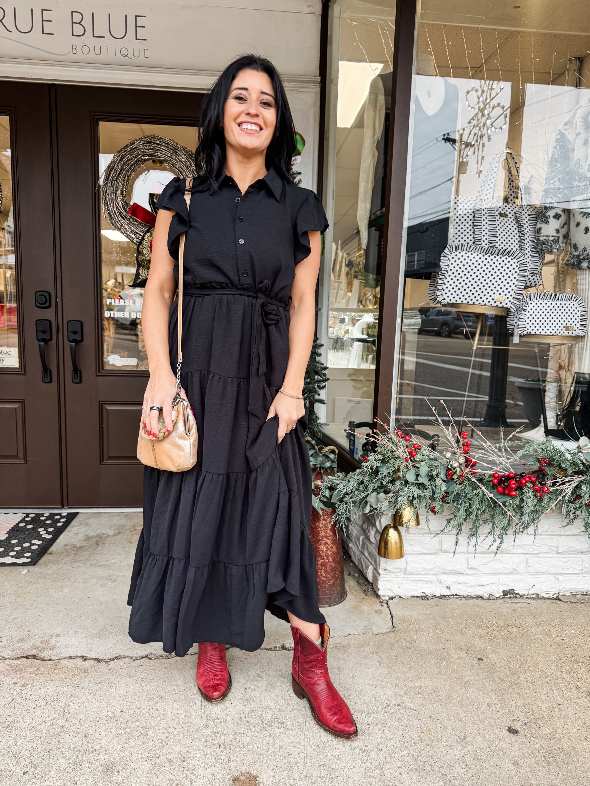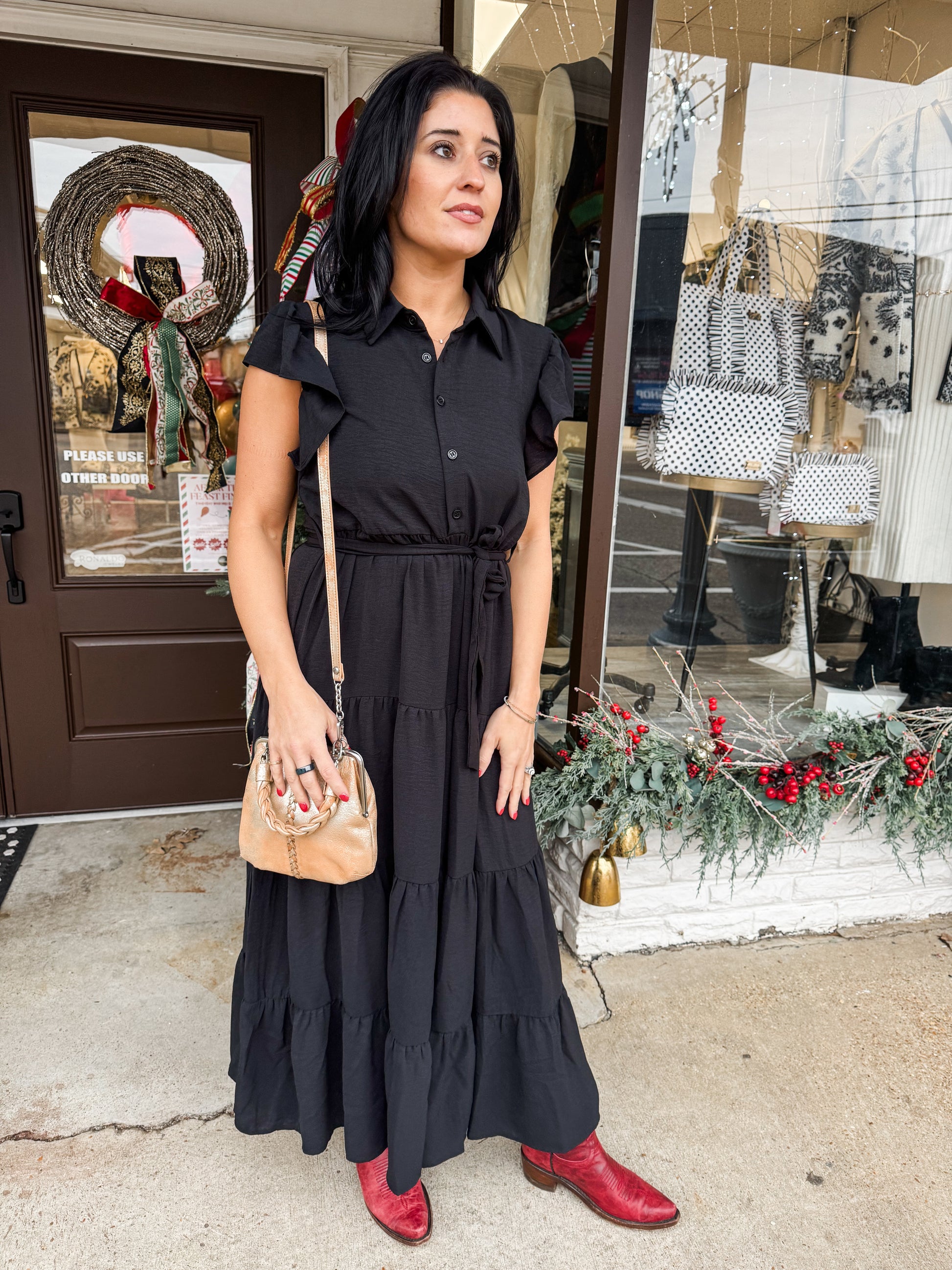 Maxi length dress with tiered skirt, natural waist with tie detail, button detail with ruffle sleeve.