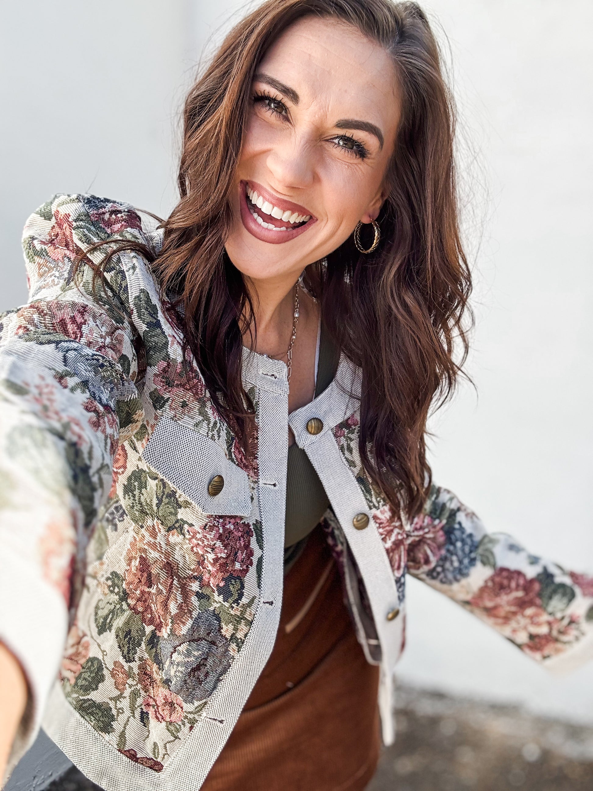 The Jackie Jacket combines elegant flower jacquard fabric with solid woven contrast details for a chic, refined look. Featuring brass buttons, a round neck, and a relaxed fit, it’s perfect for effortless layering. Contrasting cuffs, collar, and front placket add stylish accents, while side pockets and faux front flap pockets provide practical convenience. Elevate your wardrobe with this versatile button-down jacket designed to bring both comfort and sophistication to every outfit.