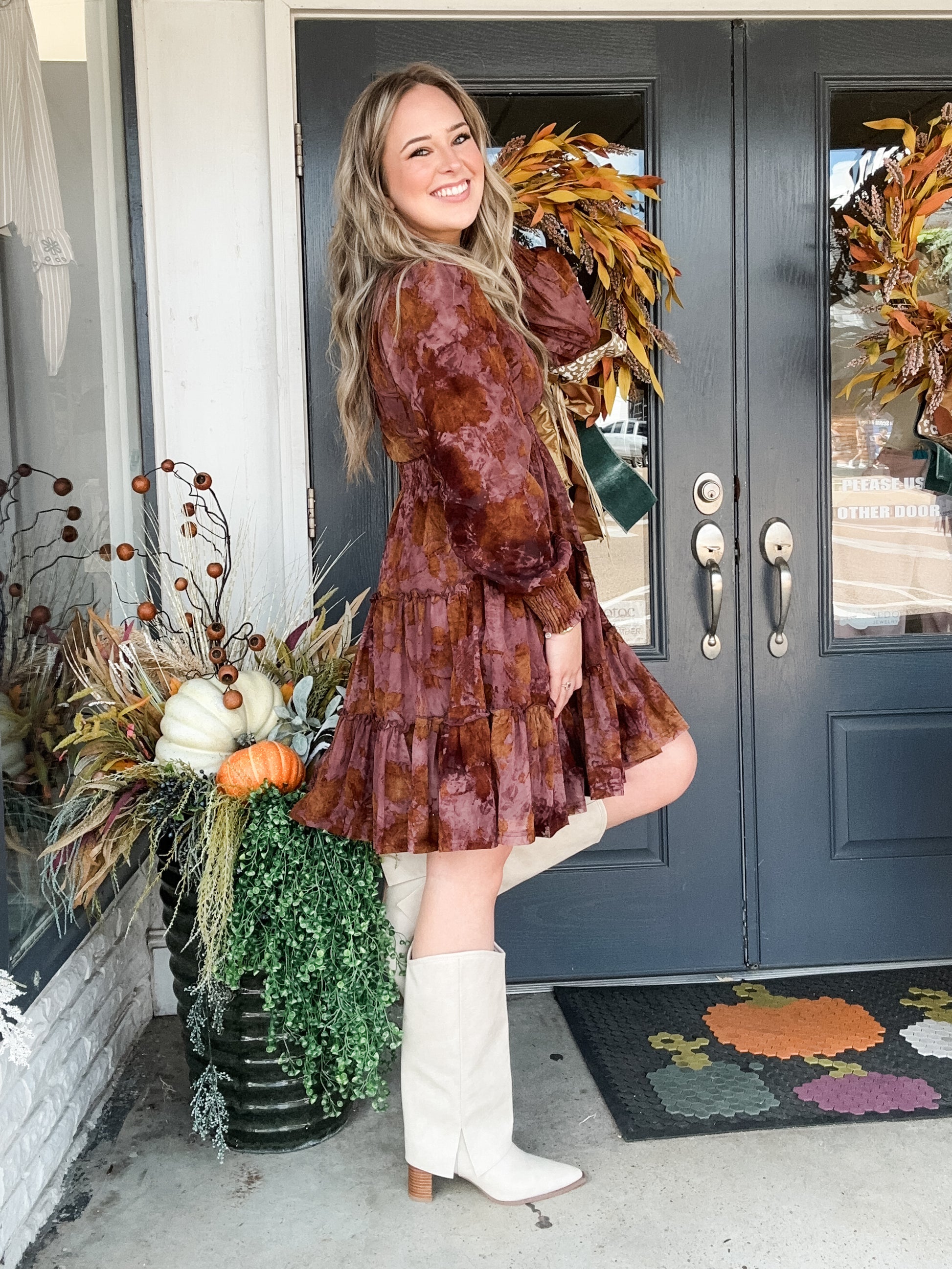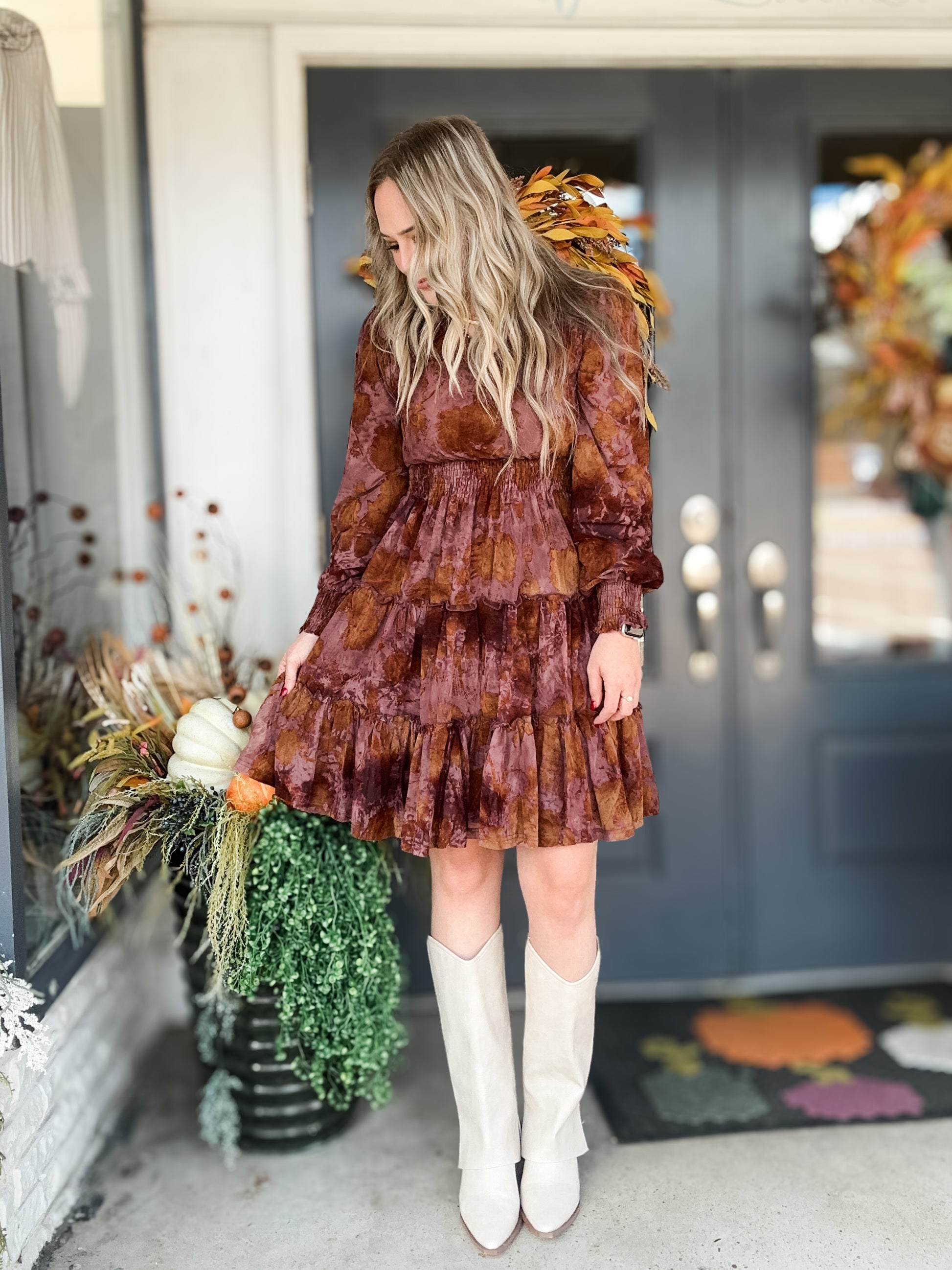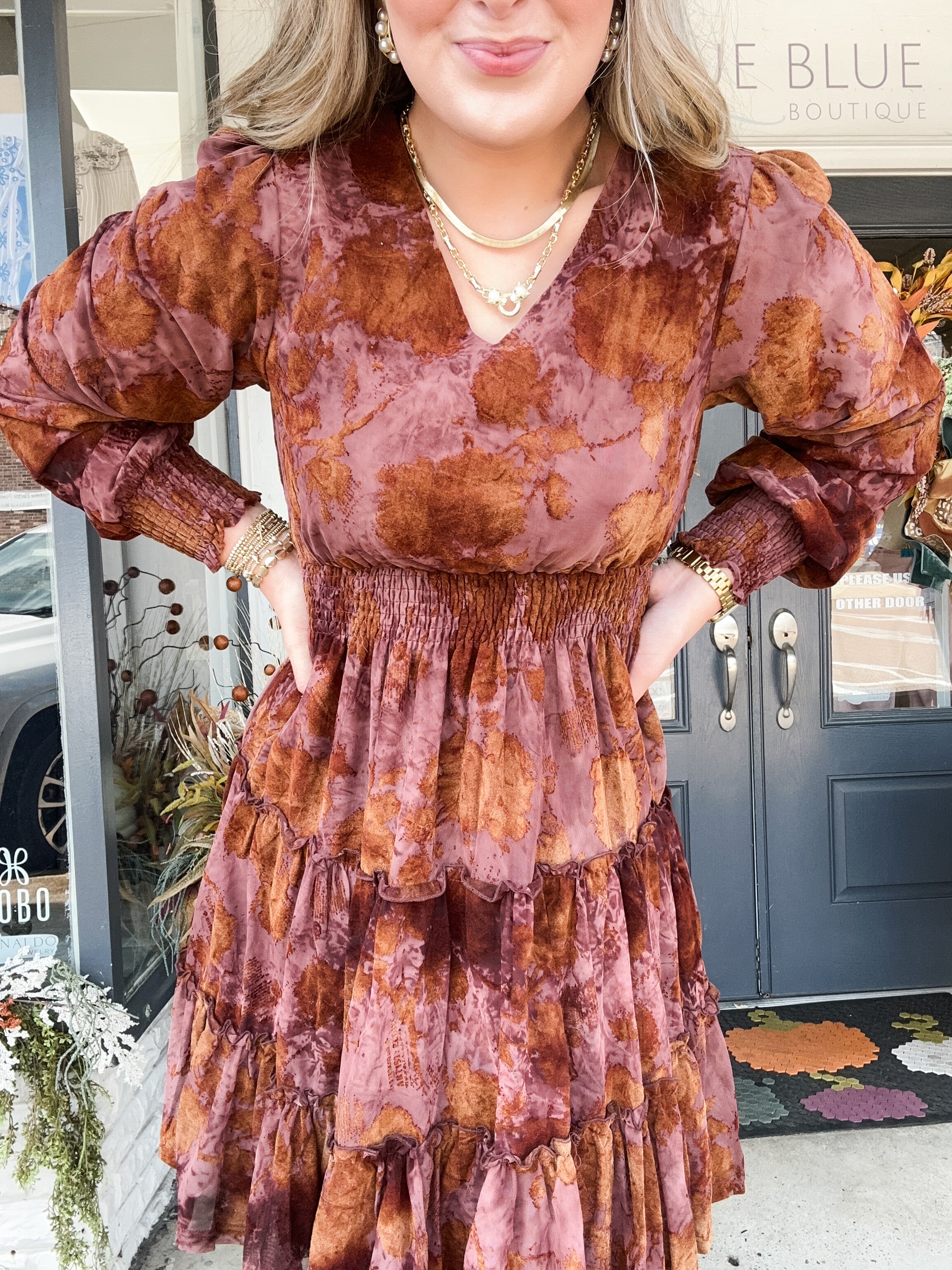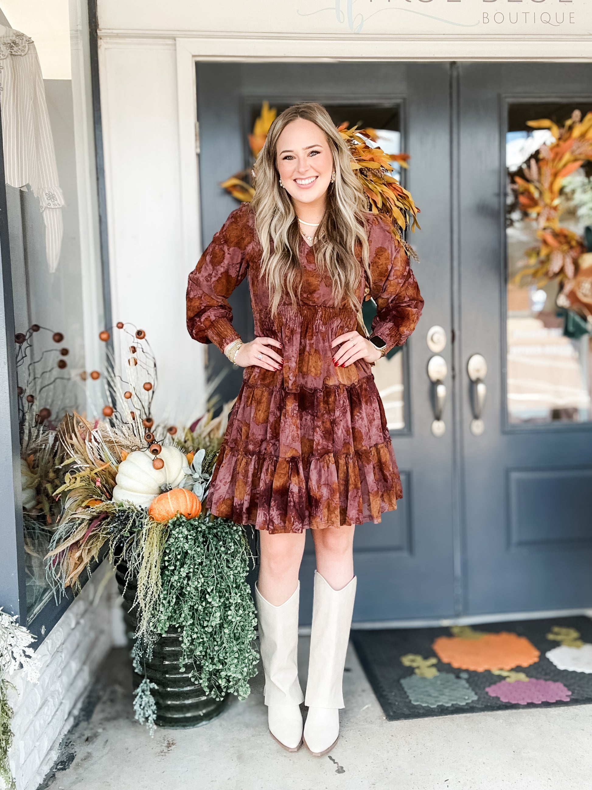 Embrace elegance with The Opal in Hazel Flora, featuring a flattering V-neck and a comfortable elastic waist for a perfect fit. The rich burgundy fabric is adorned with a golden rust floral raised design, adding texture and sophistication. Fully lined for comfort, it includes elastic cuffs and charming two-tier ruffles that enhance movement and style. This dress seamlessly combines comfort and refined details to elevate your wardrobe.
