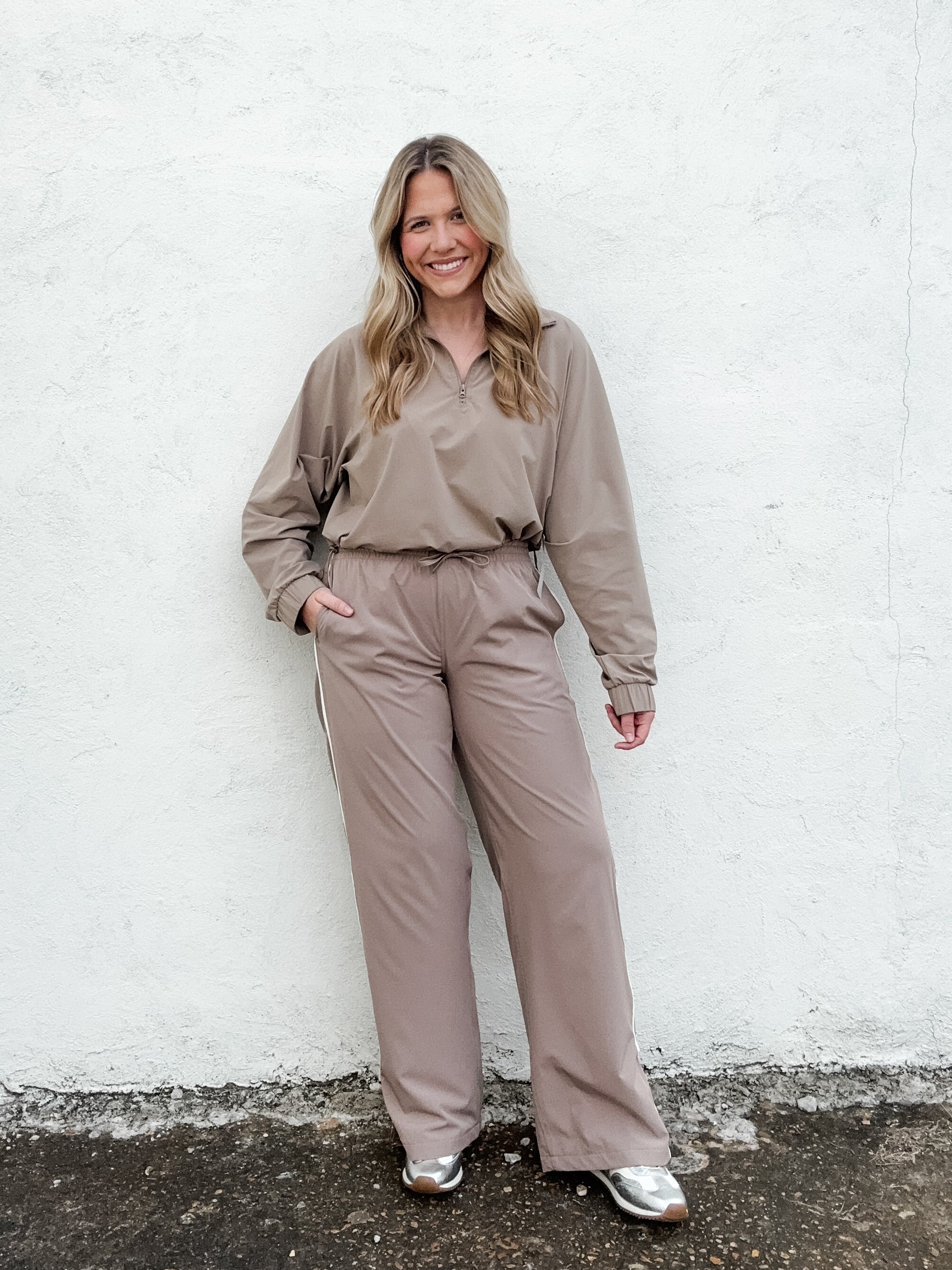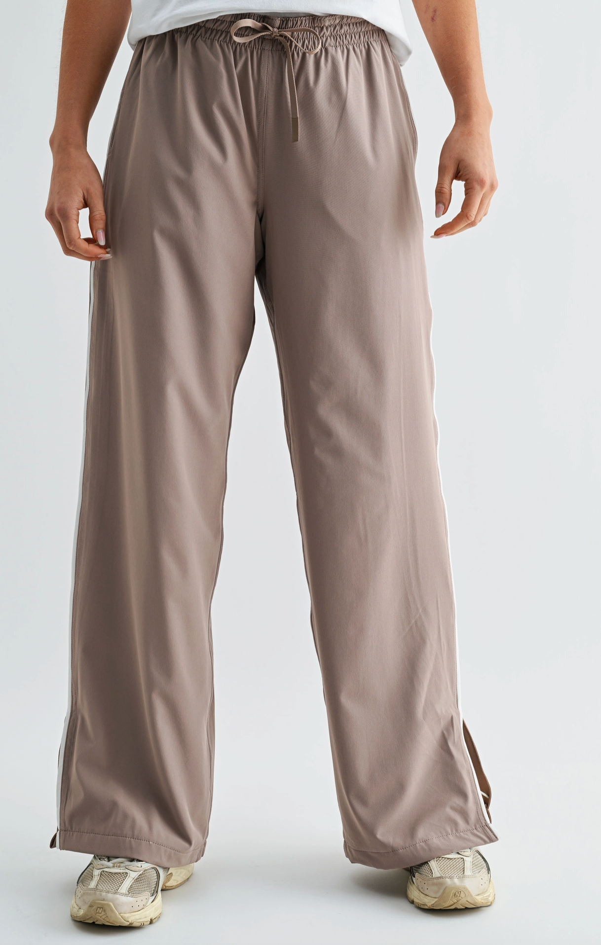 Elevate your casual wardrobe with Track Star Pants in a versatile mocha hue. These everyday track pants feature a sleek straight-leg silhouette that transitions seamlessly from gym to street. The drawstring waist ensures a customizable fit, while sporty piping details add contemporary flair. Practical side pockets keep essentials within reach, and subtle hem slits provide freedom of movement without compromising style. Crafted from a durable polyester-spandex blend, these pants offer the comfort and flexibility you need for all-day wear. Perfect for anyone seeking effortless style with functional design.