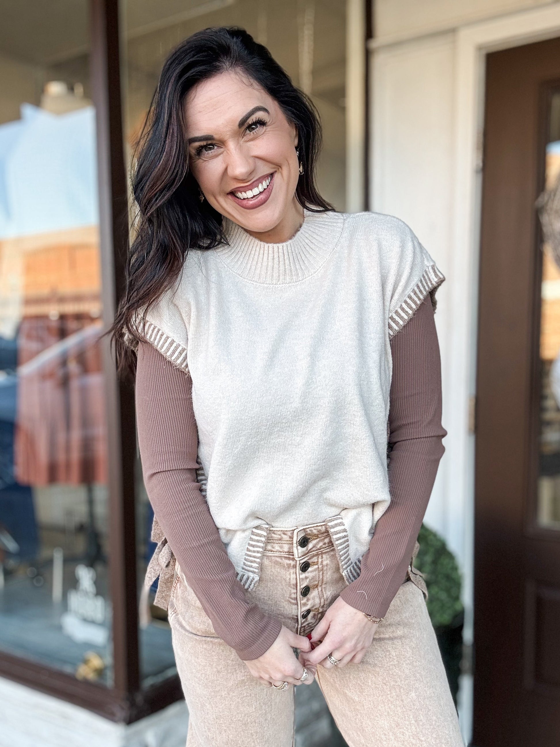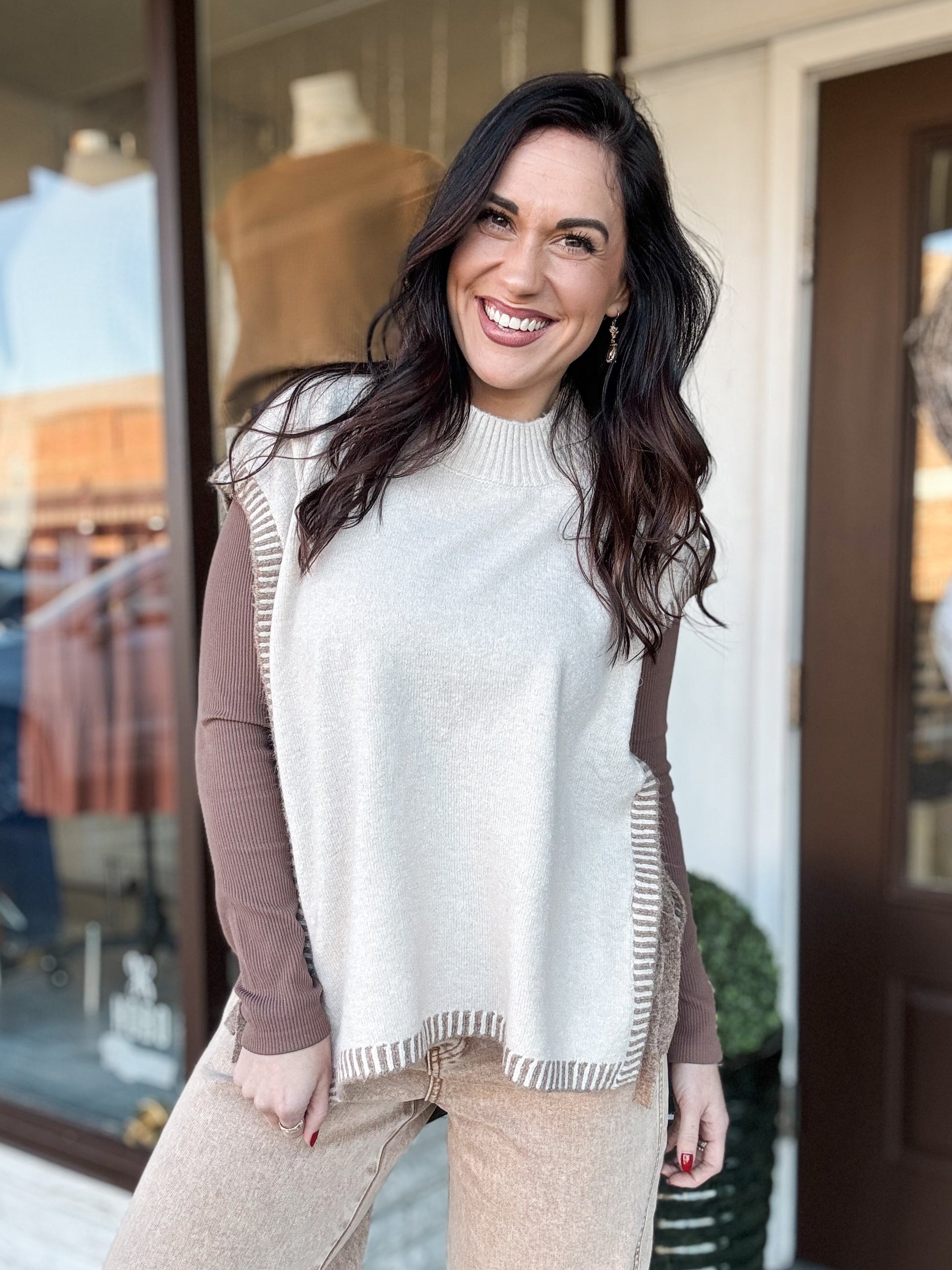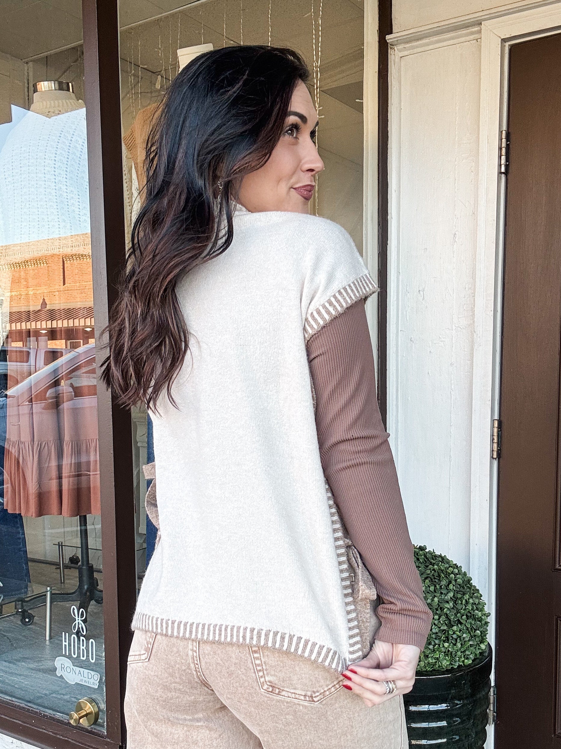 Elevate your layering game with the Vested Up Vest, a sophisticated piece that combines timeless style with modern versatility. This bone-colored vest features striking camel contrast panels along the sides and coordinating ties that frame your silhouette beautifully. The open design on both sides allows for effortless styling over any outfit, while dual sets of camel ties let you customize the fit and look to match your mood. Perfect for adding dimension to casual wear or polishing up your professional wardrobe, this vest is the layering essential you've been waiting for.