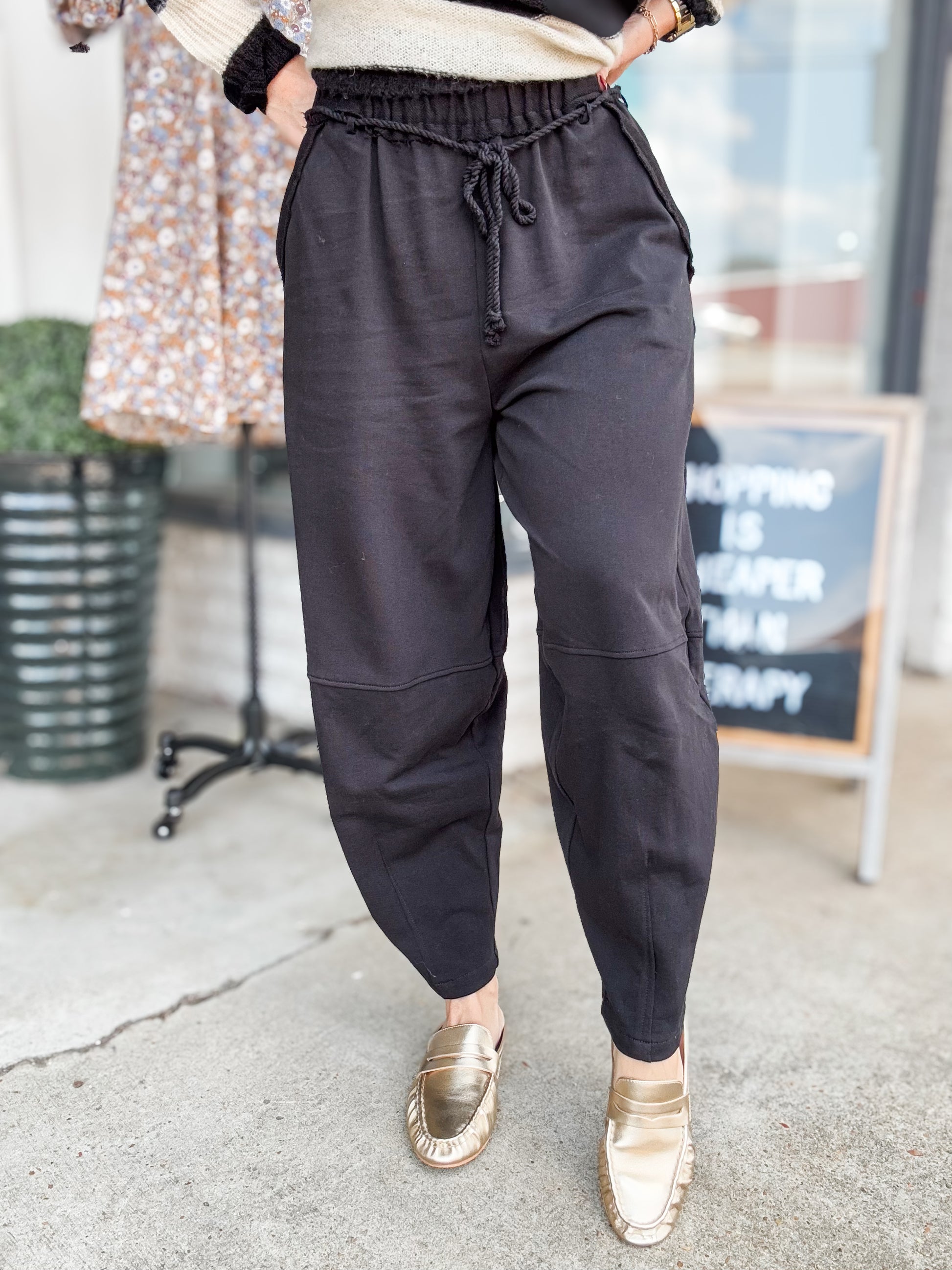 These Walk About Pants blend comfort and style effortlessly. Featuring a flexible elastic waist and a braided rope belt, they offer a customizable fit all day long. Practical side pockets keep essentials close, while the sleek black color ensures versatile wear from casual outings to relaxed weekends. Perfect for those seeking easy-to-wear pants with a unique, laid-back edge.