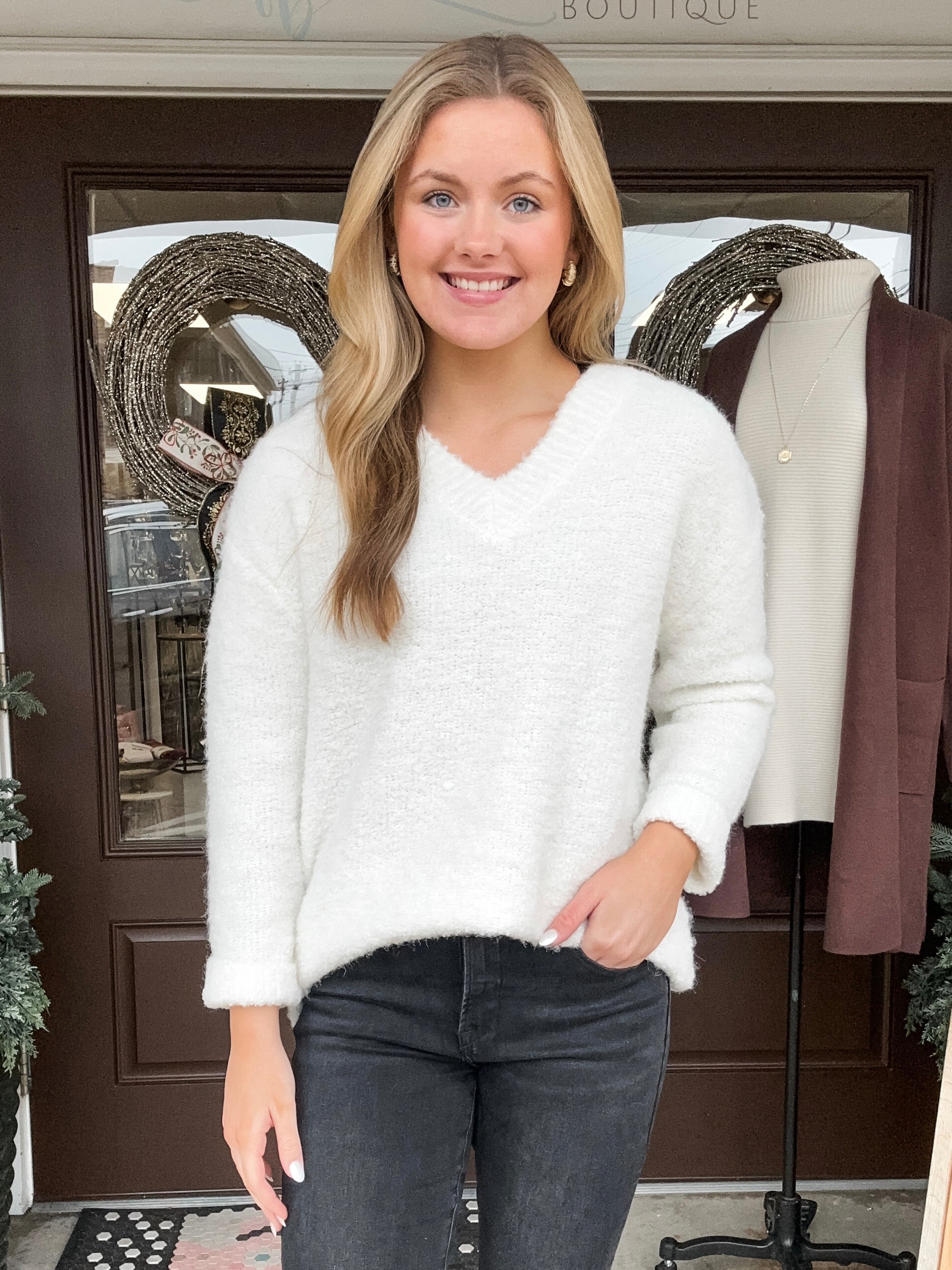 Wrap yourself in style and comfort with our Warm Wishes White Sweater. Its long sleeves will keep you cozy while its v-neck adds a touch of elegance. Made from soft white fabric, this sweater is perfect for any occasion. Elevate your wardrobe with this must-have item!