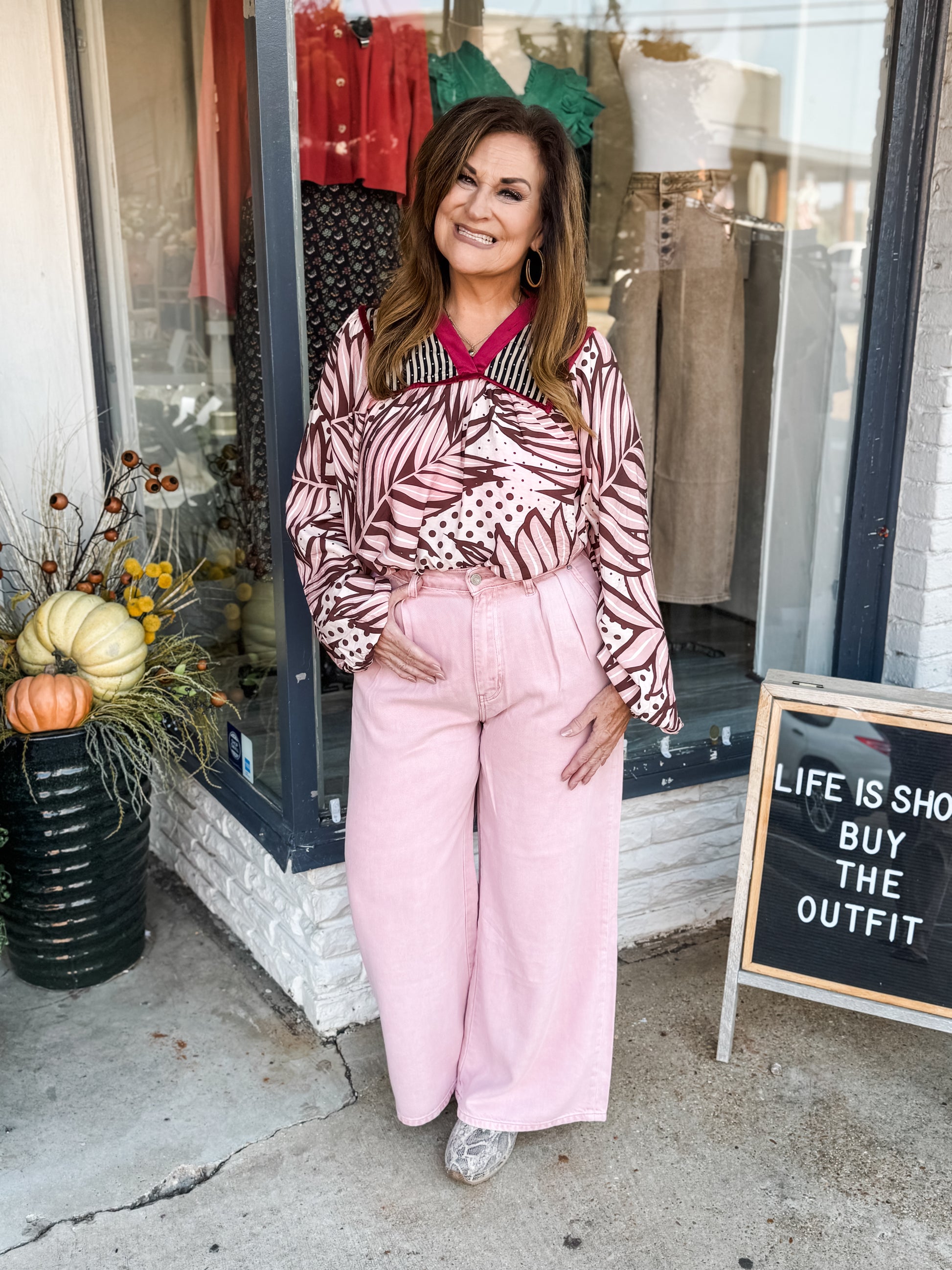 The Wonka Blouse boldly blends textures and colors for a striking look. Featuring a soft cranberry corduroy-trimmed V-neck and a ruffled collar, it fuses a bodice in rich pink and chocolate hues with a tan and black star-speckled top. This daring mix of fabrics creates an unforgettable style statement that sets you apart with playful sophistication.